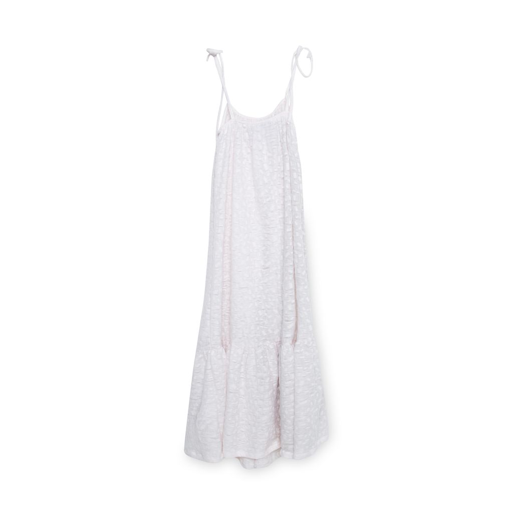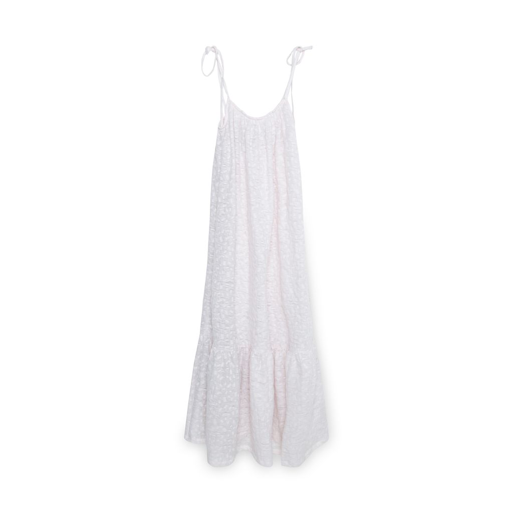 Damson Madder Pink Tiered Dress features knit tie straps, tiered bottom, and loose fit.