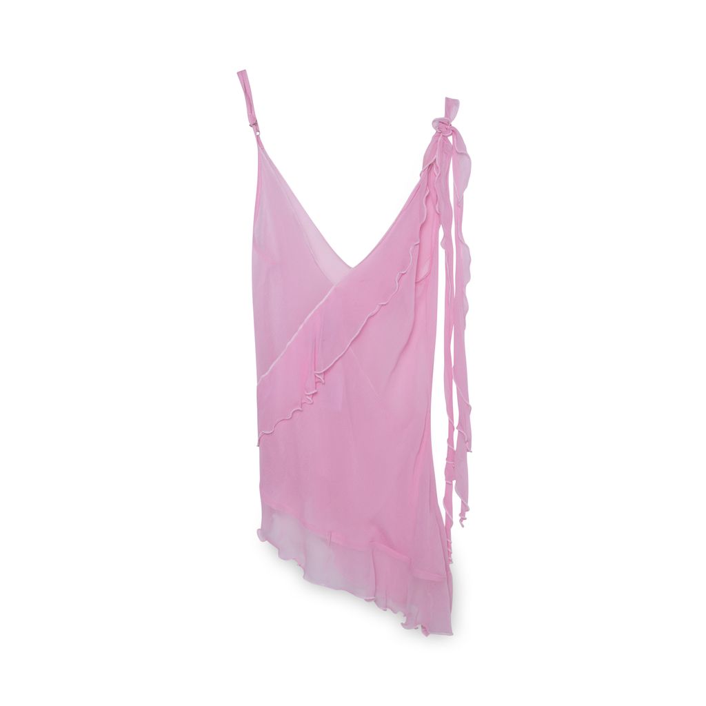 Dana Foley NYC Pink Sheer Ruffle Tank features knot at left shoulder, asymmetric hem, and ruffle detailing.