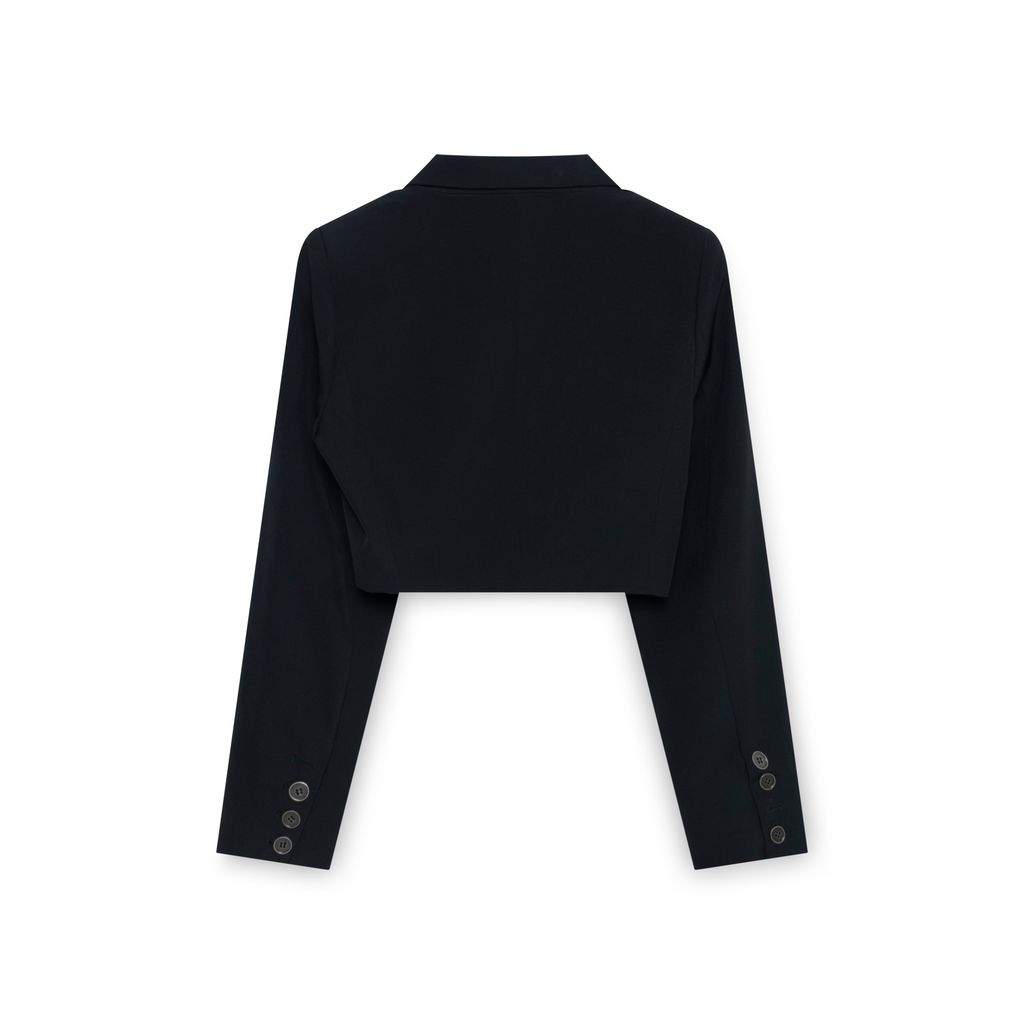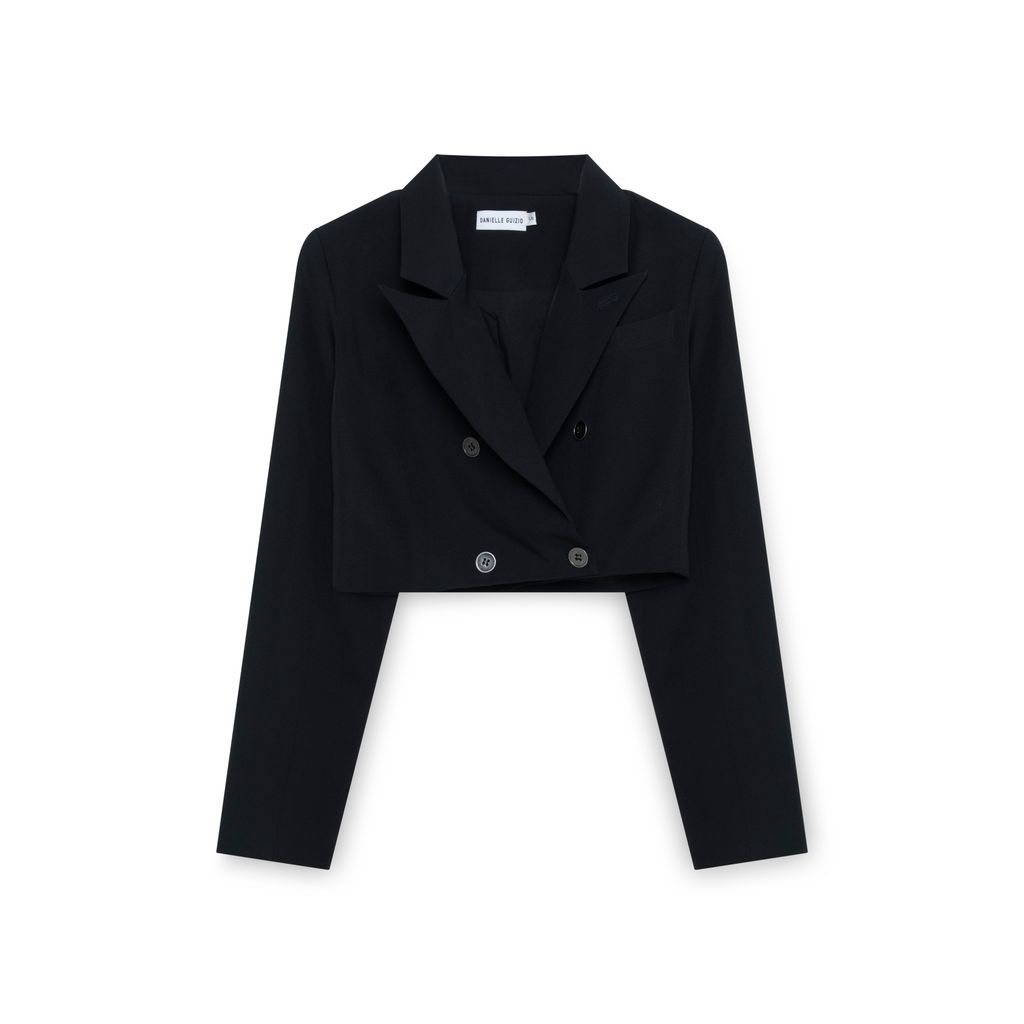 Danielle Guizio Black Cropped Blazer features front button closure, cropped length, and shoulder pads.