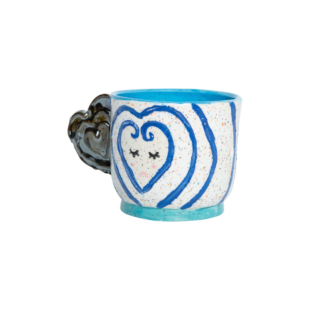 Metal Heart Mug - Dark Blue features dark blue heart design, white outside, turquoise trim, dark blue inside, with metal heart handle.
