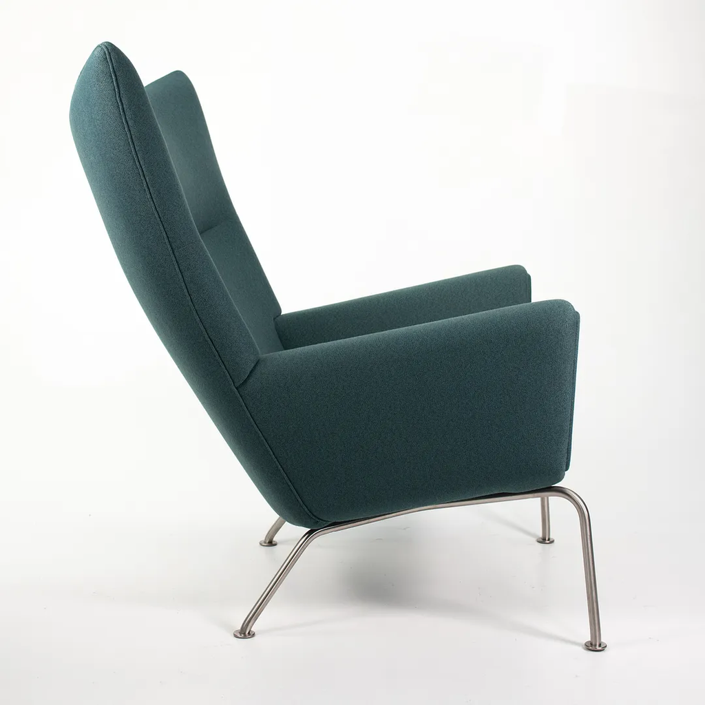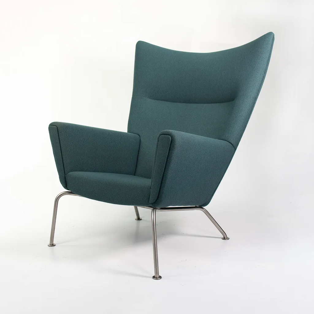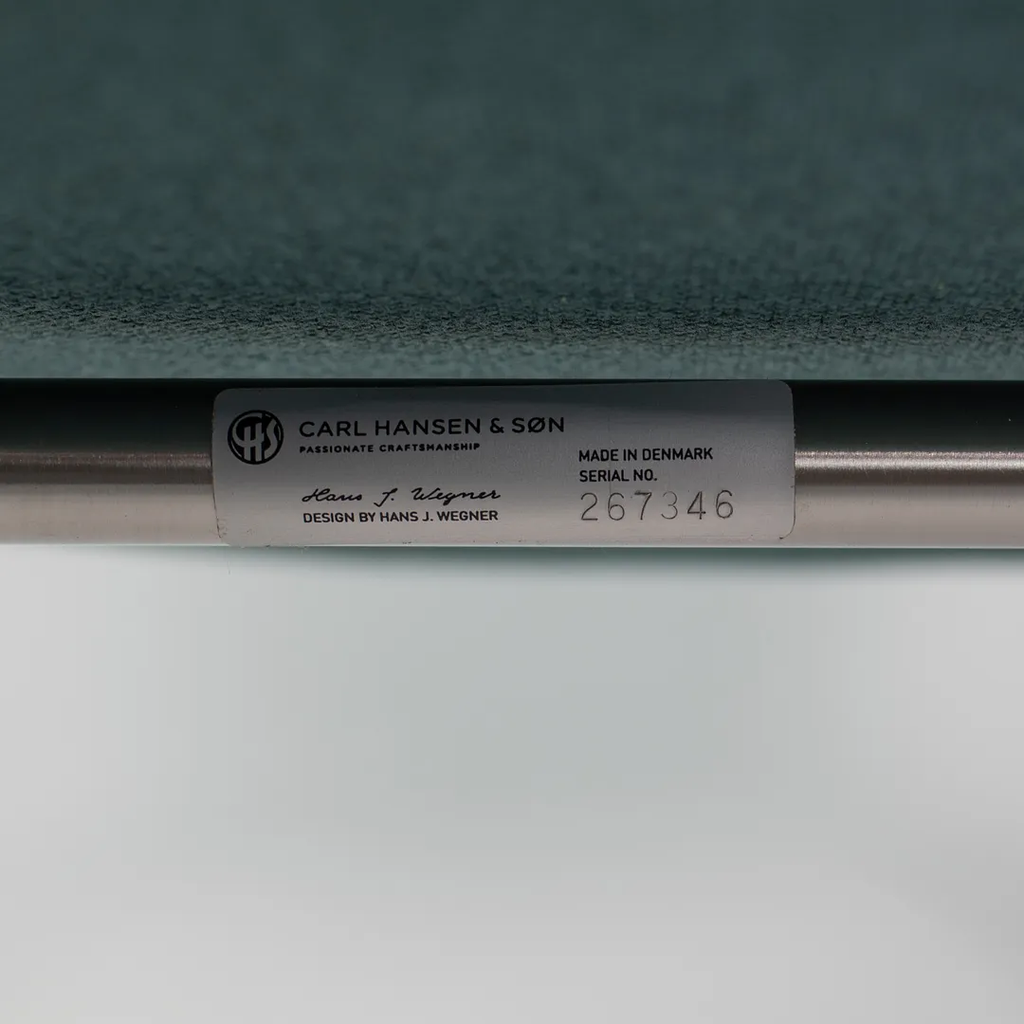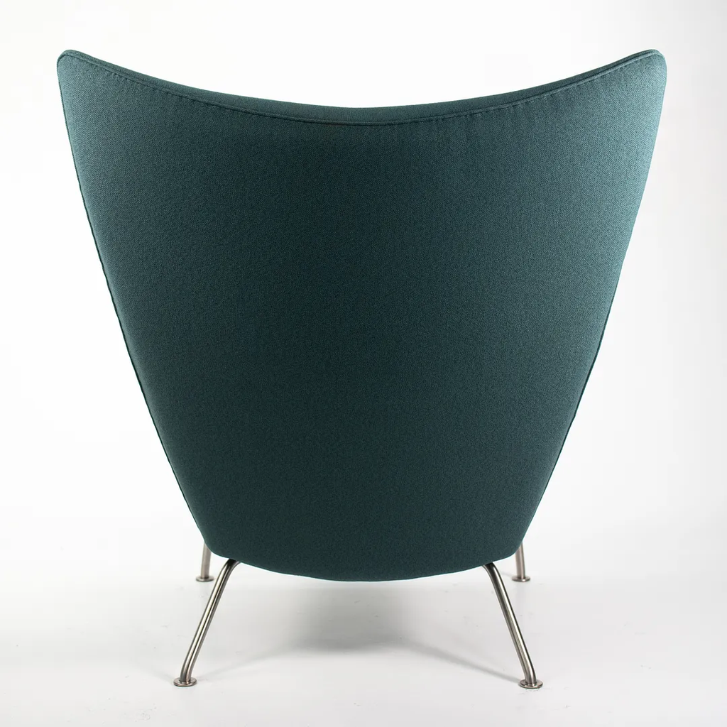 Listed for sale is a CH445 Wing Lounge Chair made with a stainless steel frame and dark green fabric. The chair was designed by Hans Wegner and produced by Carl Hansen & Son in Denmark. The chair dates to circa 2020 and is guaranteed as authentic. Condition is excellent overall and may show light wear only from storage and transportation to our warehouse. This chair has not been used in a home or office setting. See photos. The fabric appears to be a custom order from Carl Hansen, where an interior designer likely specified and sent in the Customer's Own Material (COM).