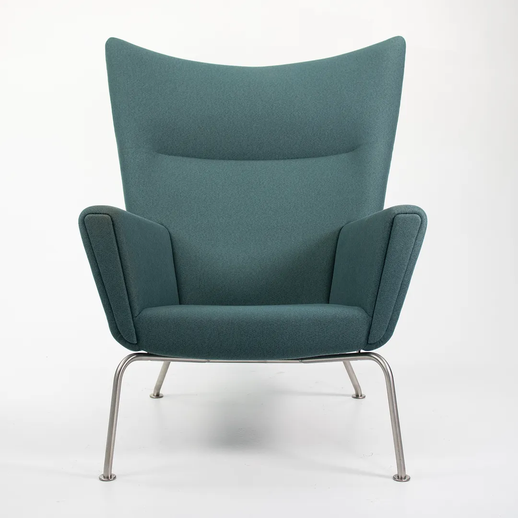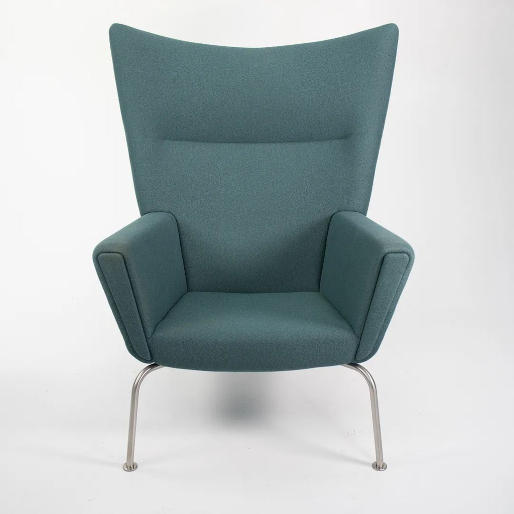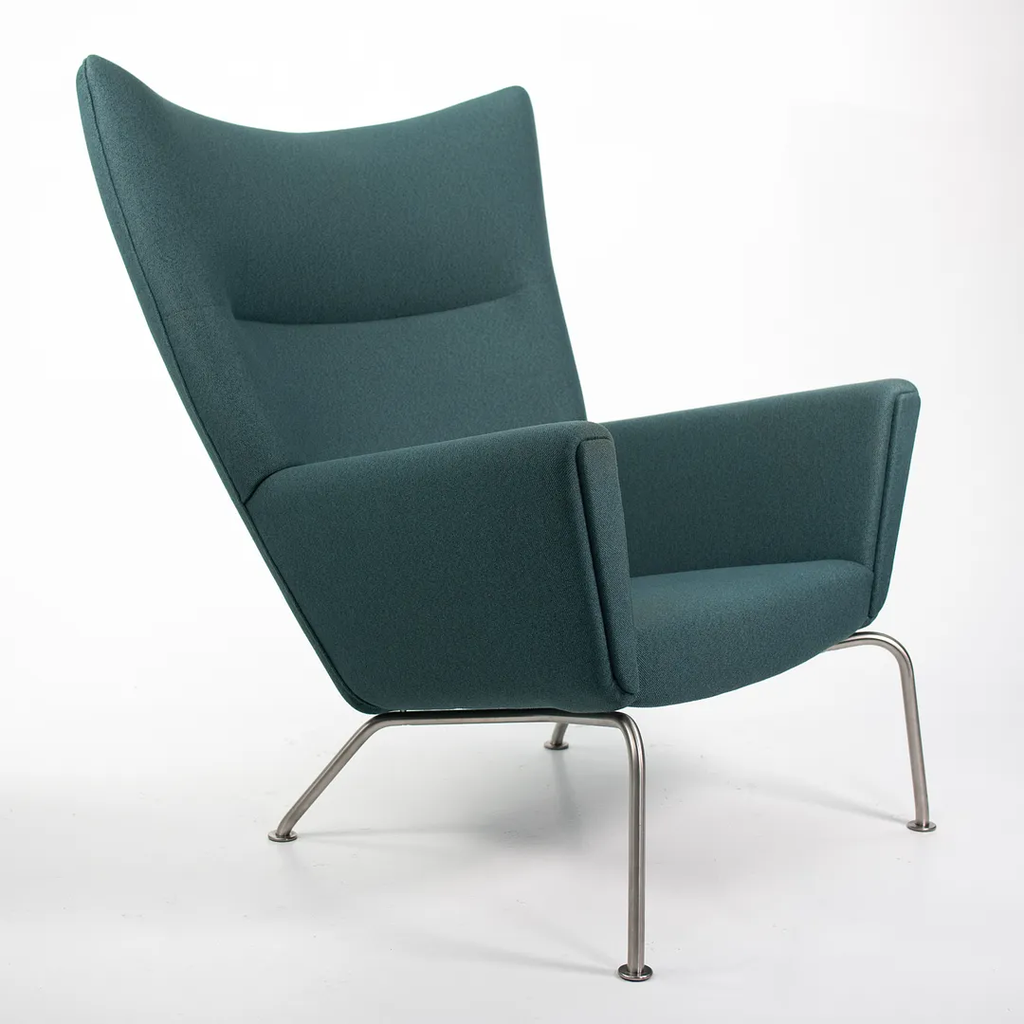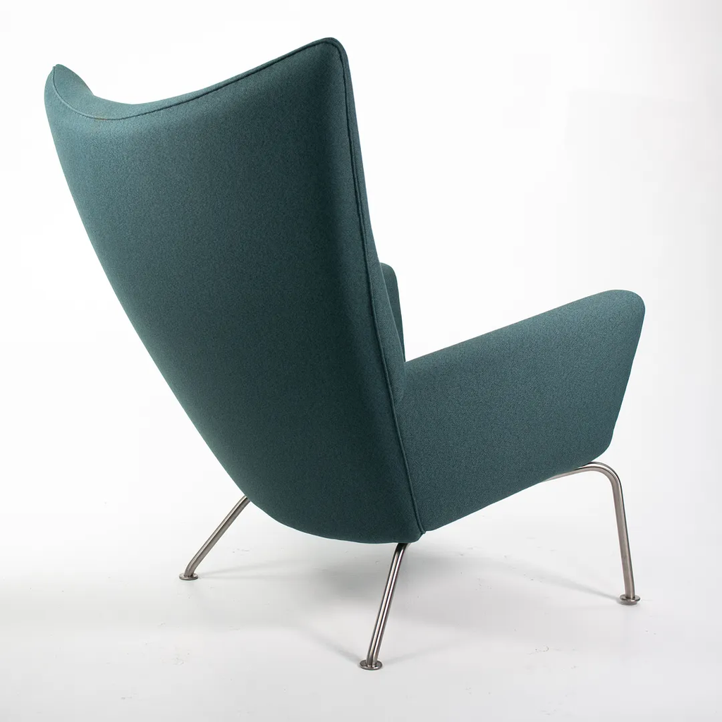Listed for sale is a CH445 Wing Lounge Chair made with a stainless steel frame and dark green fabric. The chair was designed by Hans Wegner and produced by Carl Hansen & Son in Denmark. The chair dates to circa 2020 and is guaranteed as authentic. Condition is excellent overall and may show light wear only from storage and transportation to our warehouse. This chair has not been used in a home or office setting. See photos. The fabric appears to be a custom order from Carl Hansen, where an interior designer likely specified and sent in the Customer's Own Material (COM).