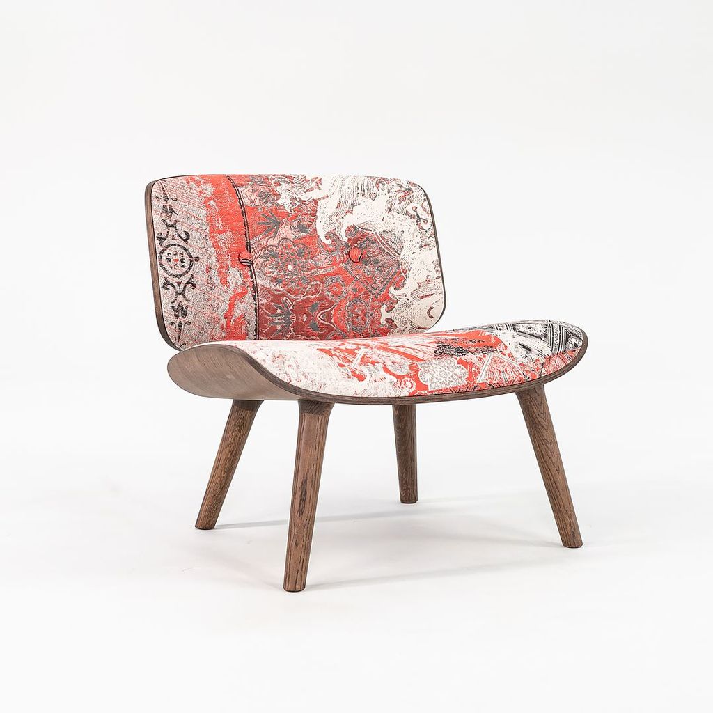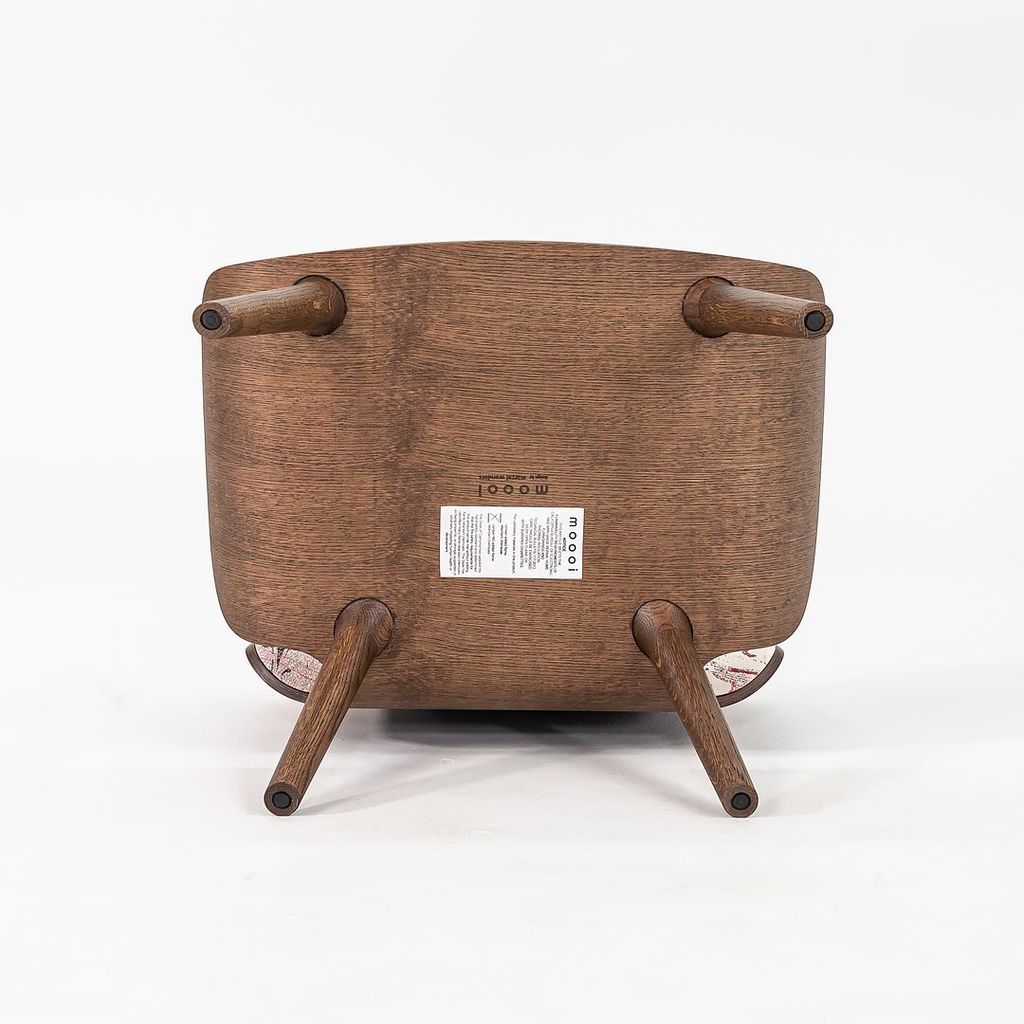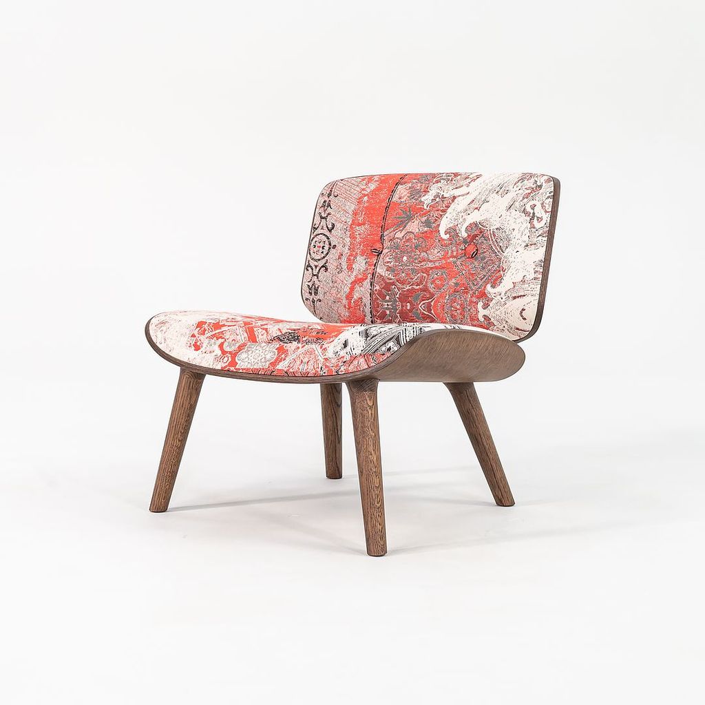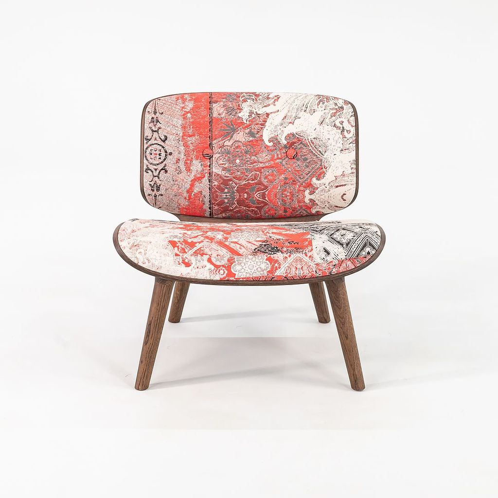Listed for sale is Nut Lounge Chair made with a wood frame, solid oak legs, and a multicolor woven fabric. The chair was designed by Marcel Wanders and produced by Moooi in the Netherlands. It dates to circa 2022 and is guaranteed as authentic. Condition is very good with some small discoloration in the back corner of the seat. See photos.