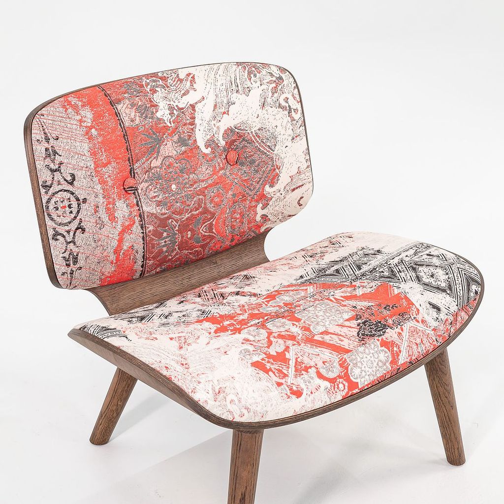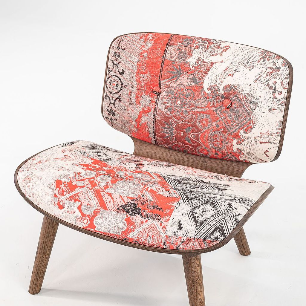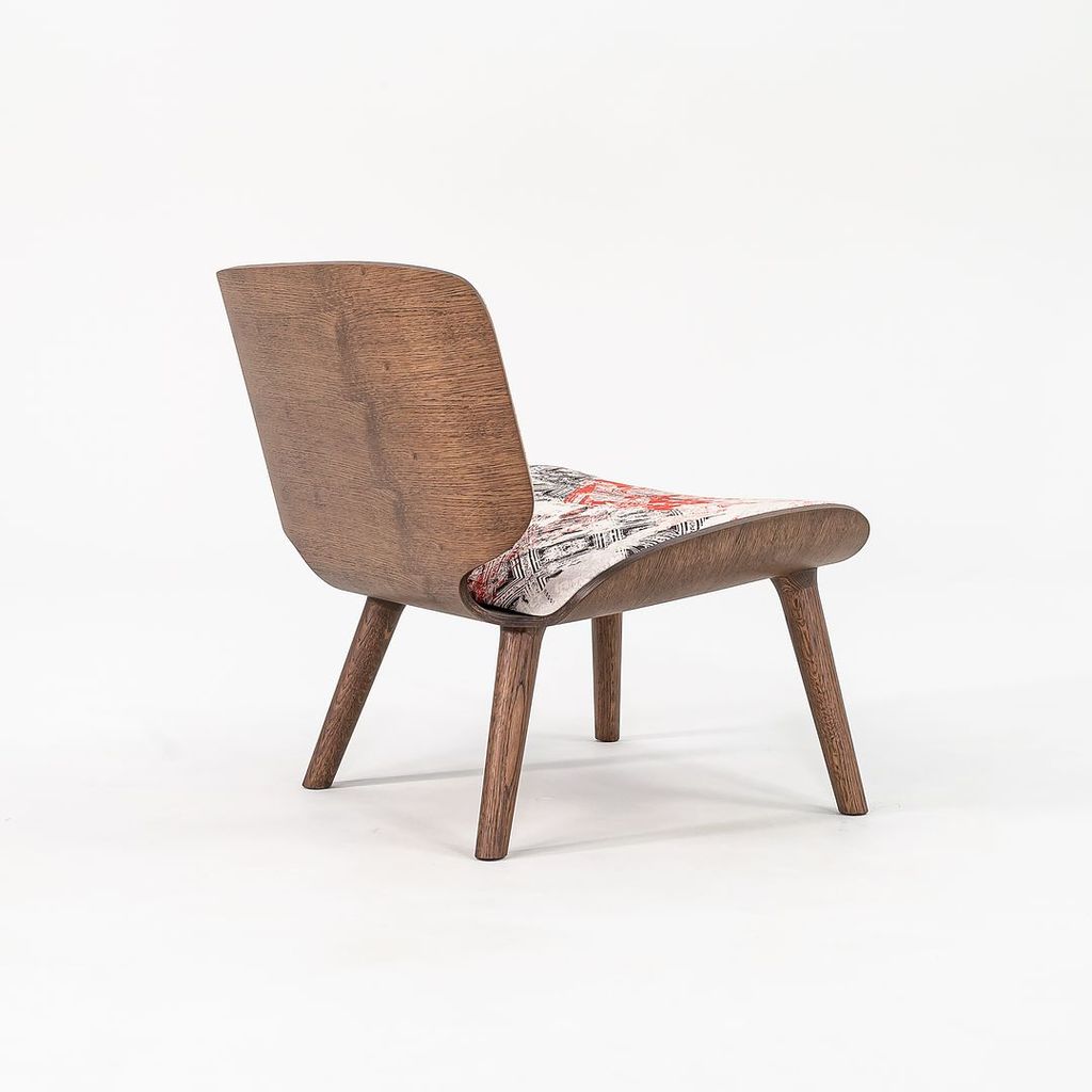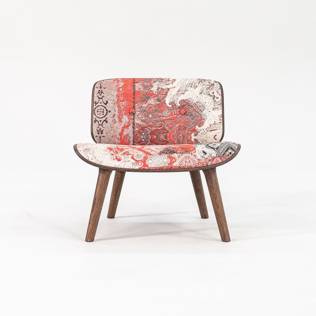 Listed for sale is Nut Lounge Chair made with a wood frame, solid oak legs, and a multicolor woven fabric. The chair was designed by Marcel Wanders and produced by Moooi in the Netherlands. It dates to circa 2022 and is guaranteed as authentic. Condition is very good with some small discoloration in the back corner of the seat. See photos.