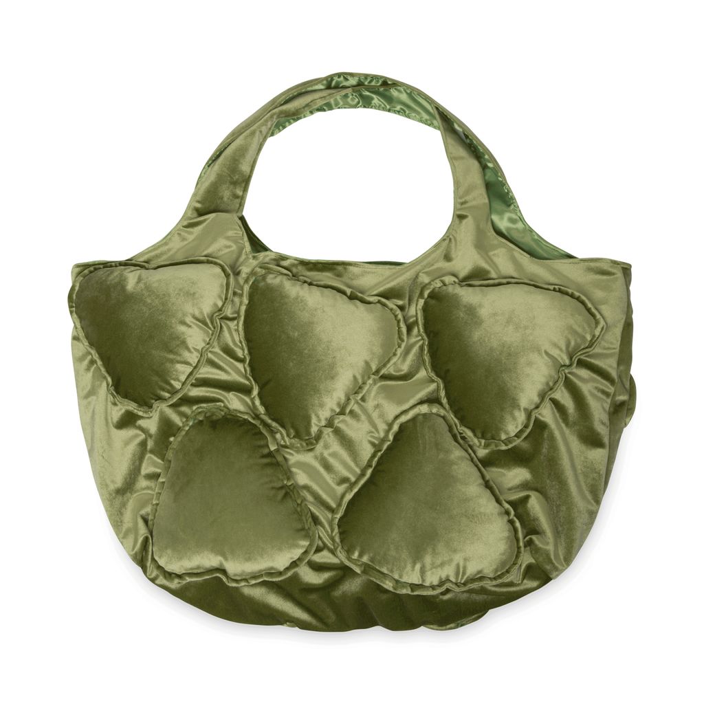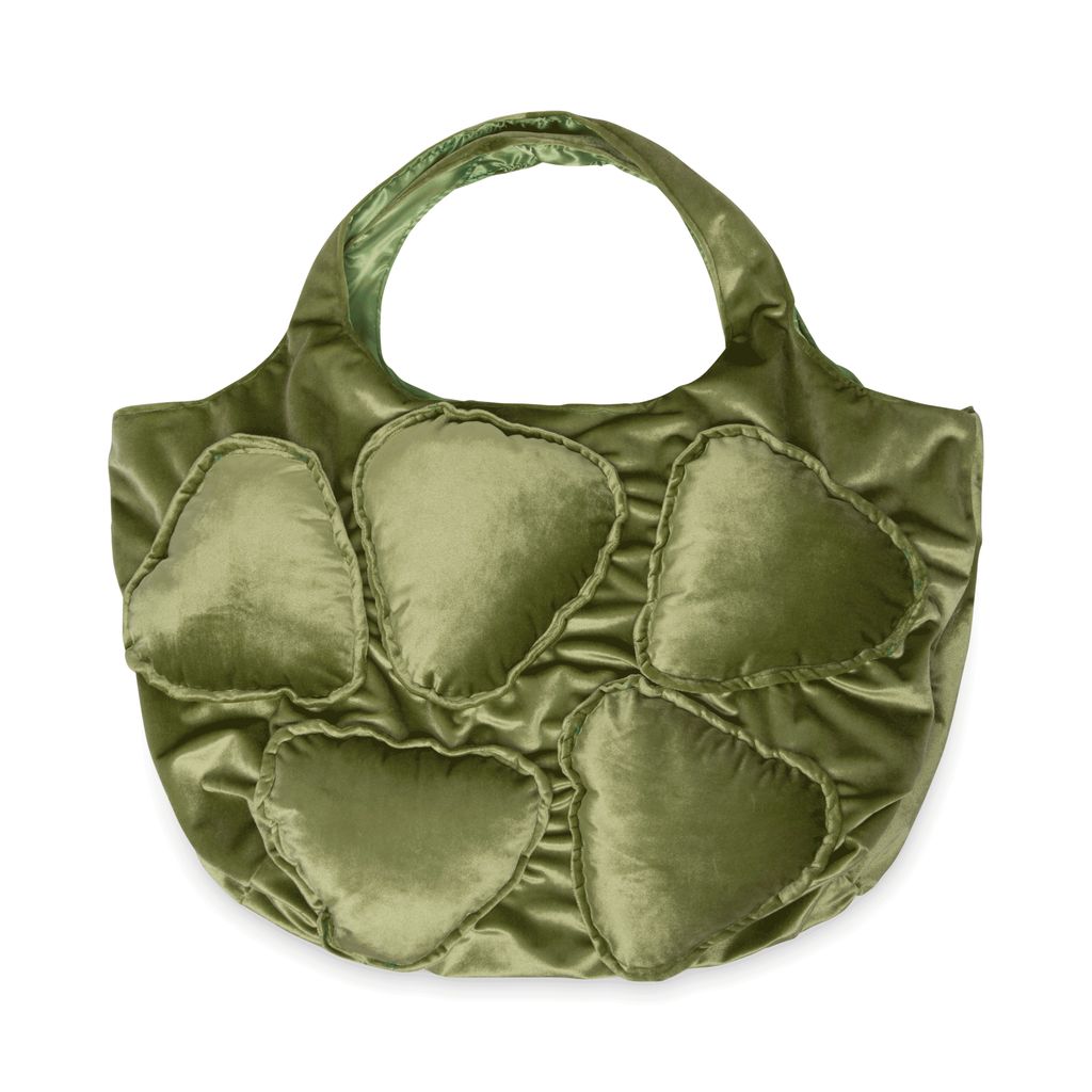 Dartci handbag in green is made with luxurious velvet fabric and obsidian puffy cut.