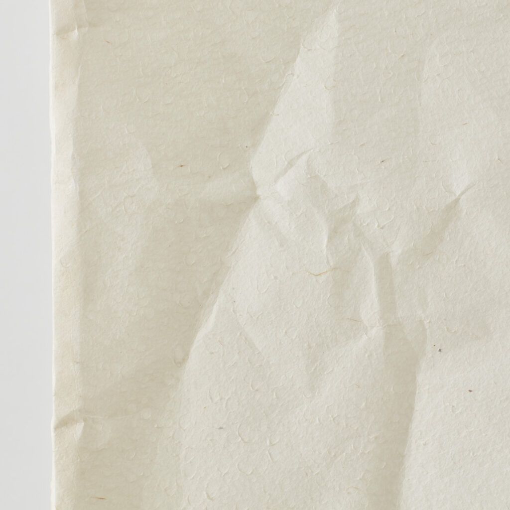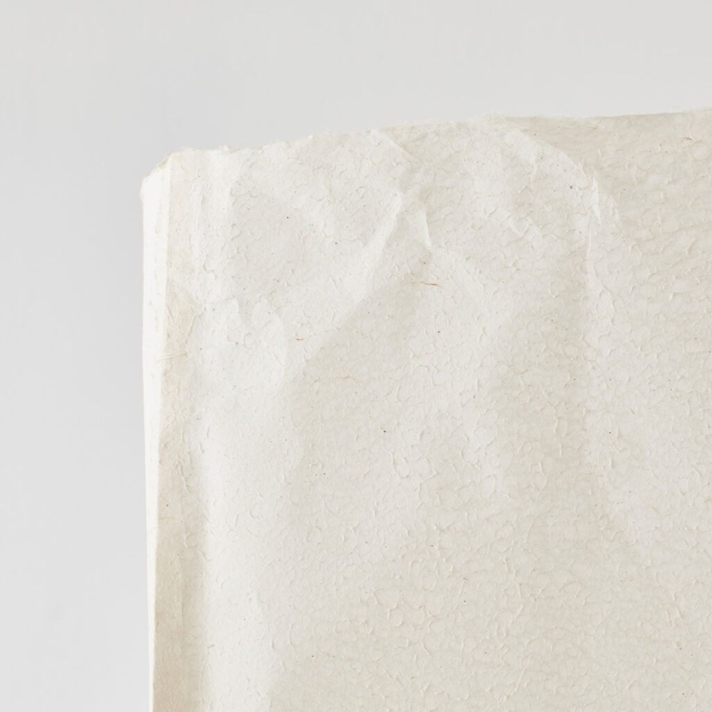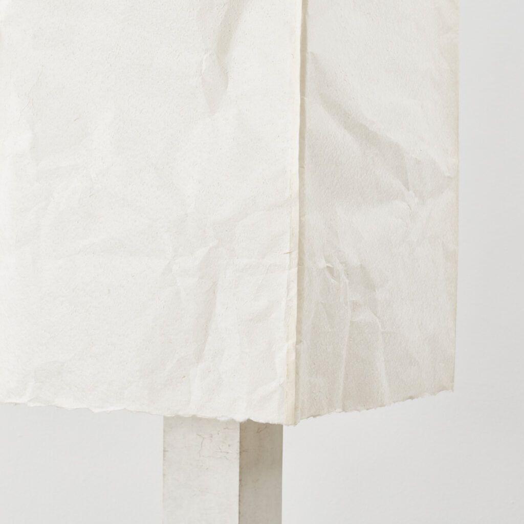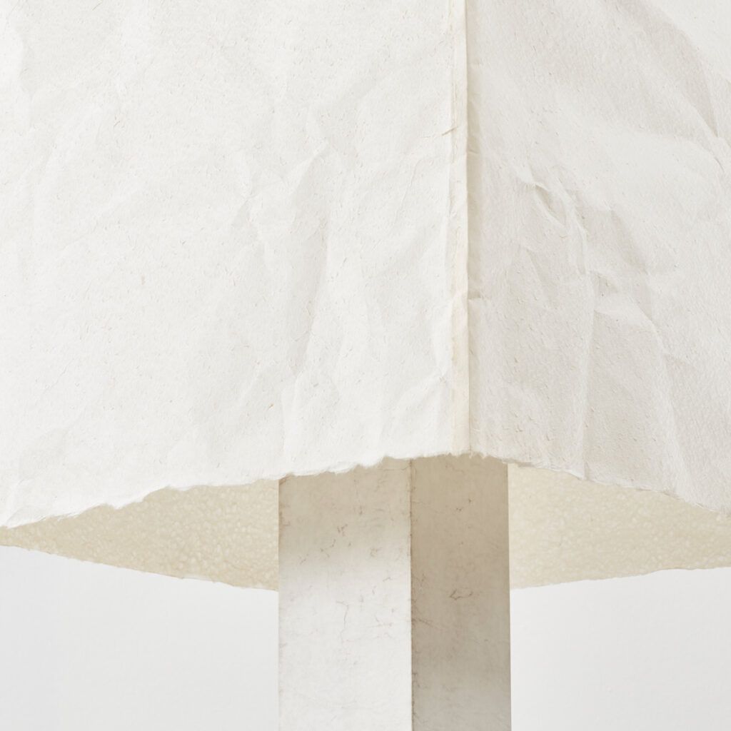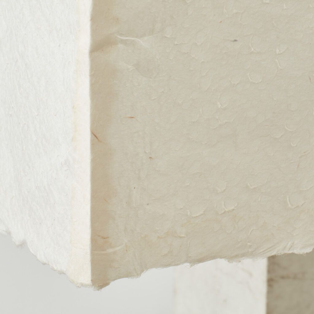 This oversized floor light has a base that experiments with de-composition as re-composition, combining layers of handmade heritage paper to produce a soft natural appearance. Subtle creases across the surface produce a beautiful stone-like quality. A top layer of matte lacquer is applied by hand to protect the paper and provide it with a slight sheen. The shade uses a handmade heritage paper that has been rained on during the making process allowing light through it in an incredibly pleasing way.