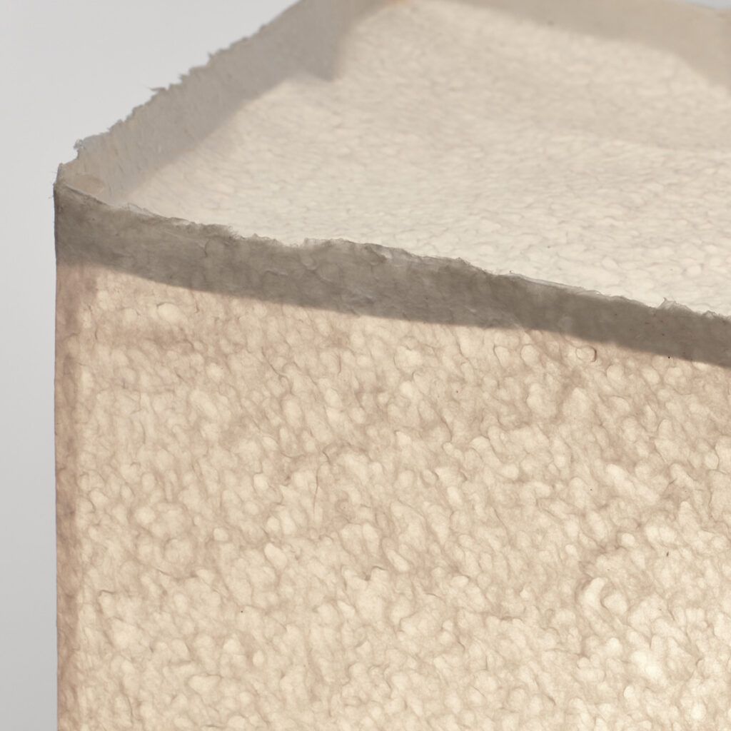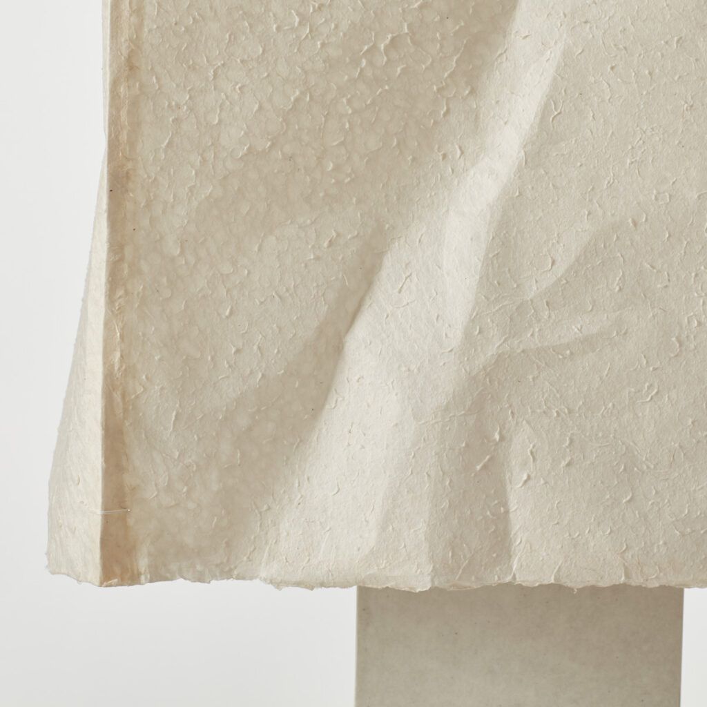 This table light has a base that experiments with de-composition as re-composition, combining layers of Kozuki-Mingeshi paper to produce a soft natural appearance. Subtle creases across the surface have a beautiful stone-like quality. A top layer of matte lacquer is applied by hand to protect the paper and provide it with a slight sheen. The shade uses a handmade Japanese paper that has been rained on during the making process allowing light through it in an incredibly pleasing way.