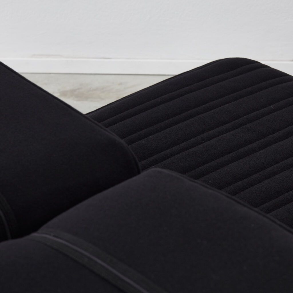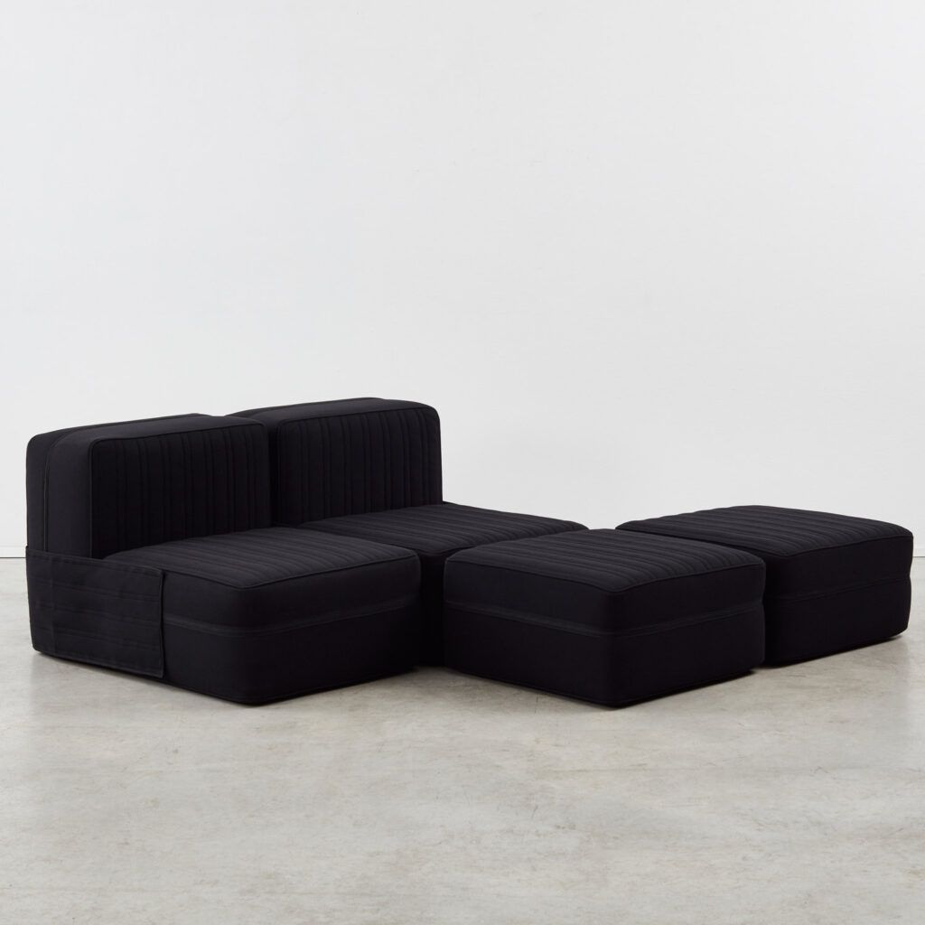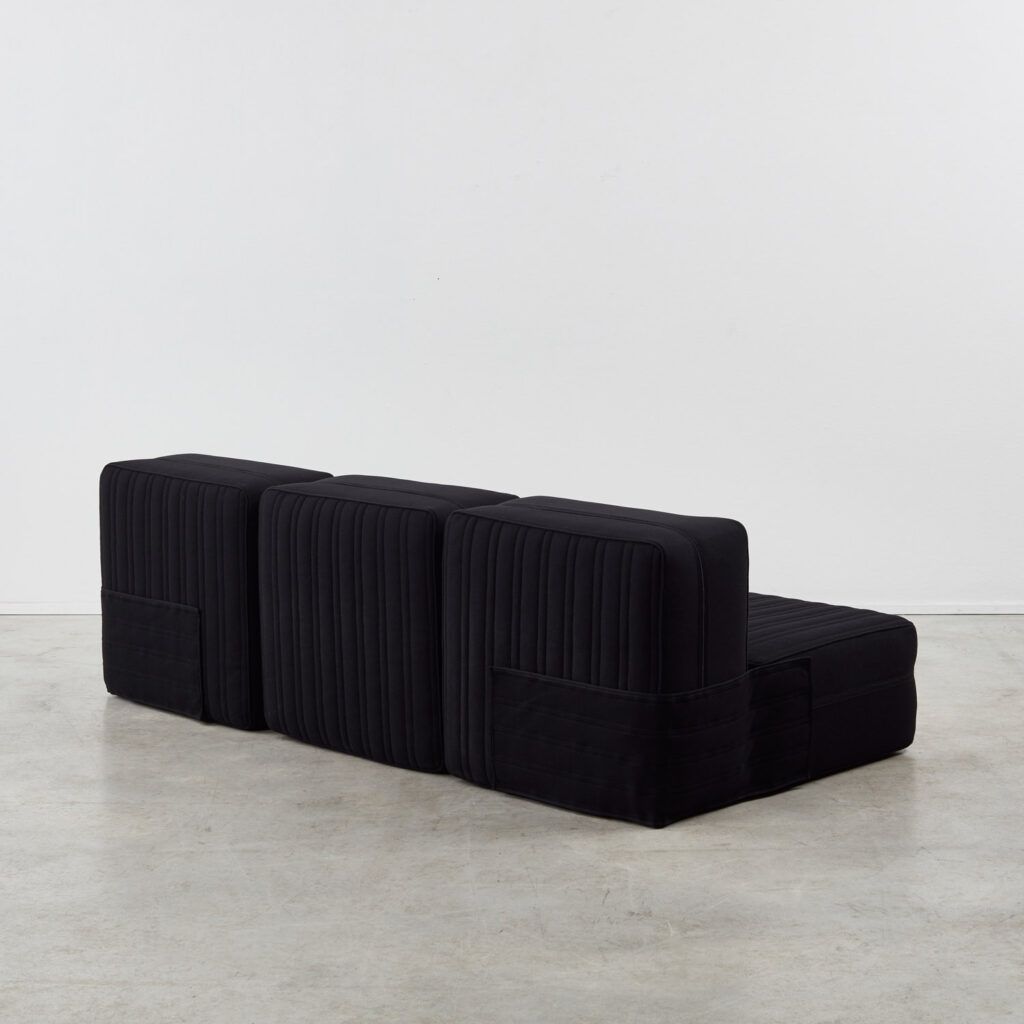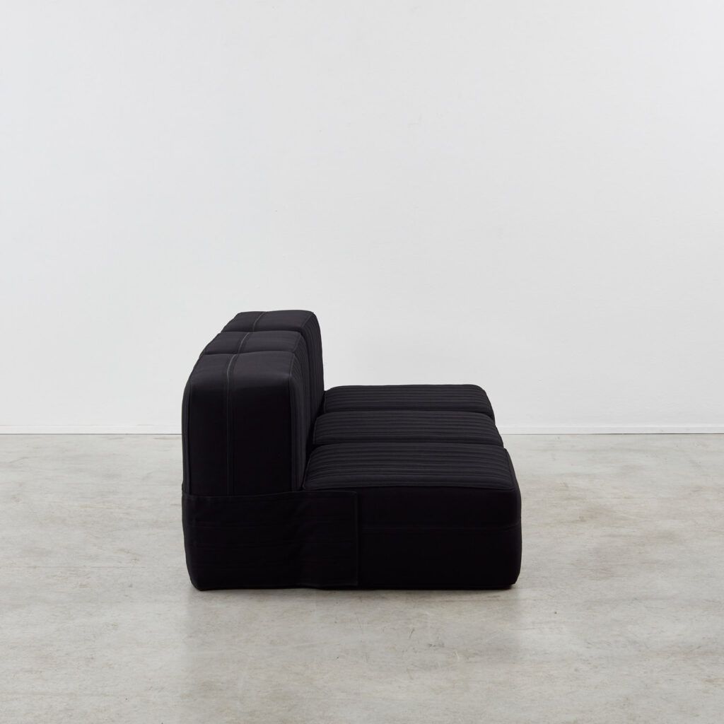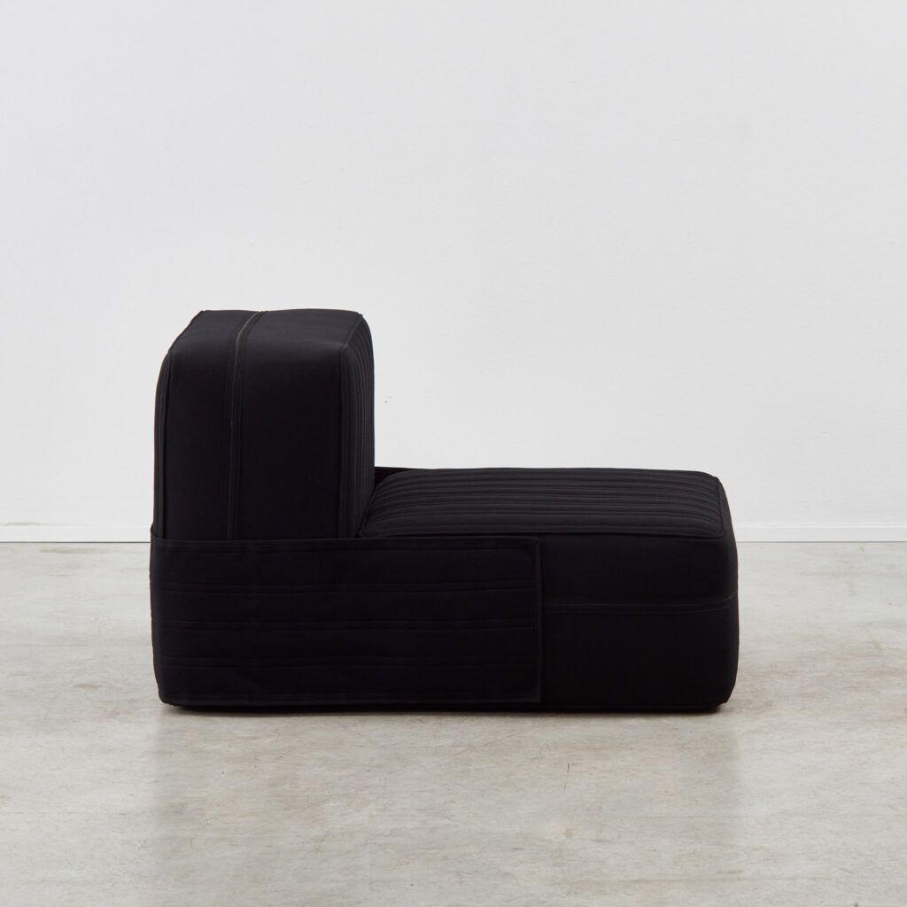 The sofa has been reupholstered, as per the original, in a black fabric that attaches to the velcro straps directly, enabling it to be joined and configured to the specification of the sitter.