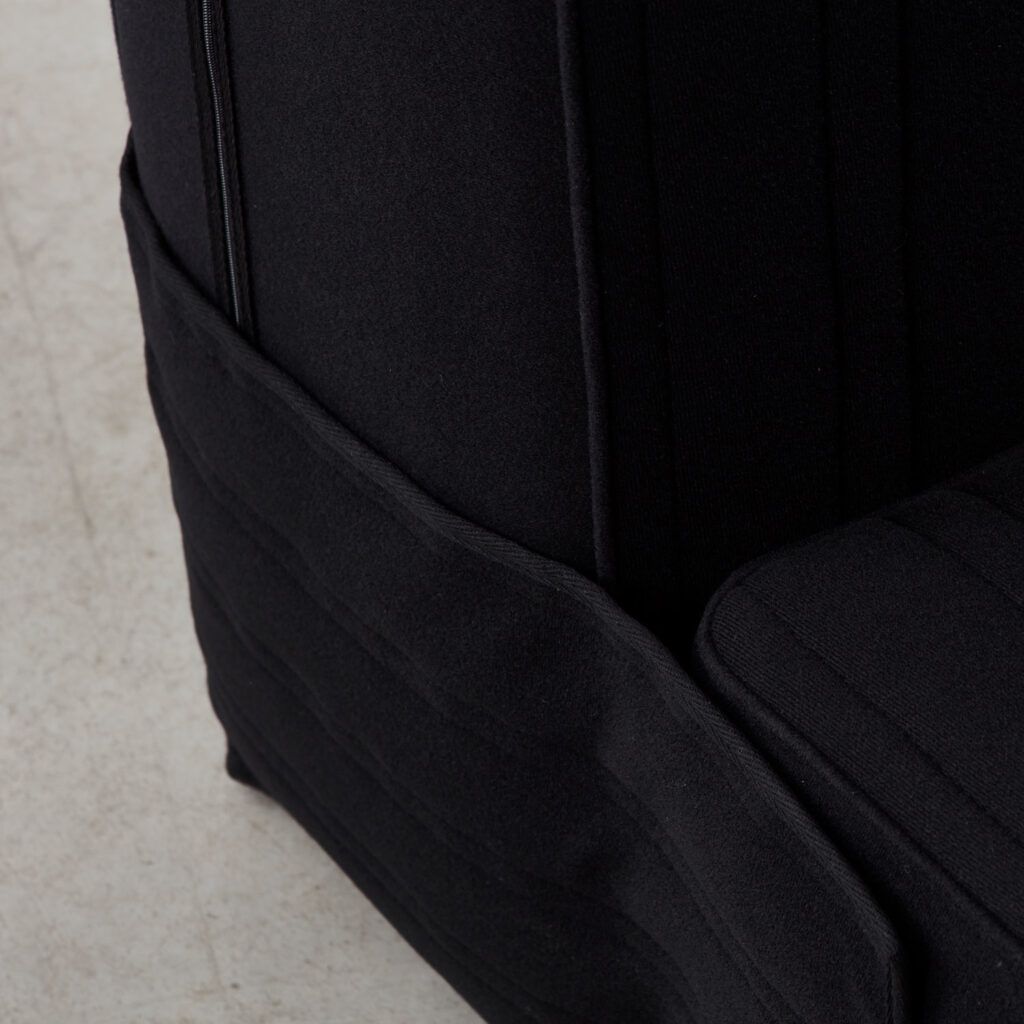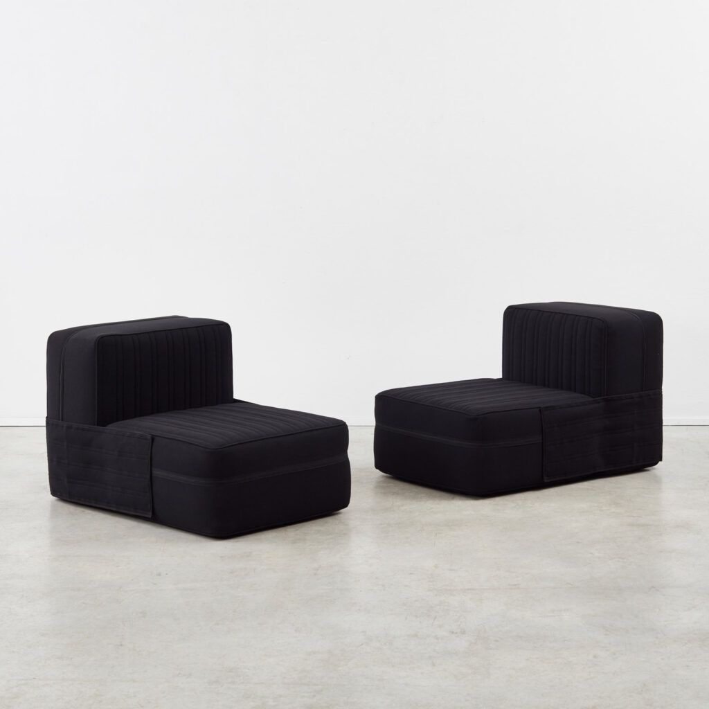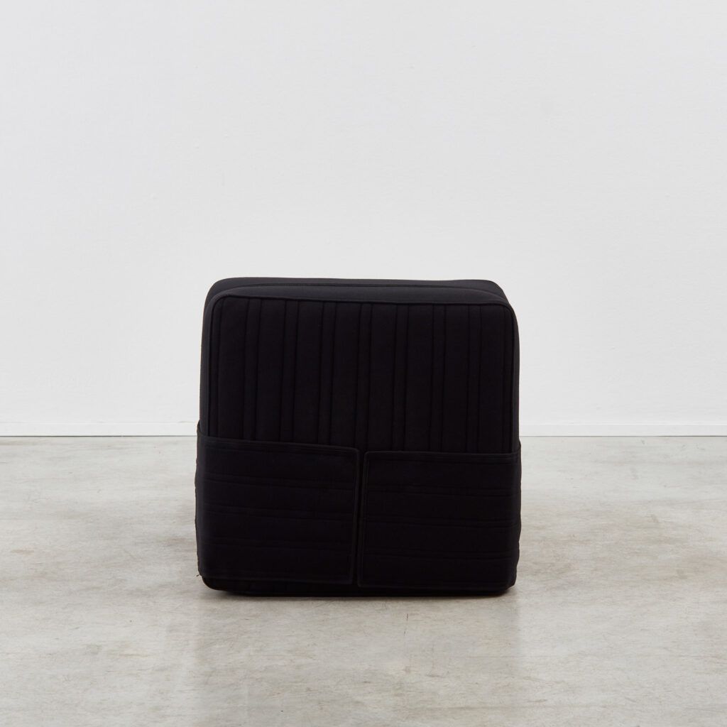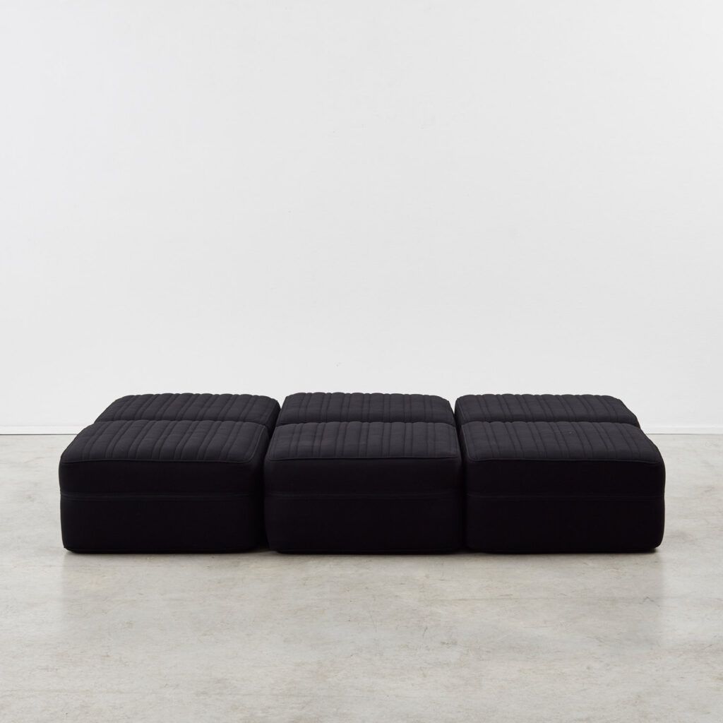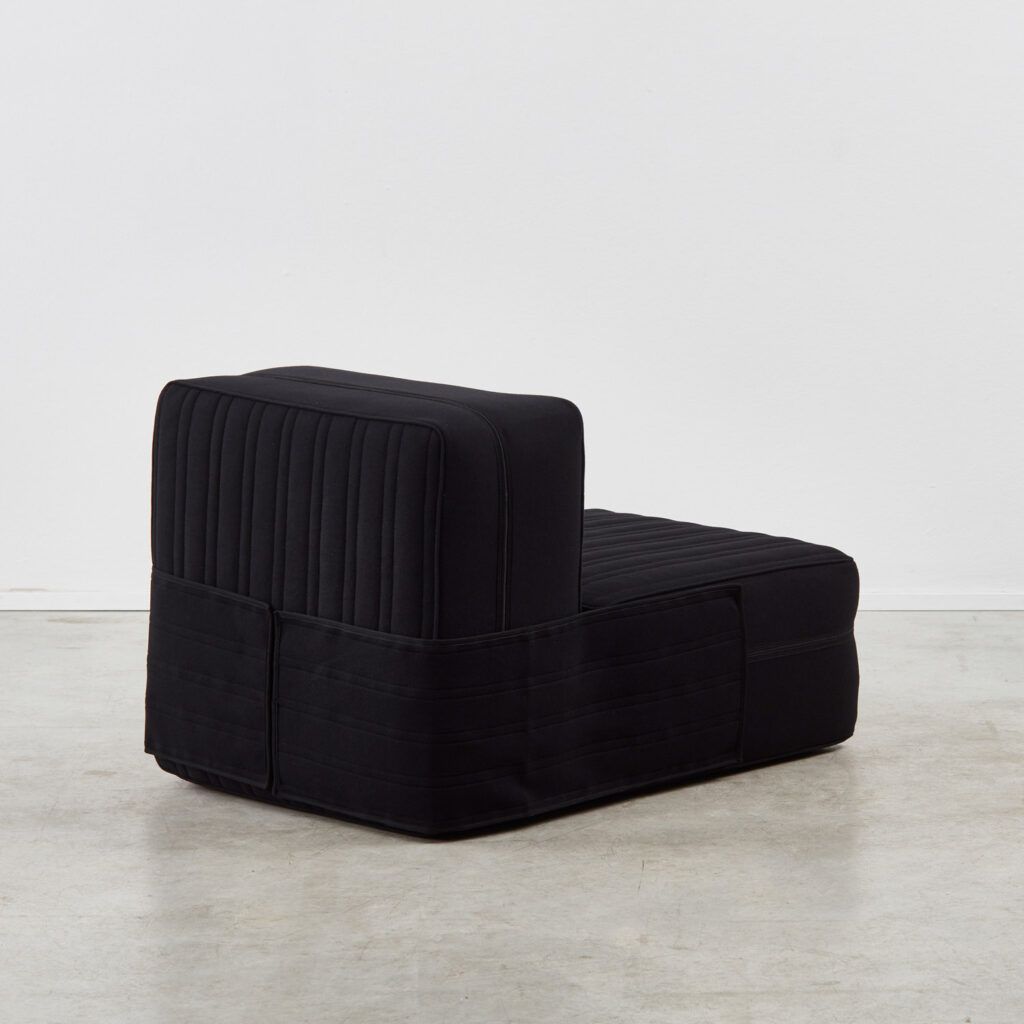 The sofa has been reupholstered, as per the original, in a black fabric that attaches to the velcro straps directly, enabling it to be joined and configured to the specification of the sitter.