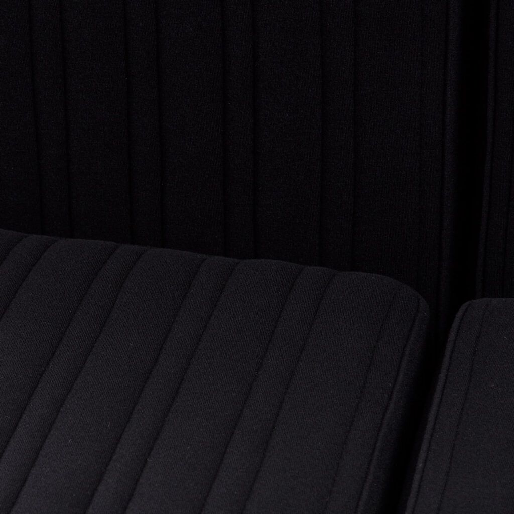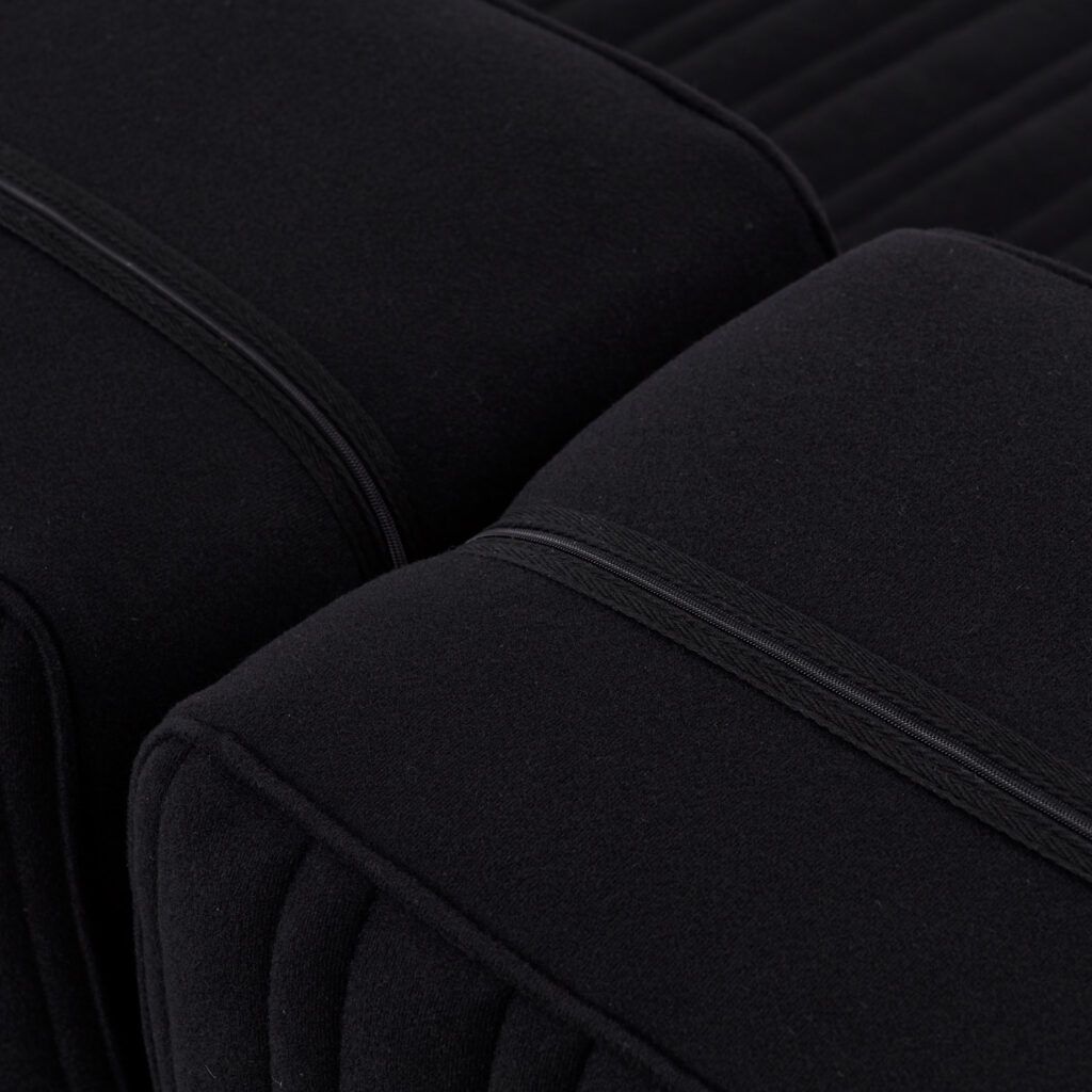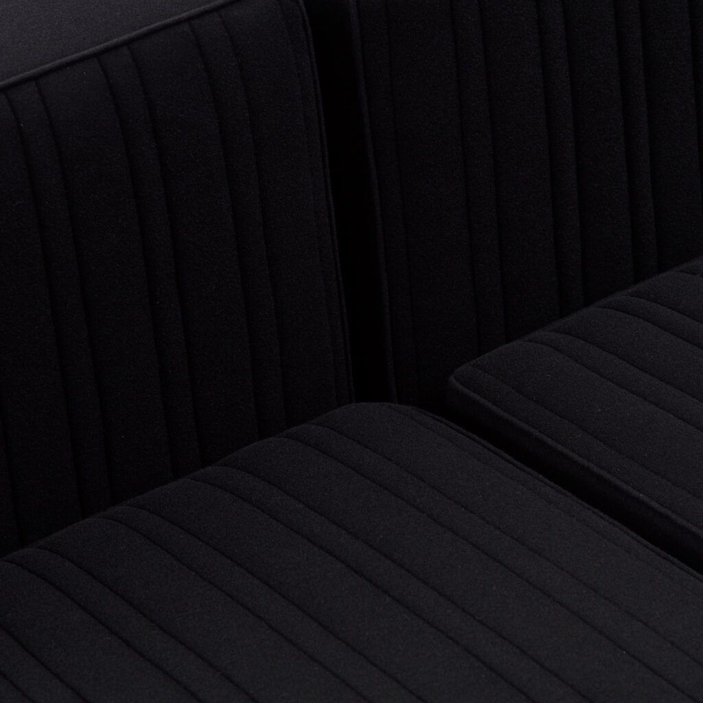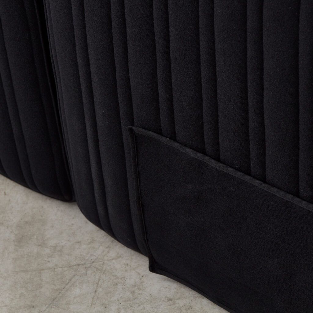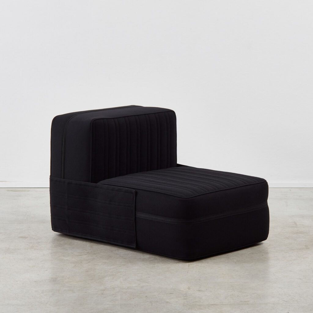 The sofa has been reupholstered, as per the original, in a black fabric that attaches to the velcro straps directly, enabling it to be joined and configured to the specification of the sitter.
