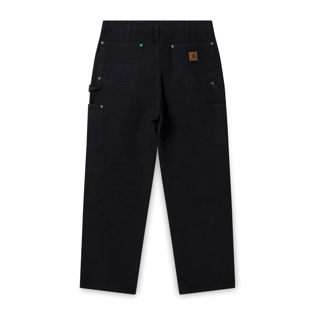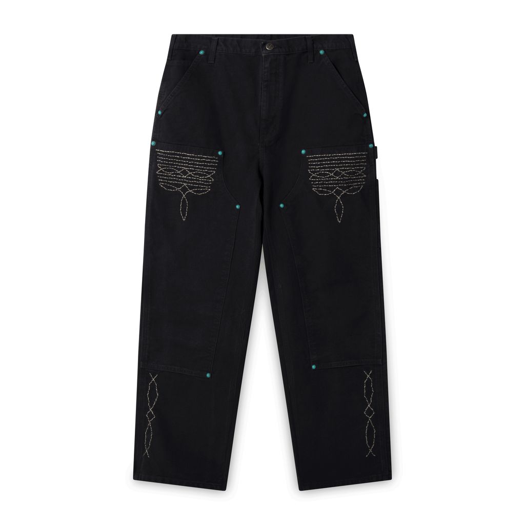 Deadstock Carhartt double knee pants with stone rivet replacements and handstitched cowboy medallion embellishments. All pants have been custom treated to give a worn-in look and soft texture, as well as having been reconstructed with a slightly looser fit and gentle taper below the knee. Pants may feature tonal stitch repairs and reinforcements at particular stress points.