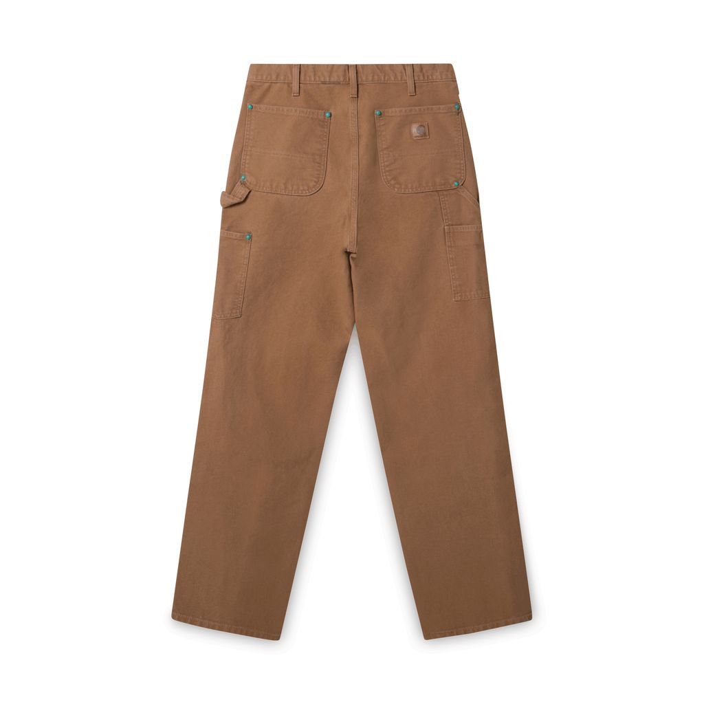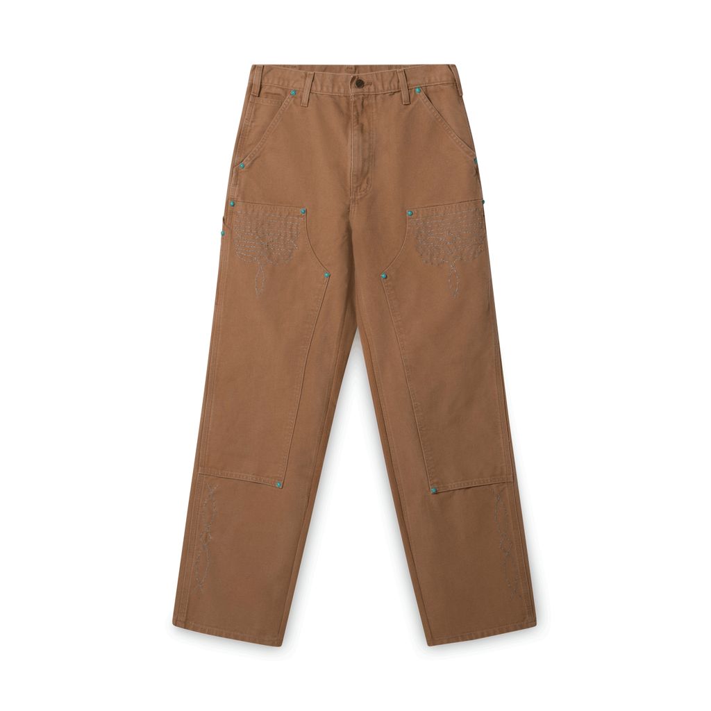 Deadstock Carhartt double knee pants with stone rivet replacements and handstitched cowboy medallion embellishments. All pants have been custom treated to give a worn-in look and soft texture, as well as having been reconstructed with a slightly looser fit and gentle taper below the knee. Pants may feature tonal stitch repairs and reinforcements at particular stress points.