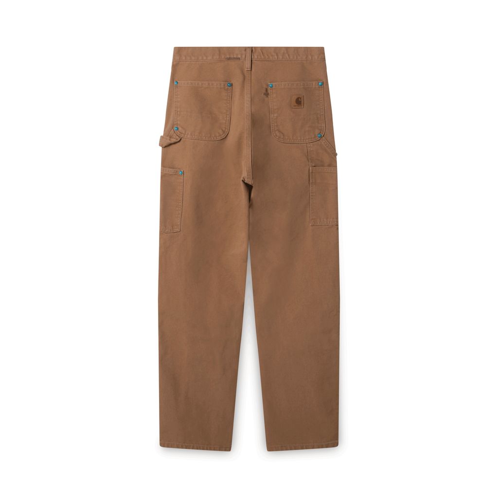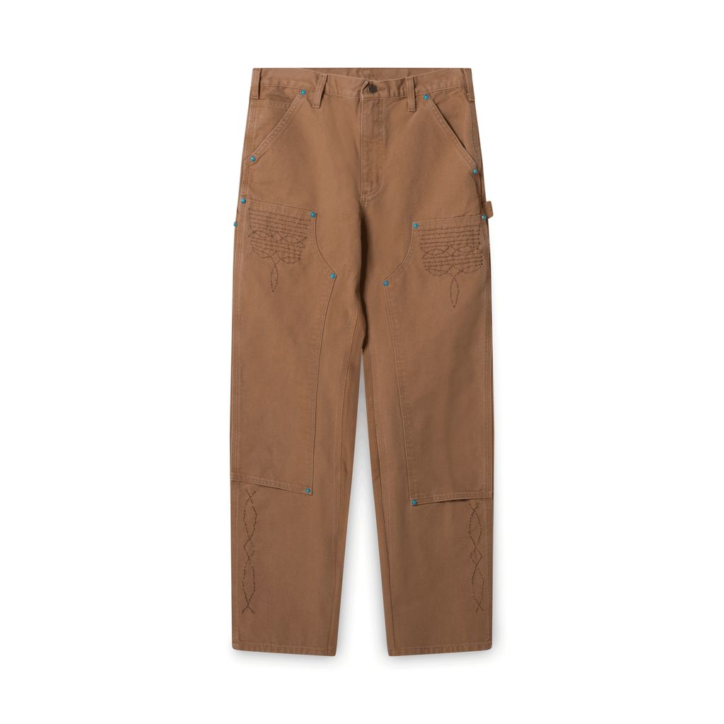 Deadstock Carhartt double knee pants with stone rivet replacements and handstitched cowboy medallion embellishments. All pants have been custom treated to give a worn-in look and soft texture, as well as having been reconstructed with a slightly looser fit and gentle taper below the knee. Pants may feature tonal stitch repairs and reinforcements at particular stress points.