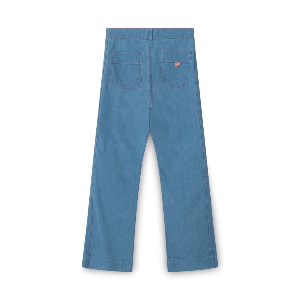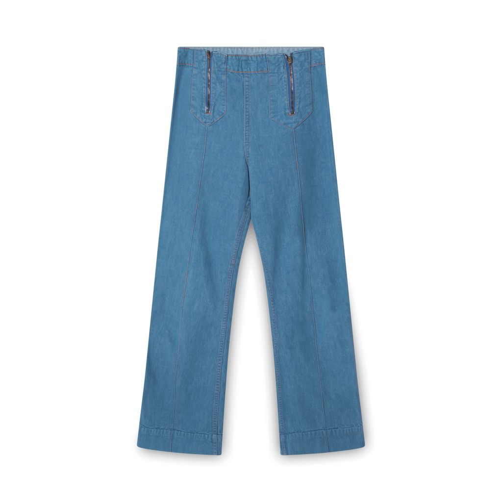 These lightwash jeans feature neon peach stitching and a double zipped closure.