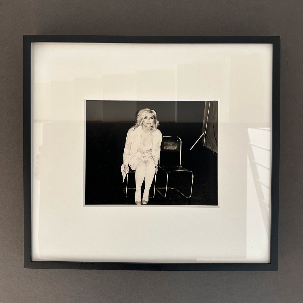 Framed photograph of Debbie Harry (Blondie) seated, 1986, by Andy Warhol. This is a unique work. This work is stamped on the verso by the Estate of the Artist and The Andy Warhol Foundation for the Visual Arts and also includes a Foundation number which is written on verso. Work comes with a Certificate of Provenance.