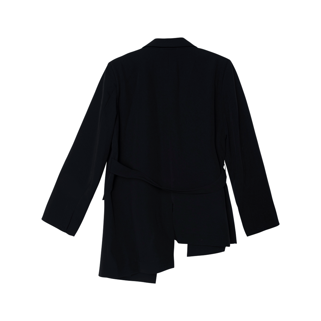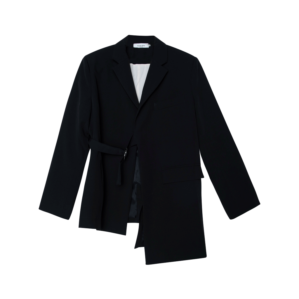 Decon Belted Blazer in Black features adjustable buckle belt at waist, flap pocket at hip, peaked lapel collar, and full lining featuring a leather coat tab.