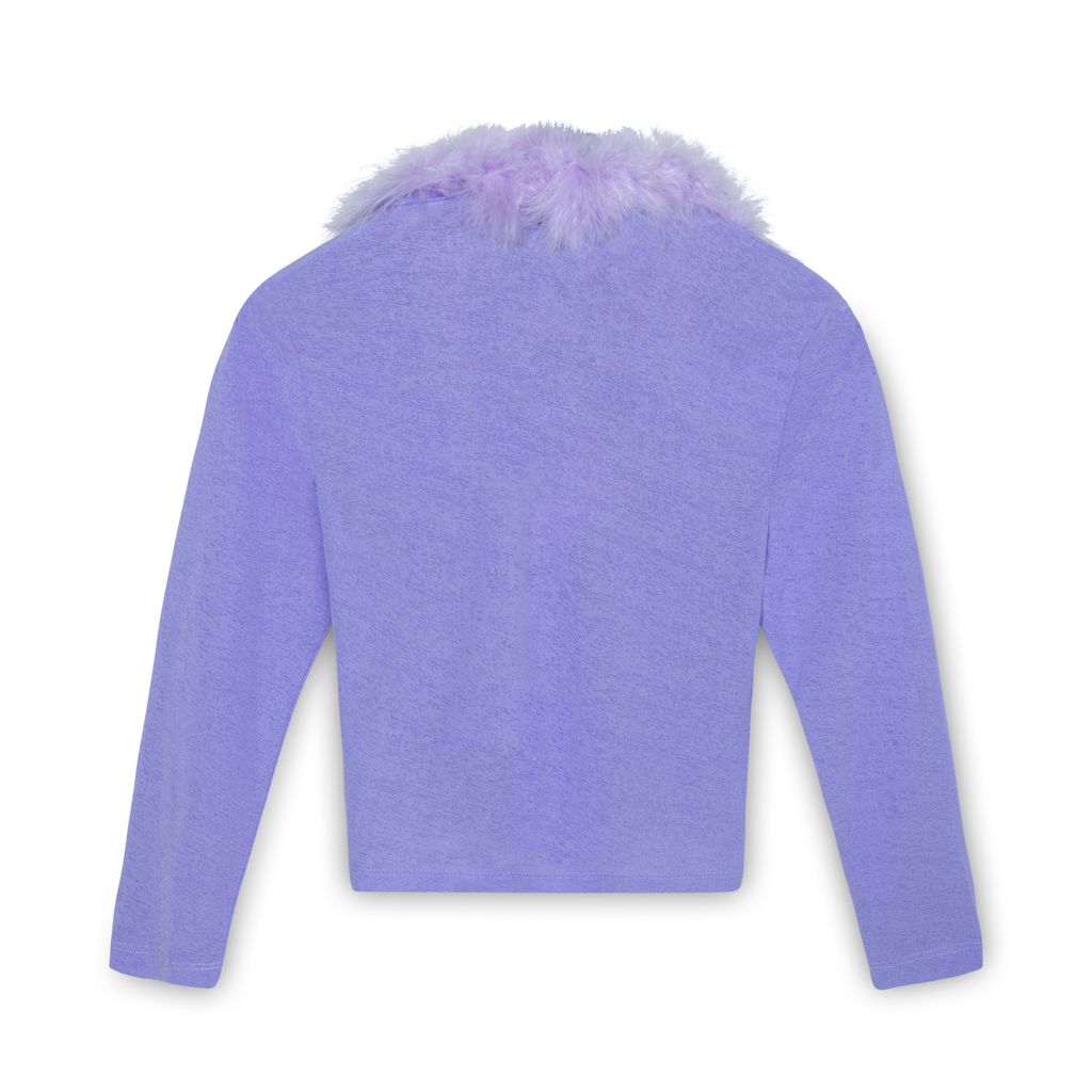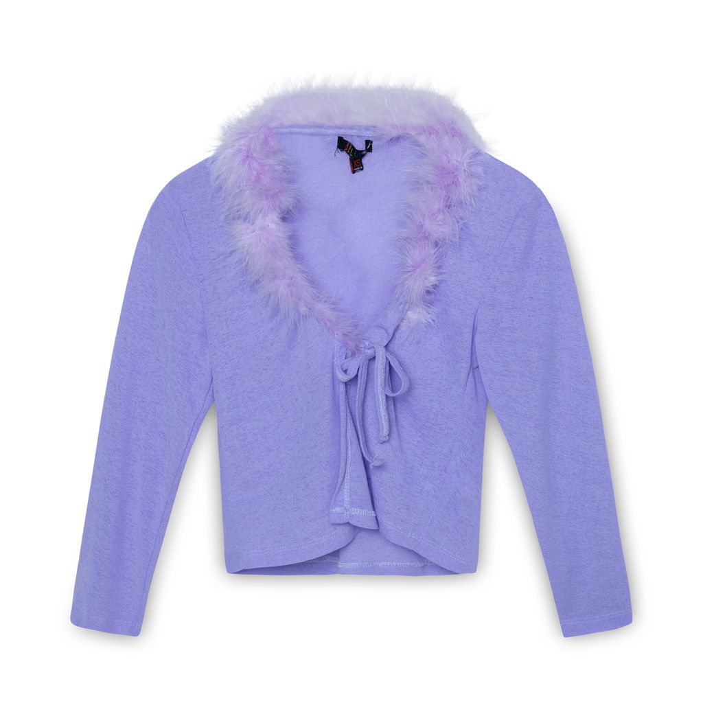 Delia's Purple Feather Trim Cardigan features feather trip around collar, cropped fit, and front tie.