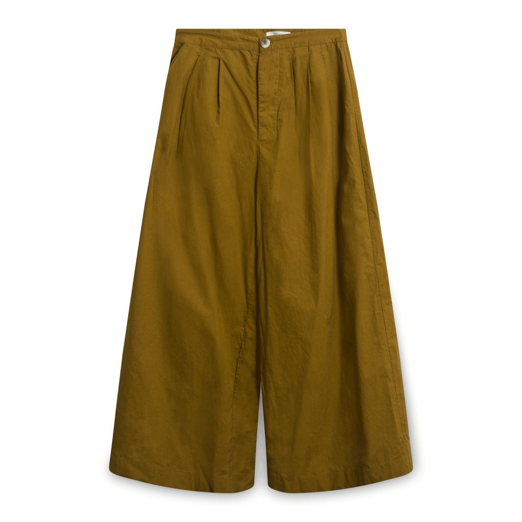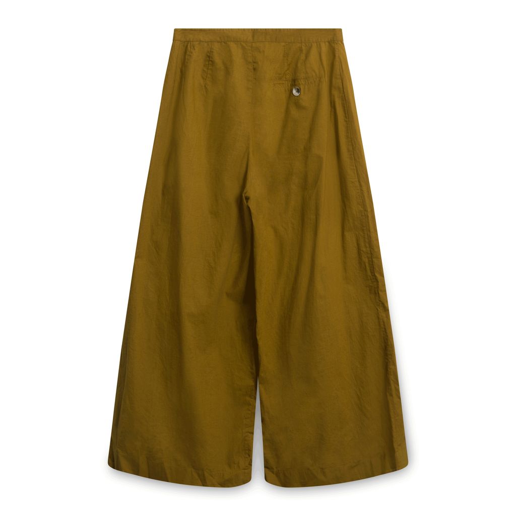 These gorgeous pants feature a high waisted fit and streamlined wide leg. These pants have back and front darts, one back pocket, and a covered button fly with an exposed button at the waistband. The structure silhouette features wide cut legs that hold their shape with every movement.