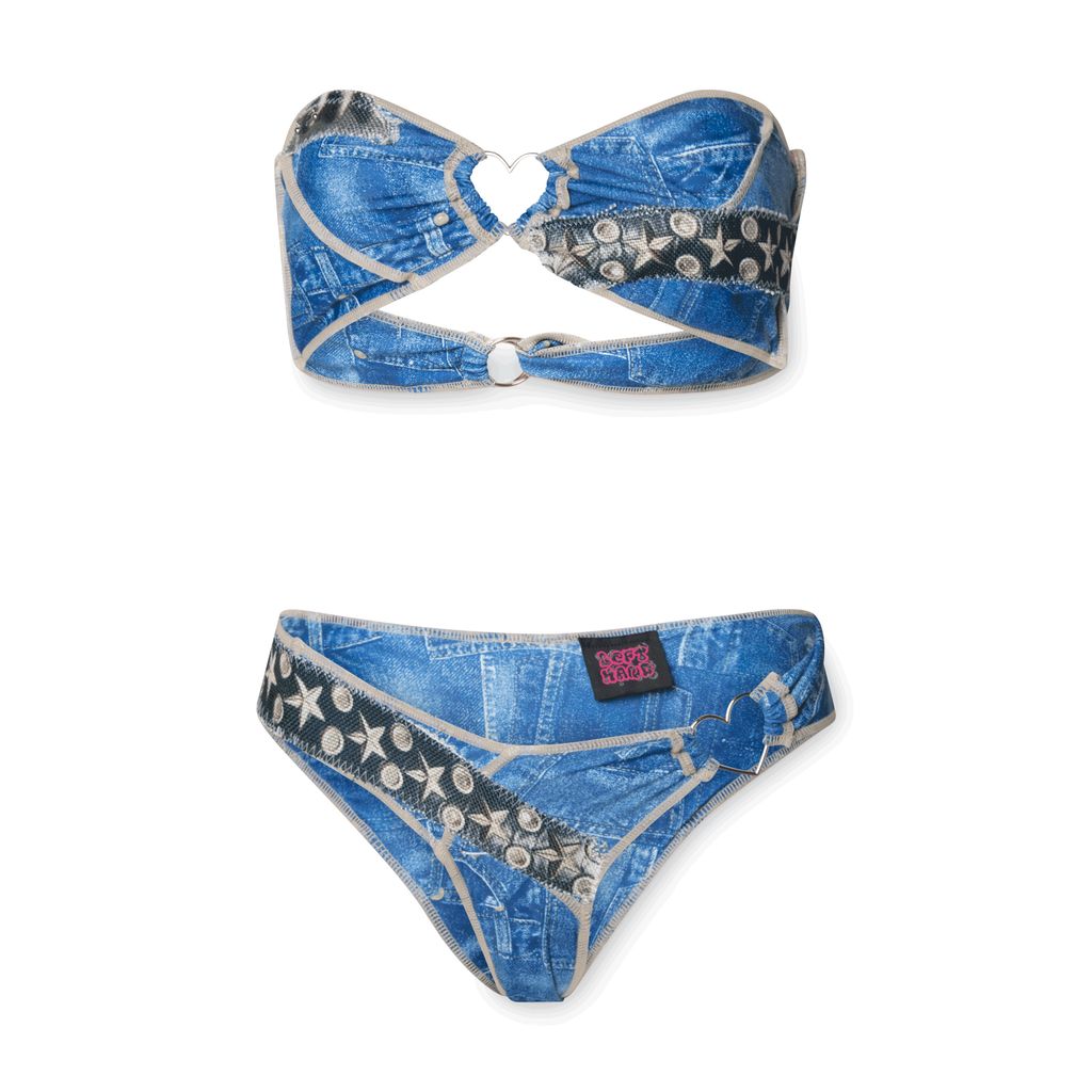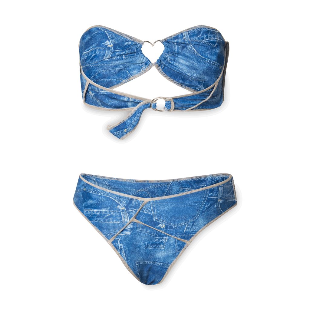 Denim Bikini features false denim stretch material and decorative patches on both the top and bottoms.