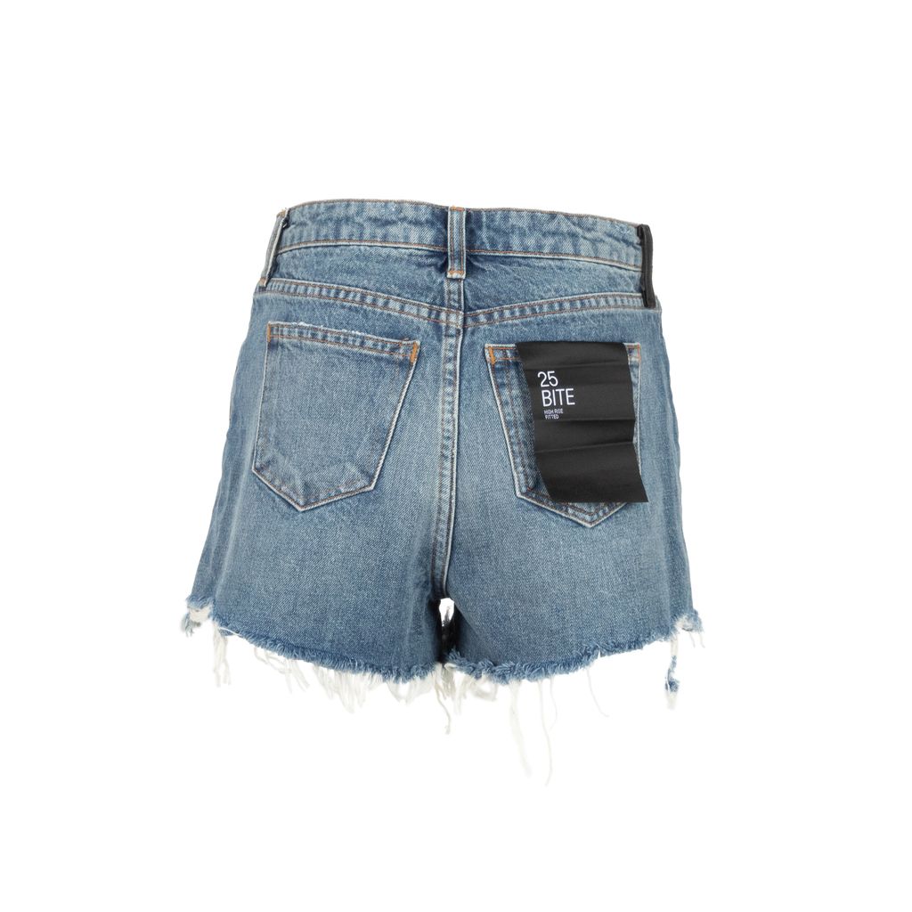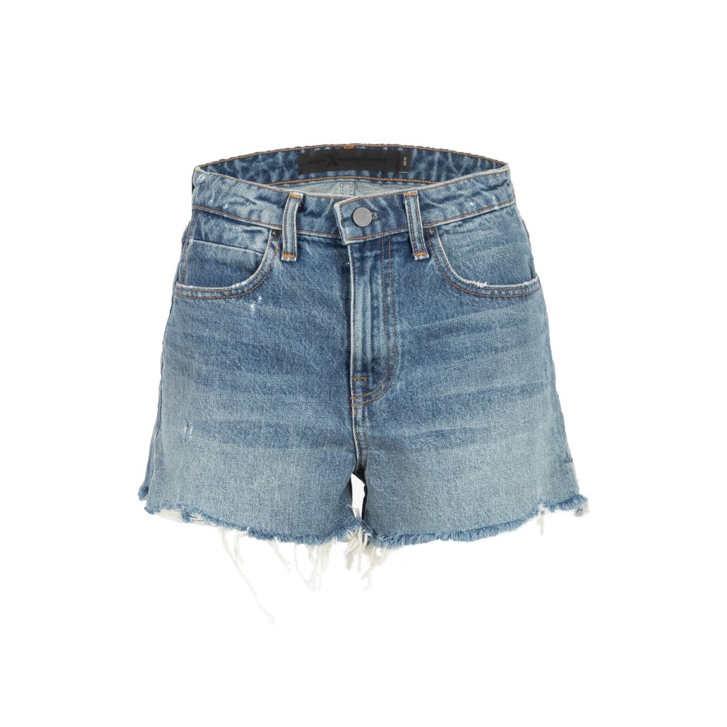 These high rise shorts from Alexander Wang's denim line are an elevated version of a well loved style. Features button and zip closure at waist, raw cutoff bottom hem, small slits on sides near bottom, and single leather belt loop.