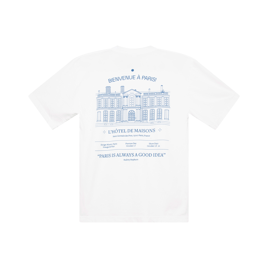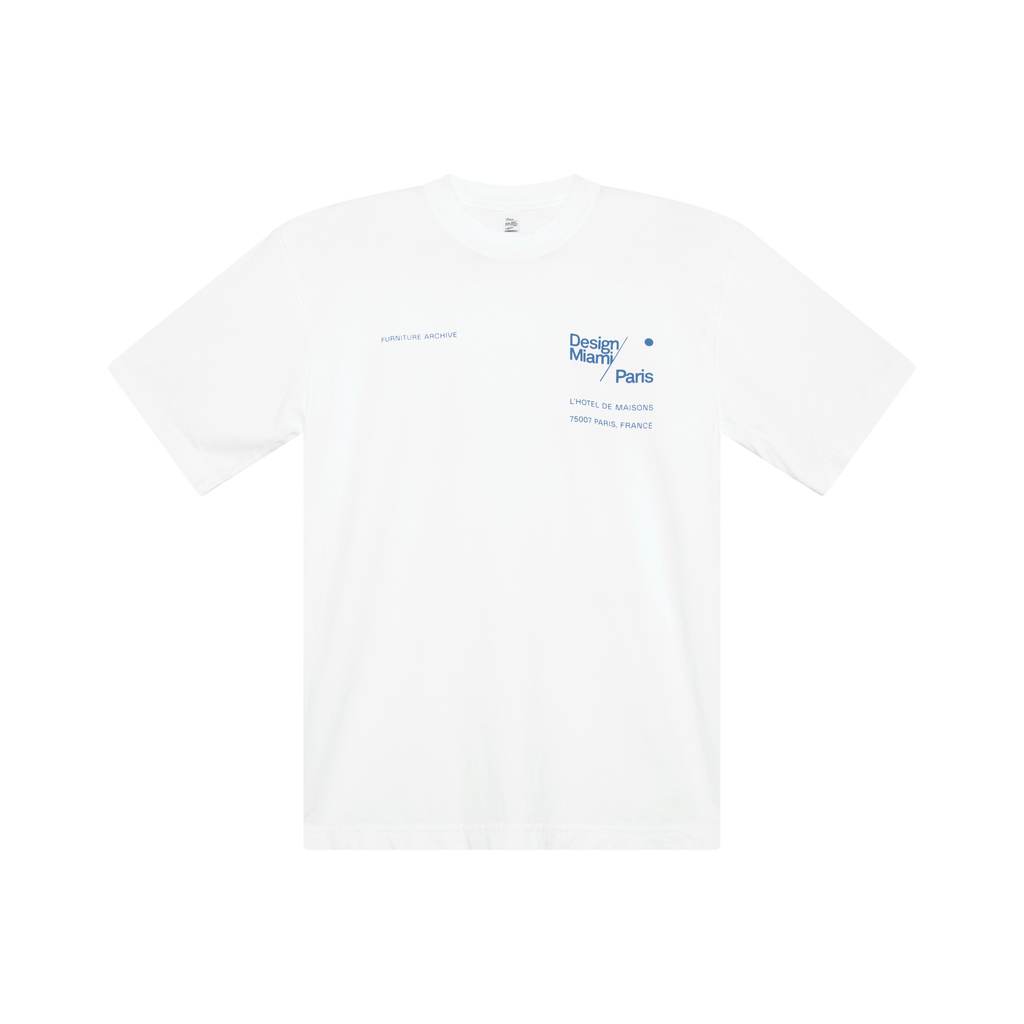 Design Miami/ Paris Tee features white tee with blue graphic on front and back. True to size, classic fit. Made in USA.