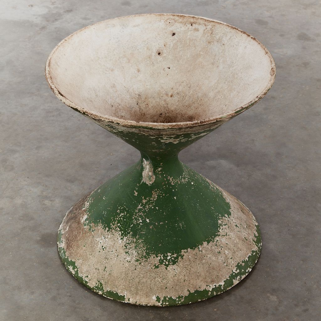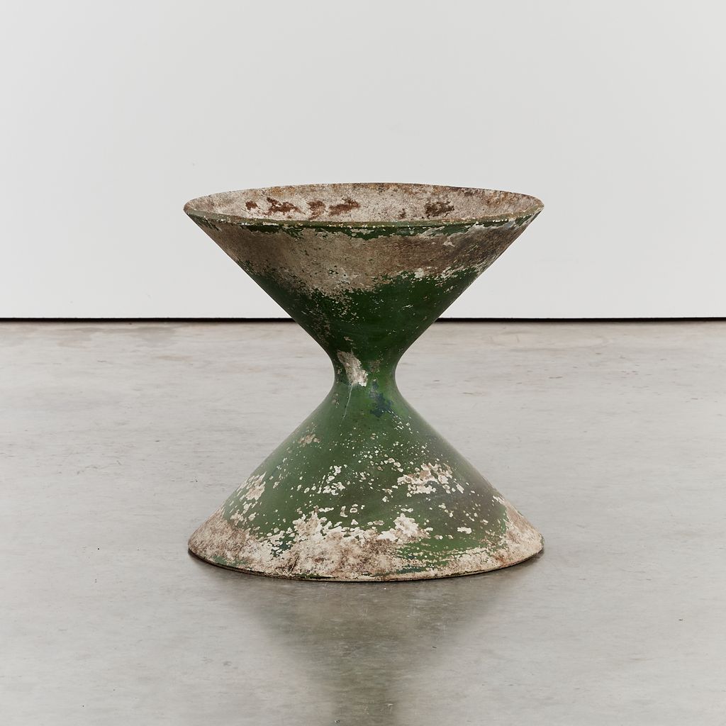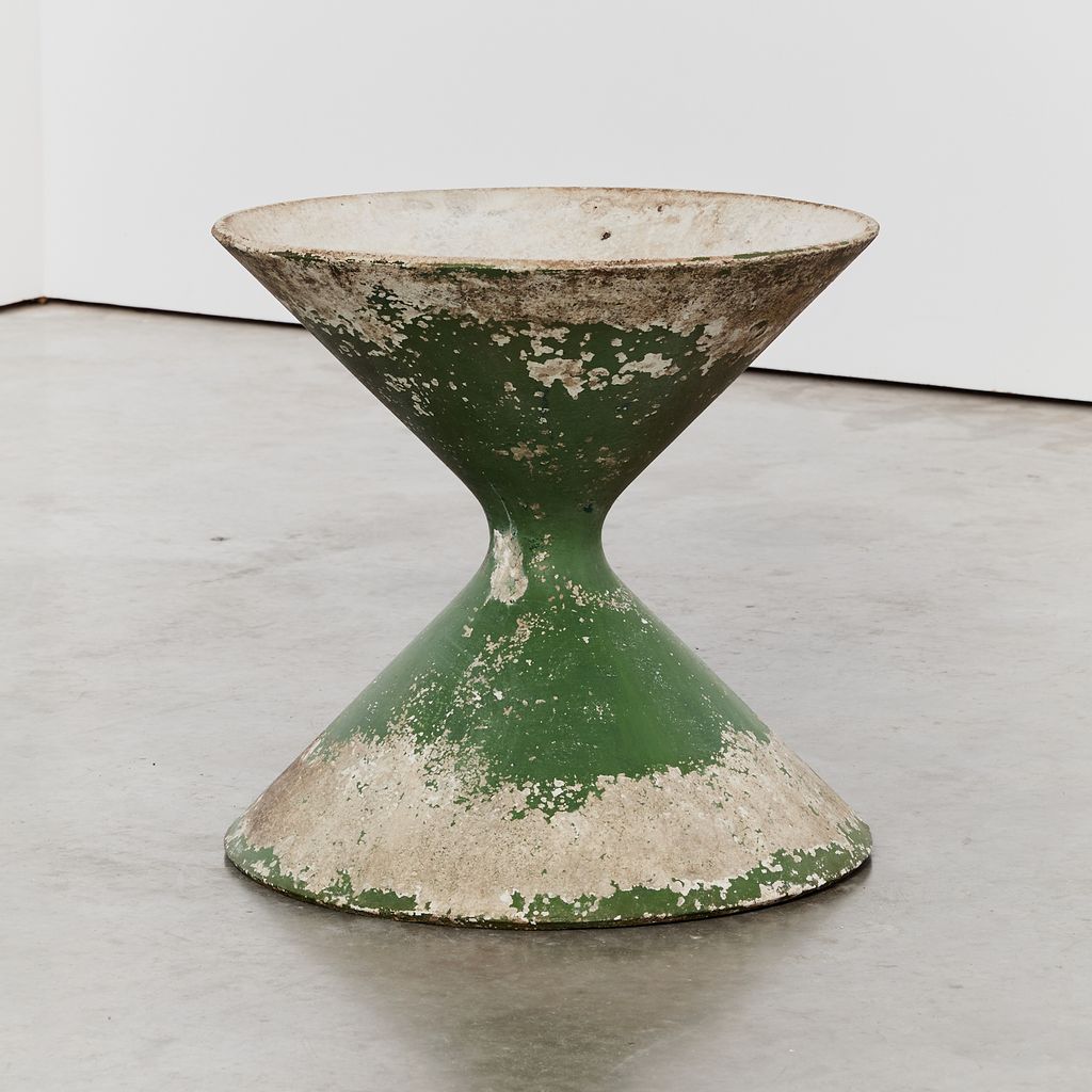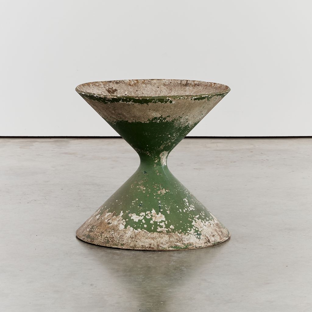 Diabolo planter with low proportions, by Willy Guhl for Eternit. Made from the controversial asbestos composite, this classic planter features a green paint patina.