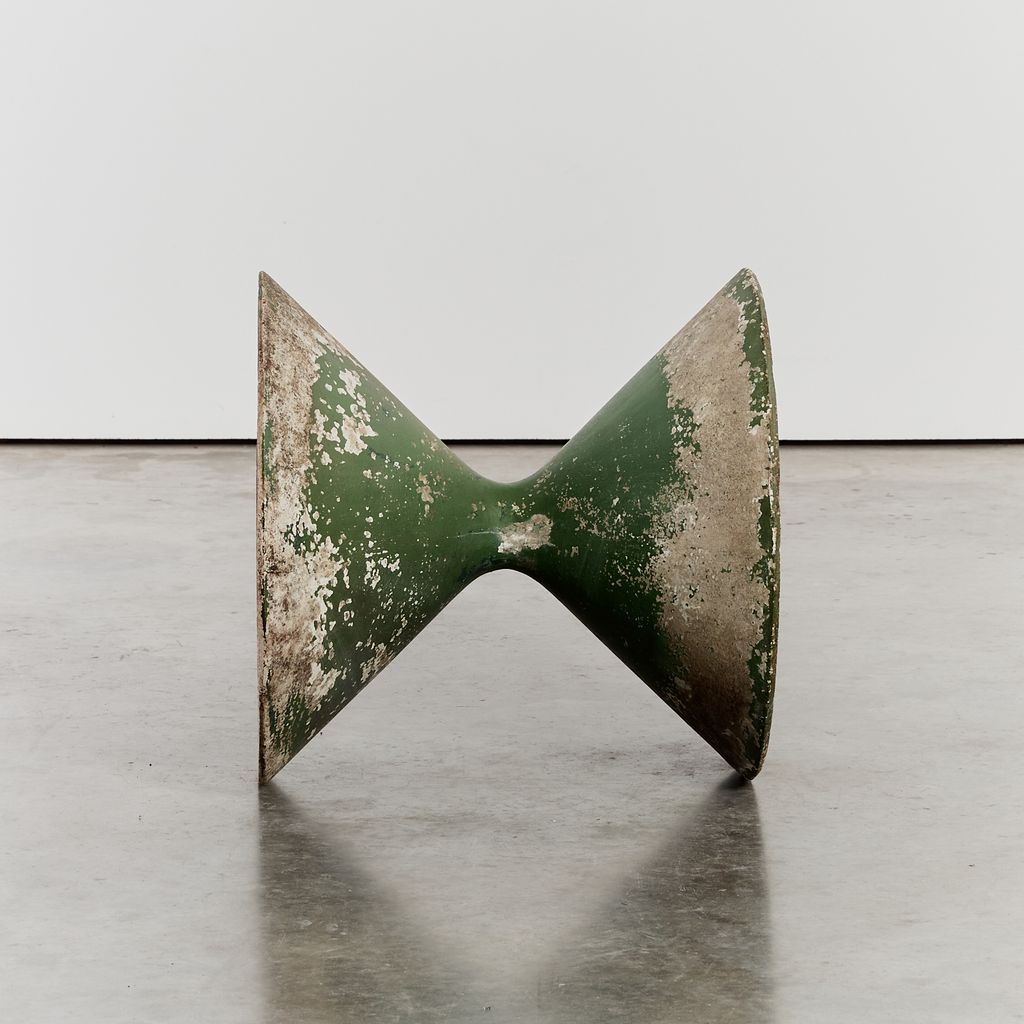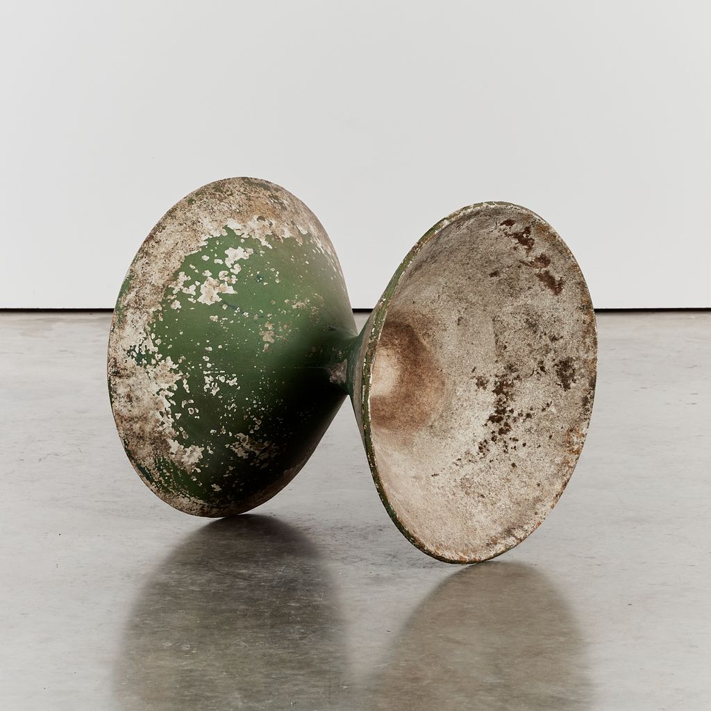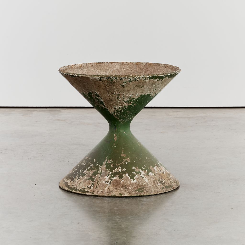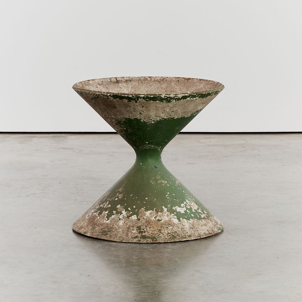 Diabolo planter with low proportions, by Willy Guhl for Eternit. Made from the controversial asbestos composite, this classic planter features a green paint patina.