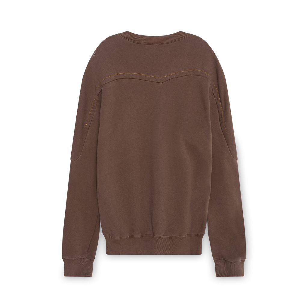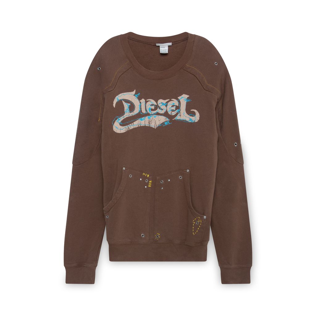 Diesel Brown Grommeted Crewneck features graphic and blue embroidery on chest, 2 front pockets, yellow contrast stitching, and grommet design all over.