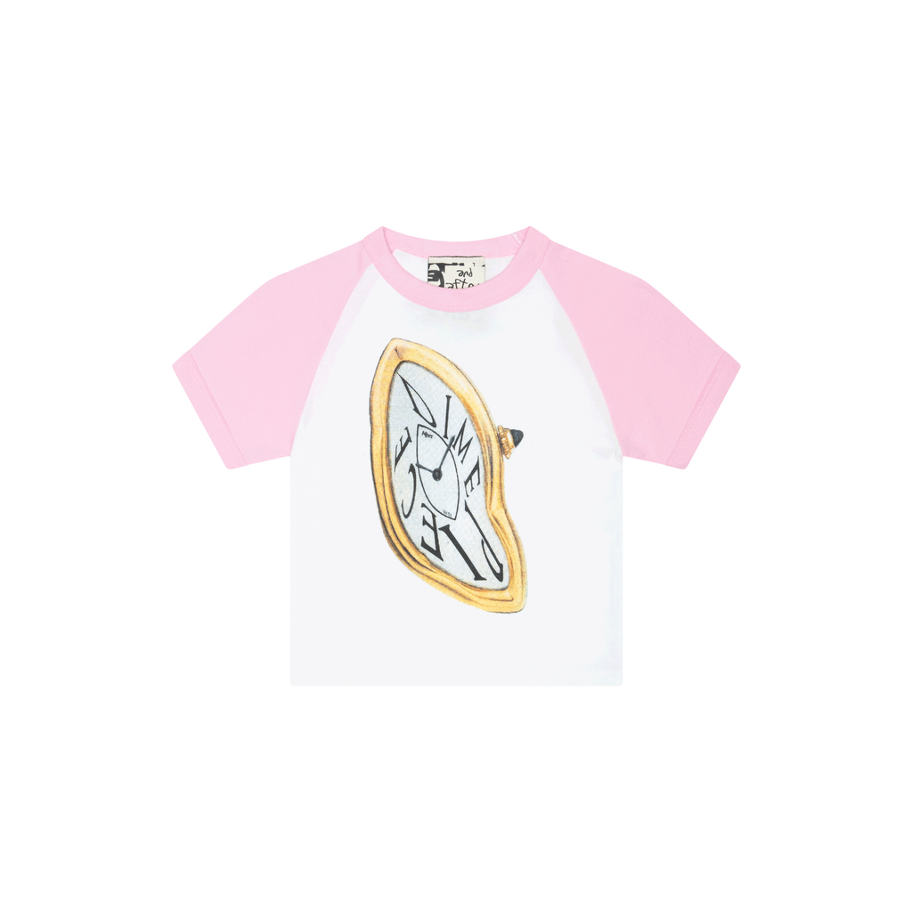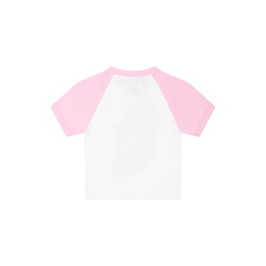 Dime Piece Baby Tee features raglan sleeves and graphic on front.