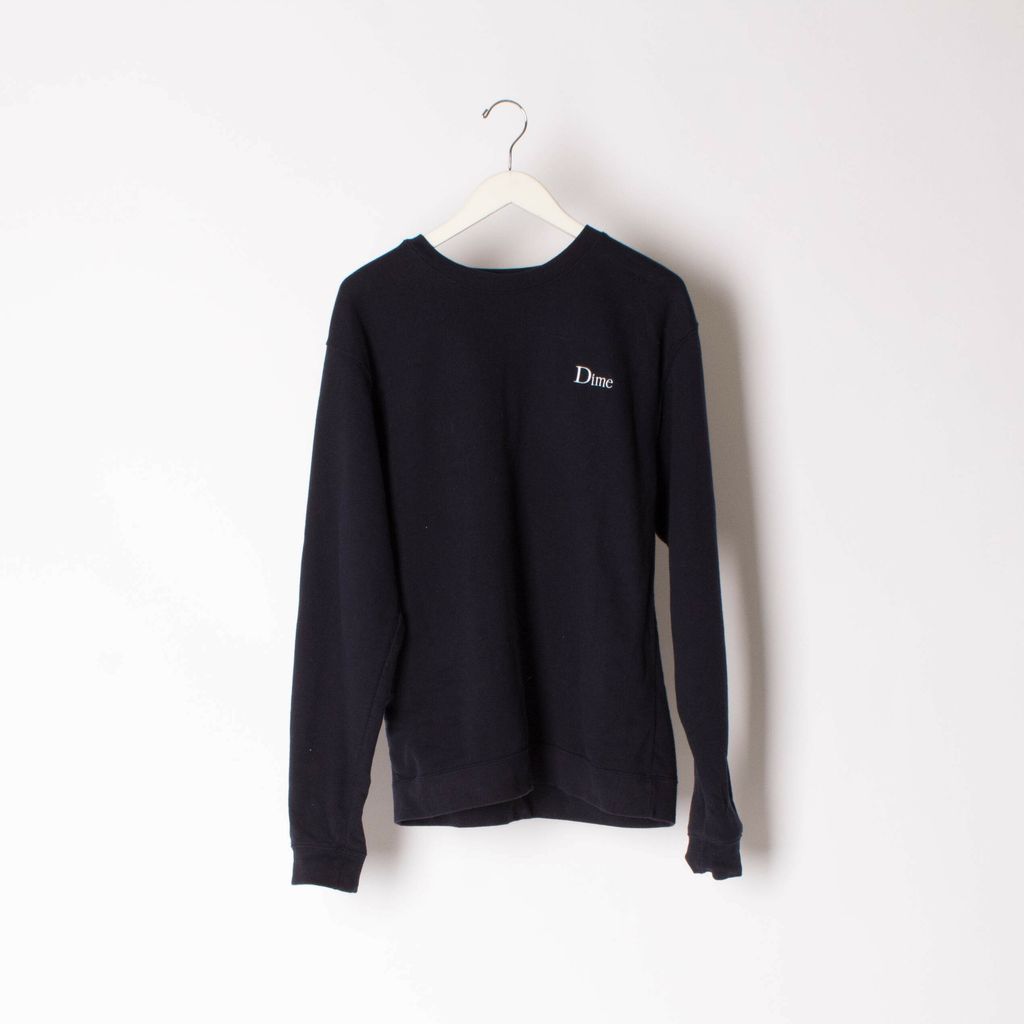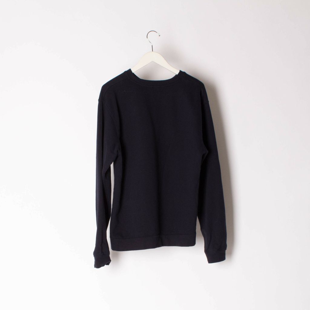 Black 80% cotton pullover sweatshirt with white font on the front breast. Size M.