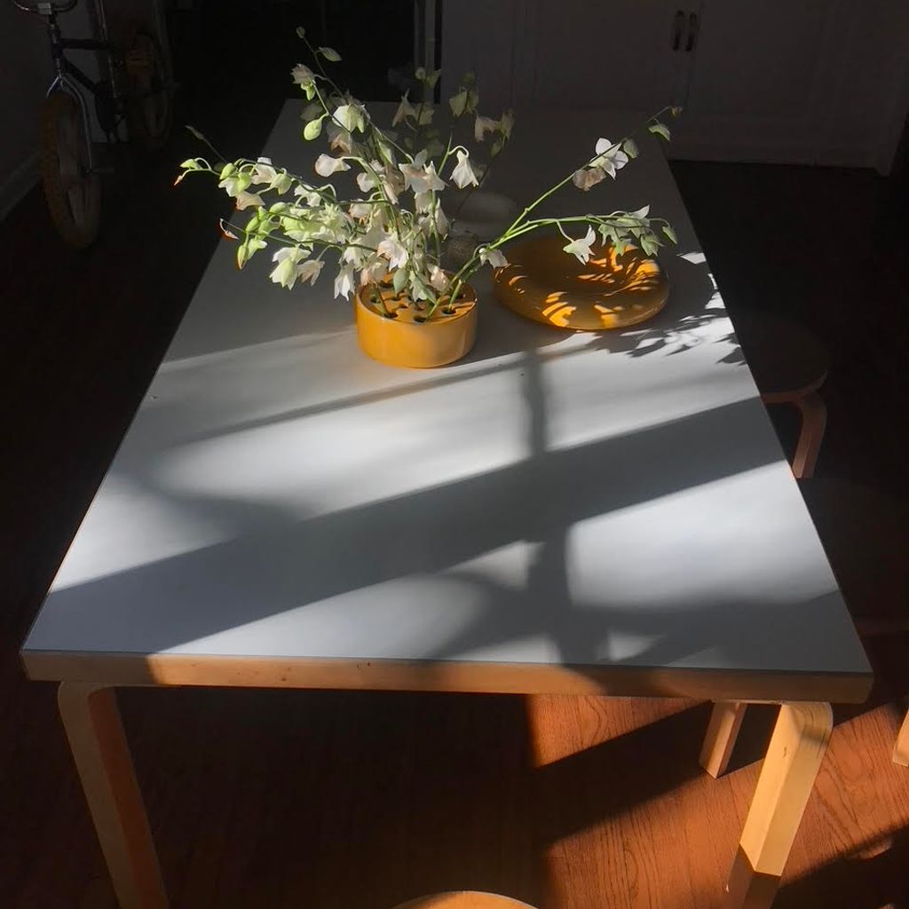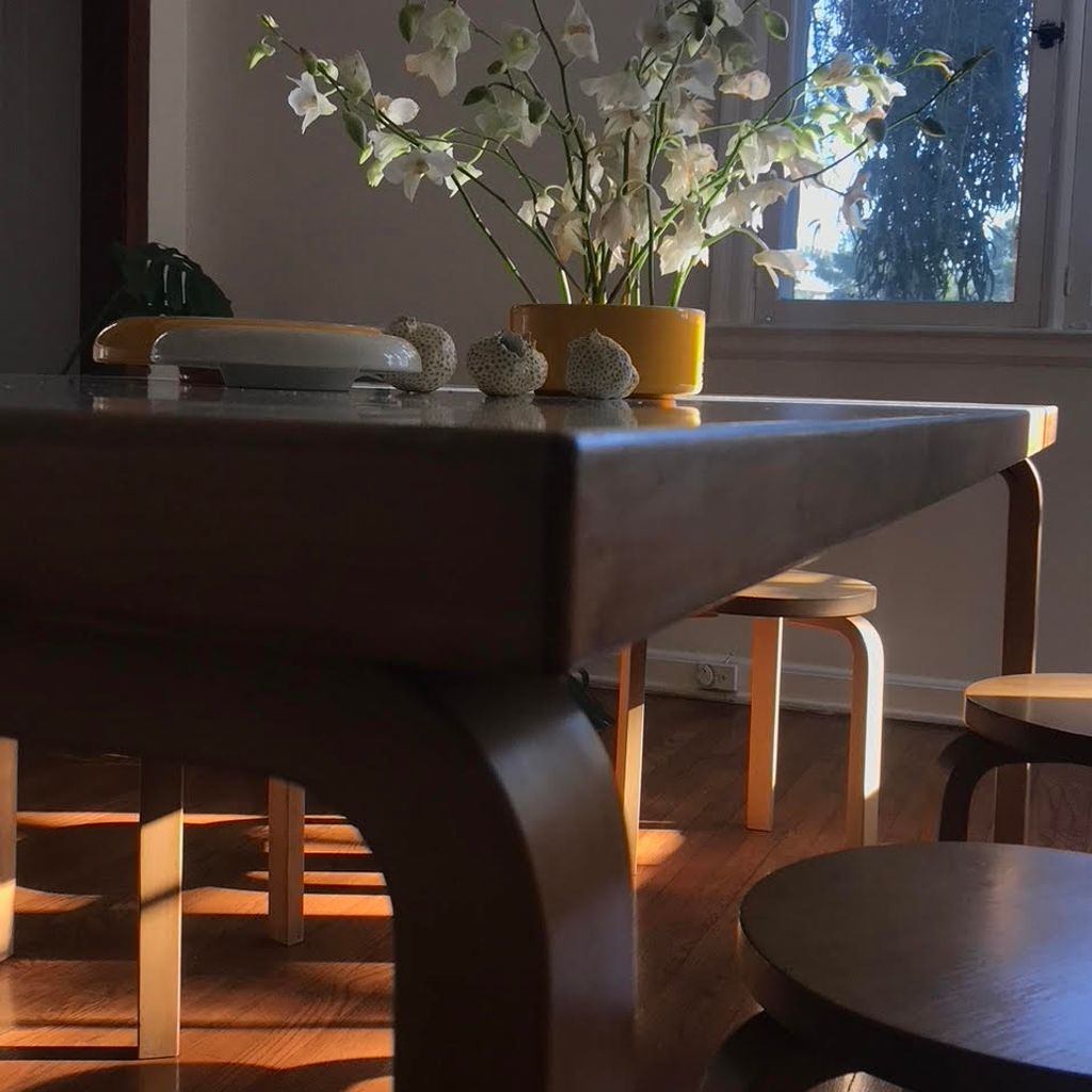 Dining table by Alvar Aalto, c.1980s. The table features a rectangular laminate top that sits atop bent birch wood legs. This design features Aalto's signature method of joining table tops to table legs, by mounting with screws from underneath.