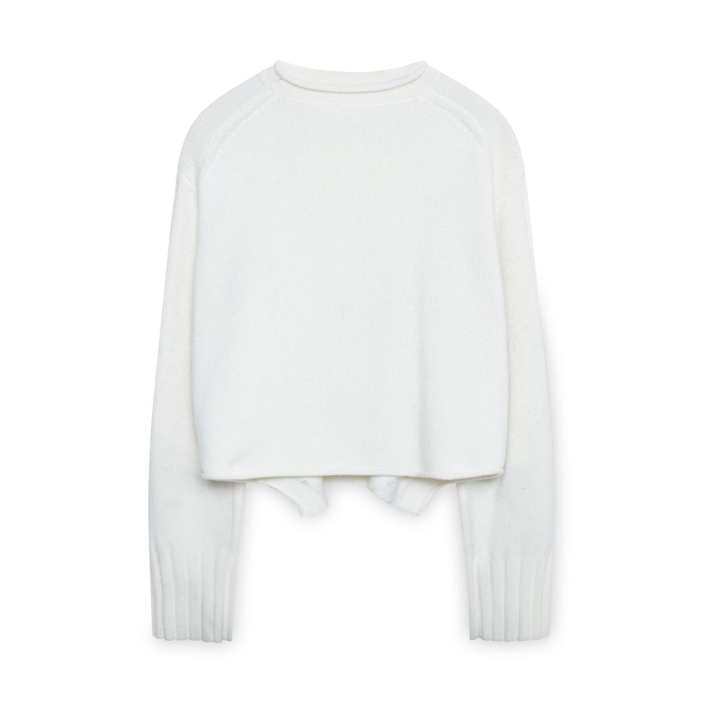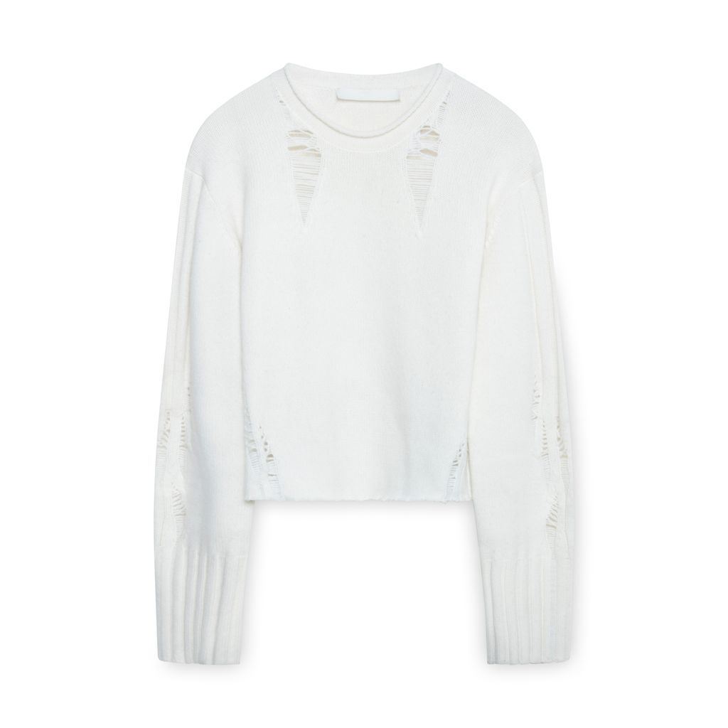 Dion Lee Distressed Knit Sweater features distressing along neckline, sides, and arms, rollover neck, wide ribbed arm cuffs, and raw cropped hem.