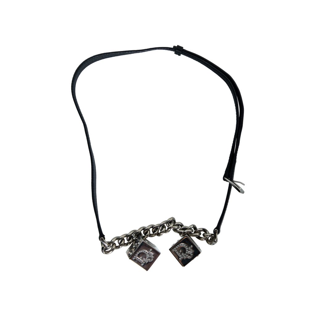 Dior Black Leather Dice Belt features silver hardware, embellished logo dice adornments, and buckle closure at front.