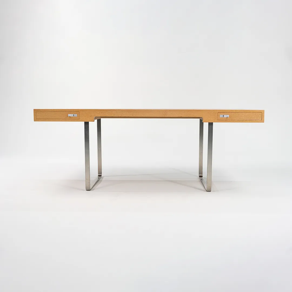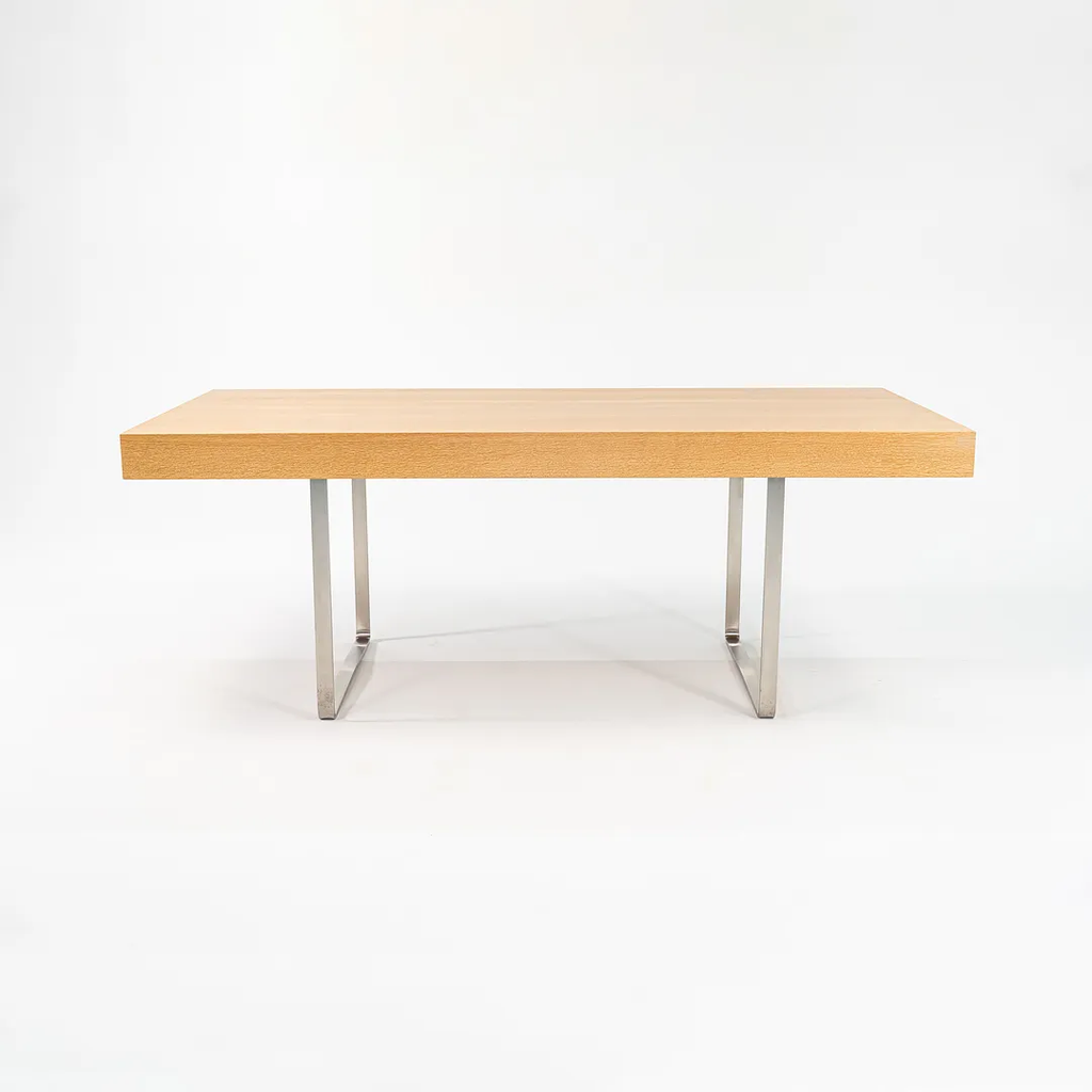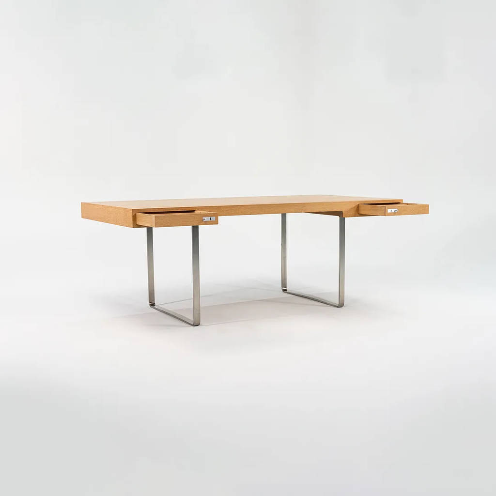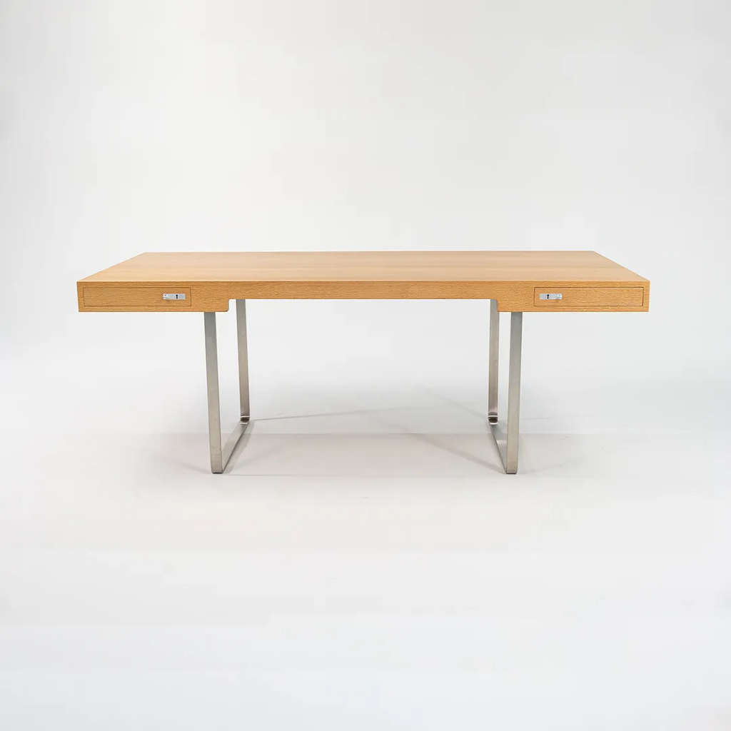This is a CH110 Desk made with an oak top and stainless steel base. The desk, designed by Hans Wegner and produced by Carl Hansen & Son in Denmark, dates to circa 2021 and is guaranteed as authentic. Condition is excellent with minimal visible wear. The desk arrived to us with a couple of small veneer issues. We have since taken it to a master cabinet maker, who repaired it with matching veneer inlay and blended the finish to match. After getting it back, I had a hard time locating where the veneer issues were, but I believe they were on the sides. We acquired this directly from Carl Hansen (it was a display model).