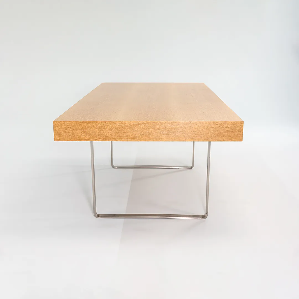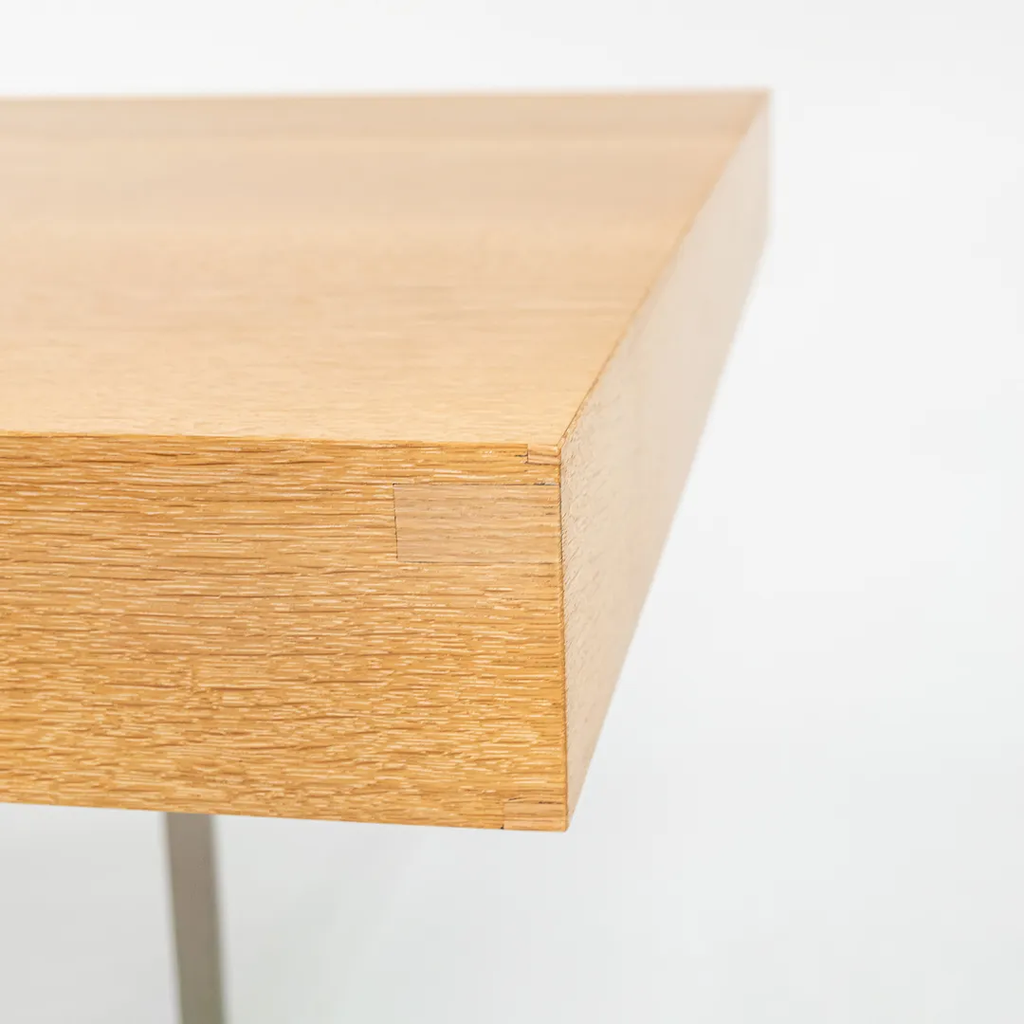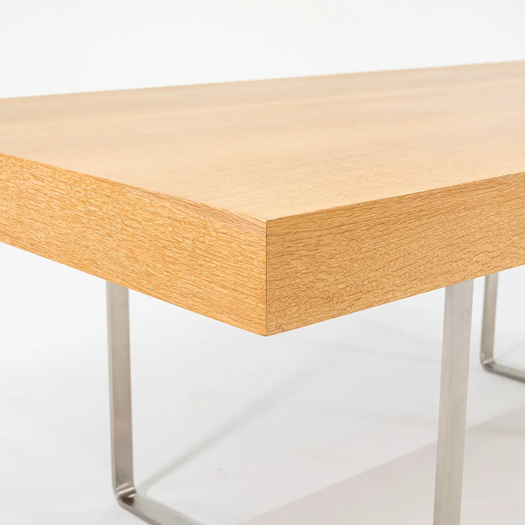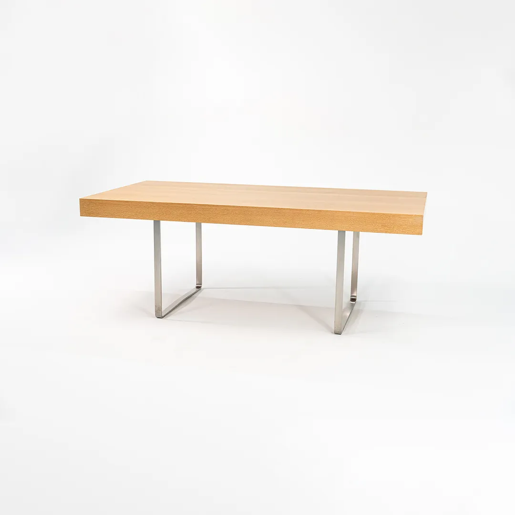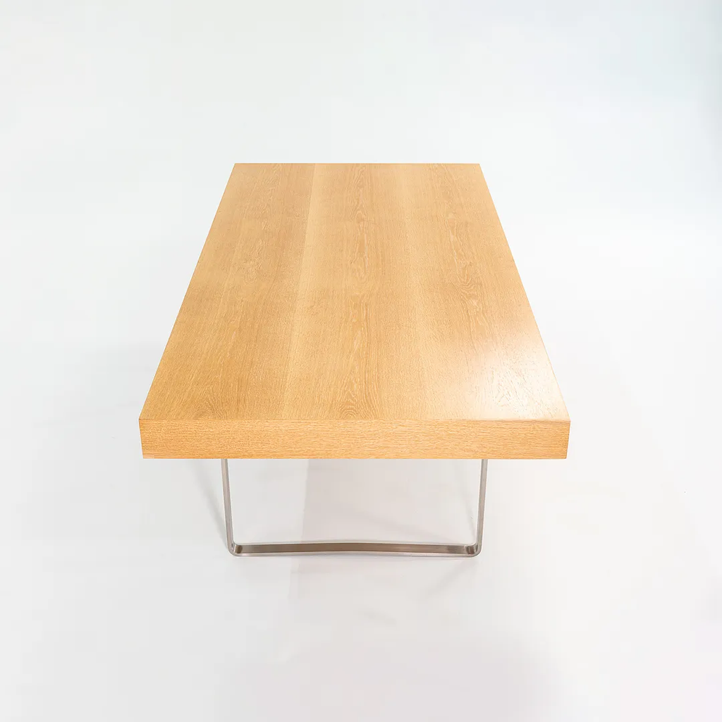 This is a CH110 Desk made with an oak top and stainless steel base. The desk, designed by Hans Wegner and produced by Carl Hansen & Son in Denmark, dates to circa 2021 and is guaranteed as authentic. Condition is excellent with minimal visible wear. The desk arrived to us with a couple of small veneer issues. We have since taken it to a master cabinet maker, who repaired it with matching veneer inlay and blended the finish to match. After getting it back, I had a hard time locating where the veneer issues were, but I believe they were on the sides. We acquired this directly from Carl Hansen (it was a display model).