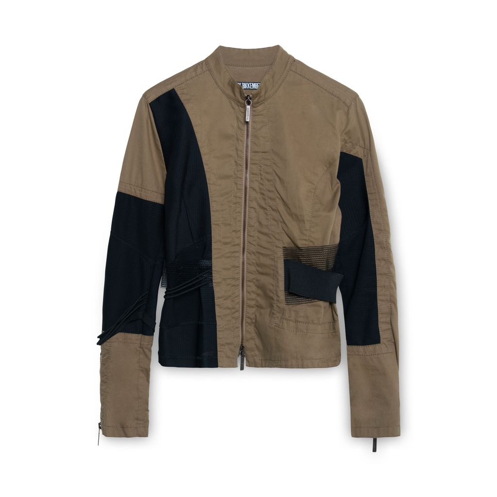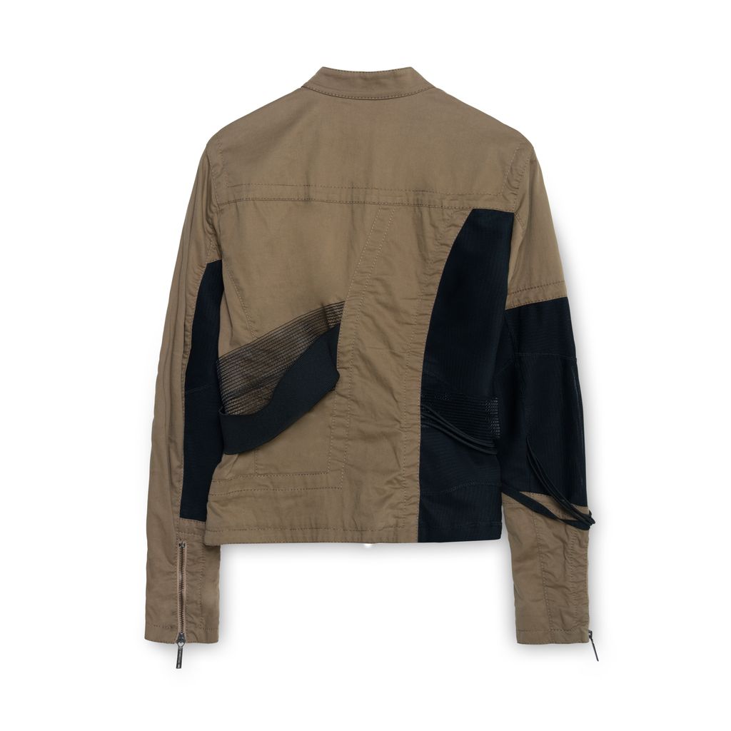 Dirk Bikkembergs Y2K biker inspired cotton jacket features mesh contrast details throughout, mock collar, and zipper closure at front.