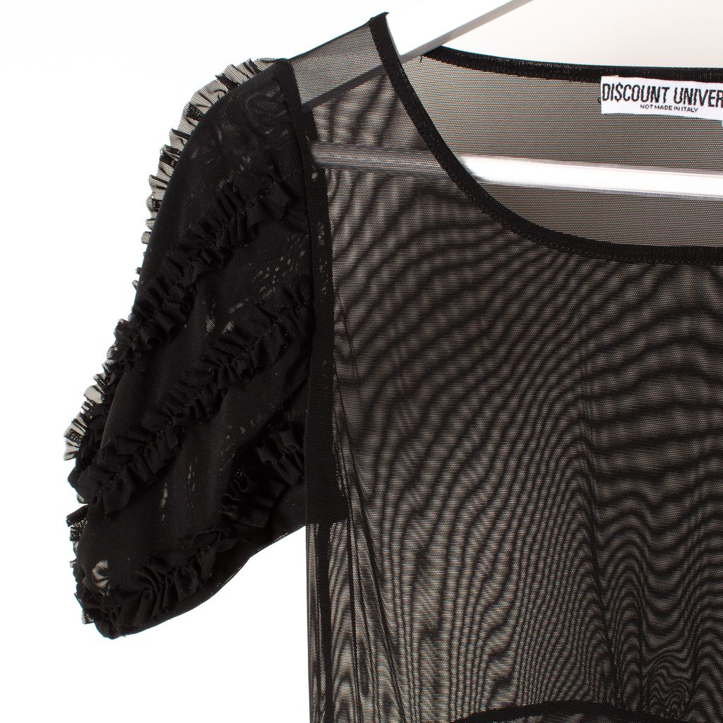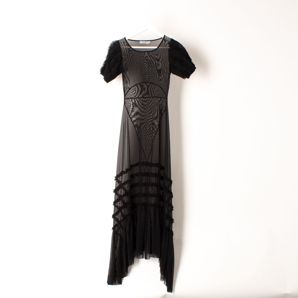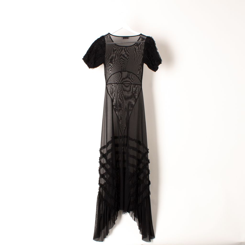 Like new, Miss World dress from Discount Universe. Inspired by the feminine silhouettes of the 1930s, this soft mesh layering piece can be worn over a high-waisted bikini, slip dress or alternatively; jeans and a tank. It has a small cap sleeve with vertical ruffles and the hem is gathered with horizontal decorative mini-frills. The neck-line is a low crew cut and the back features a diagonal seam to highlight the waist. 100% nylon.