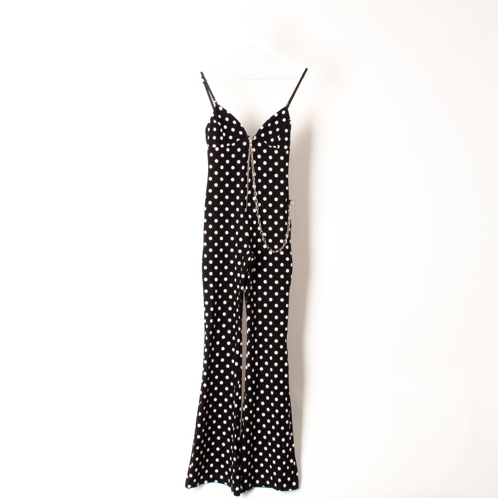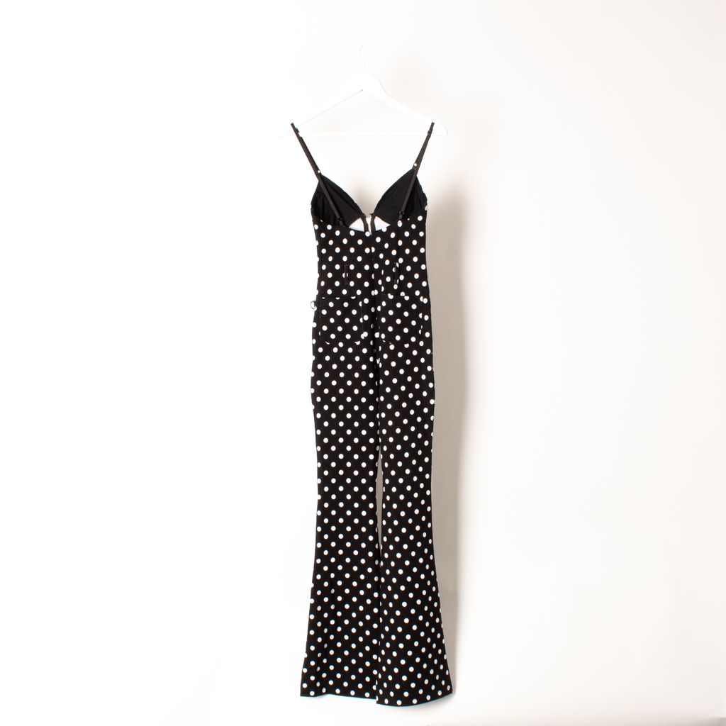 Like new jumpsuit from Discount Universe. Jumpsuit is a flared and flattering one-piece with a bralette top and waist cinching belt in a cute polka dot print. The fabric is strong and provides good support and shape with lined cups and adjustable straps.