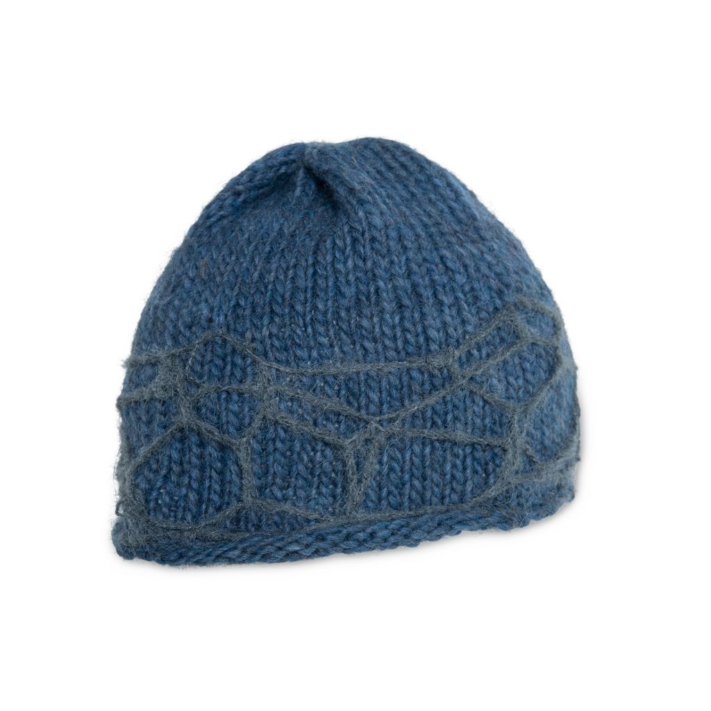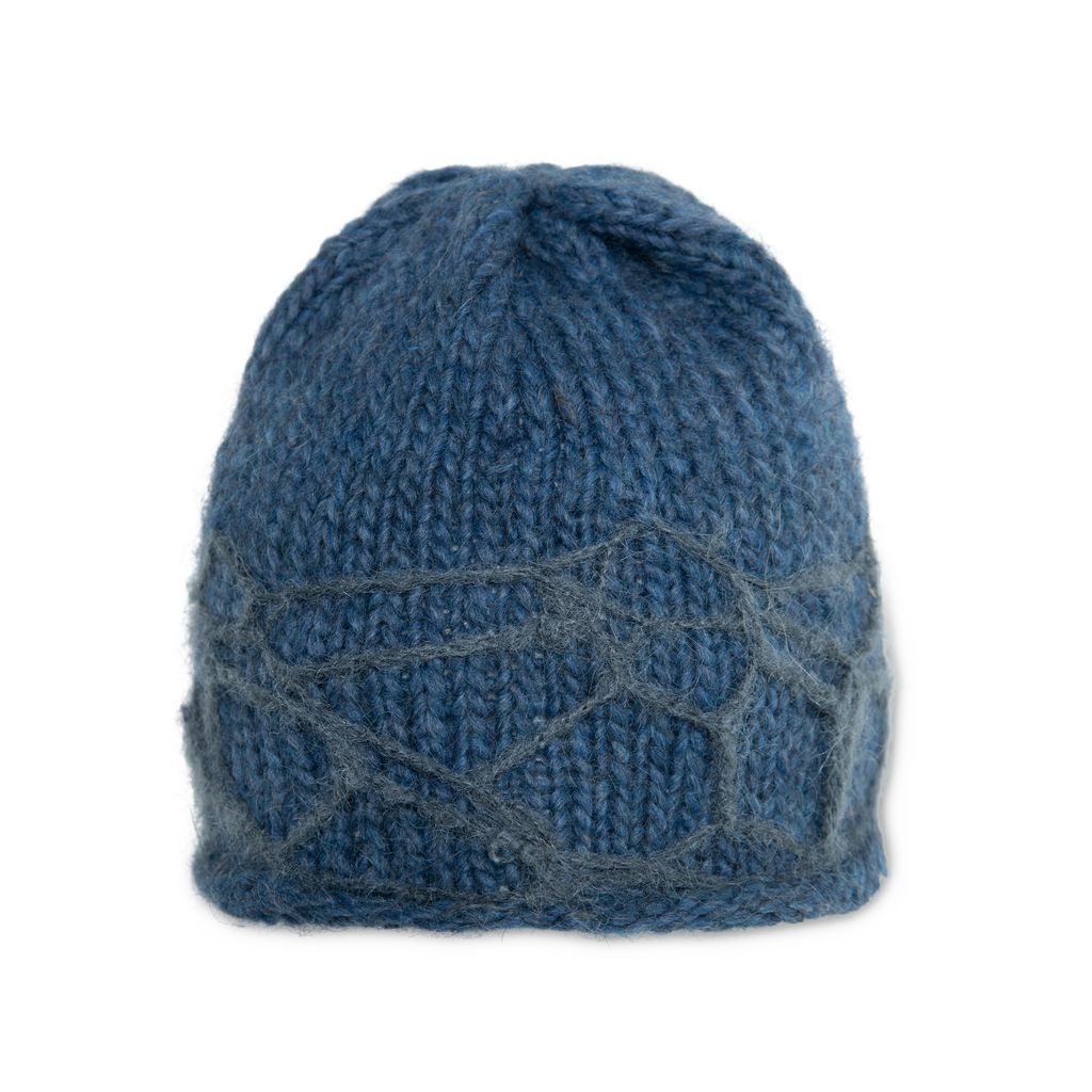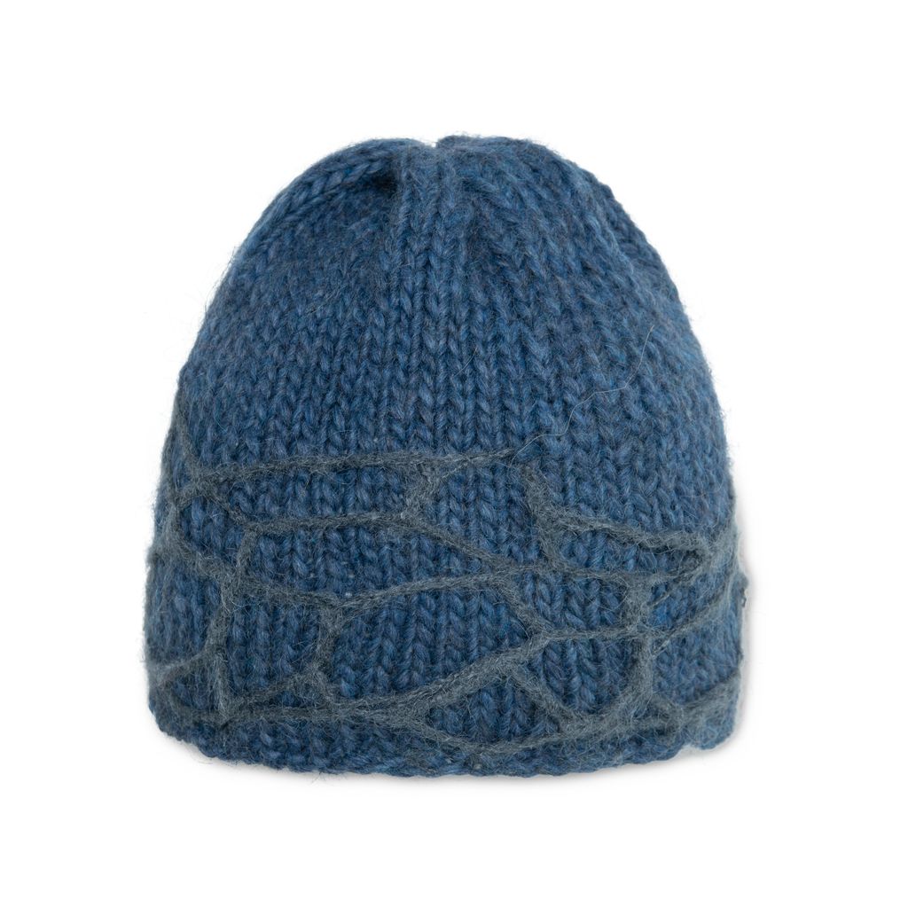 Distressed Beanie in Blue is a carefully knitted beanie with crocheted distressing pattern as the brim, a signature of String of Kisses.
