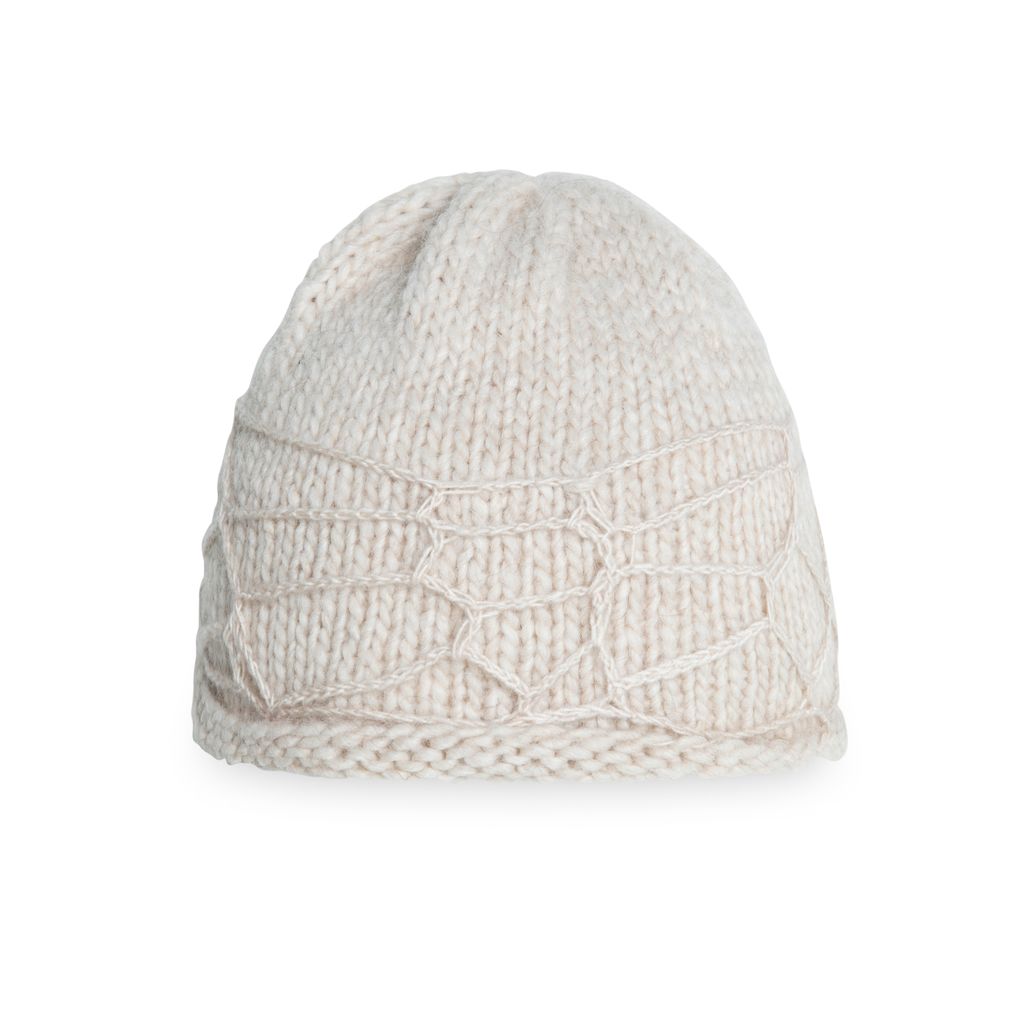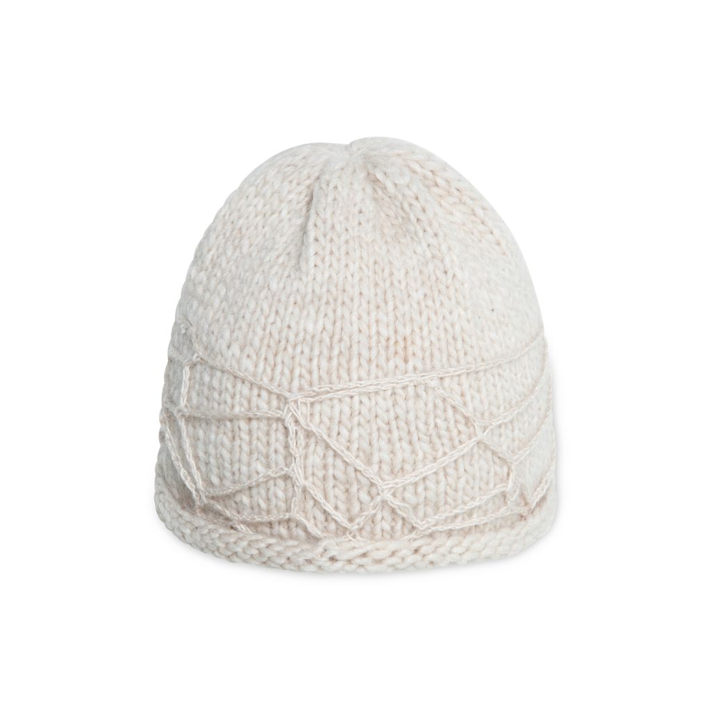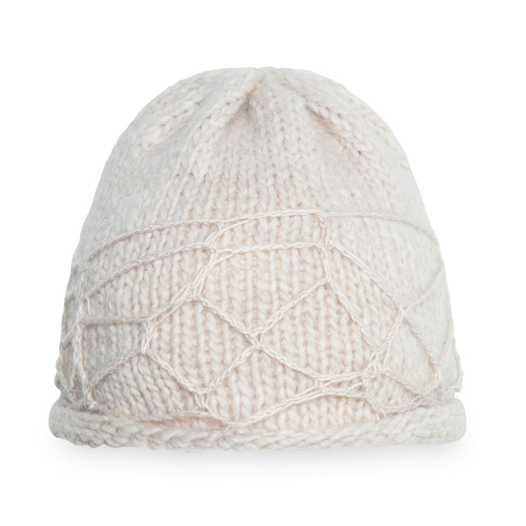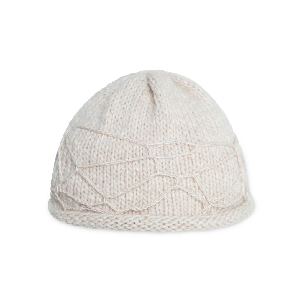 Distressed Beanie in Cream is a carefully knitted beanie with crocheted distressing pattern as the brim, a signature of String of Kisses.