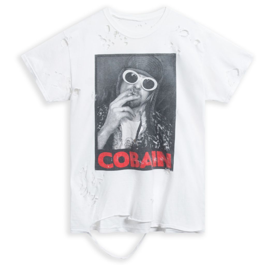 This heavily distressed Cobain tee features a front screen printed graphic and has a round neck finish. No sizing information available please refer to measurements below for sizing. In good vintage condition.