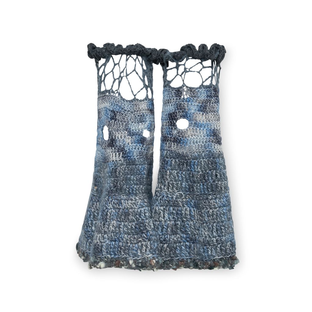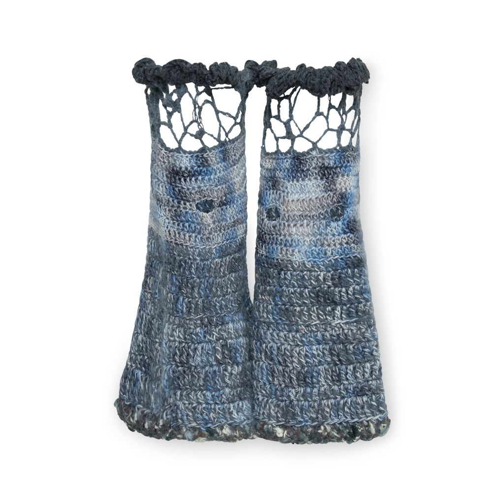 Distressed Leg Warmers in Pseudo Denim are carefully crocheted by hand, stitch by stitch. Leg warmers are flared at the bottom, giving a very flattering silhouette. Recommended to wear platforms so it sits nicely. Pair with a crocheted mesh shrug to complete your look.