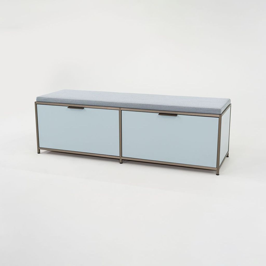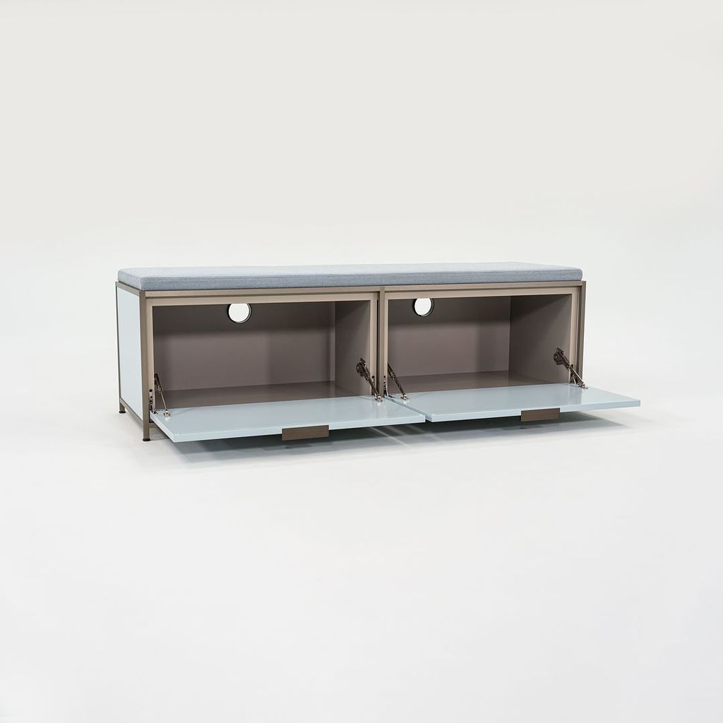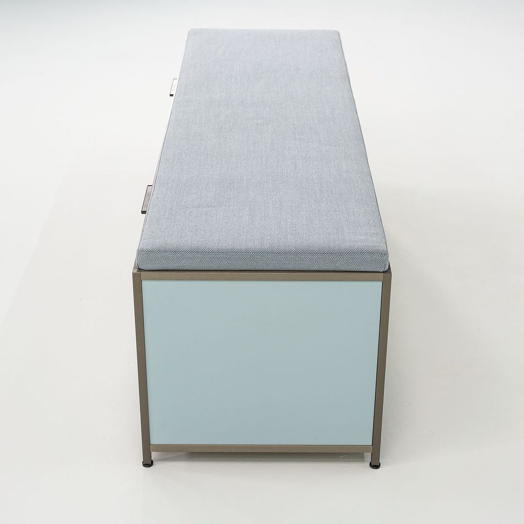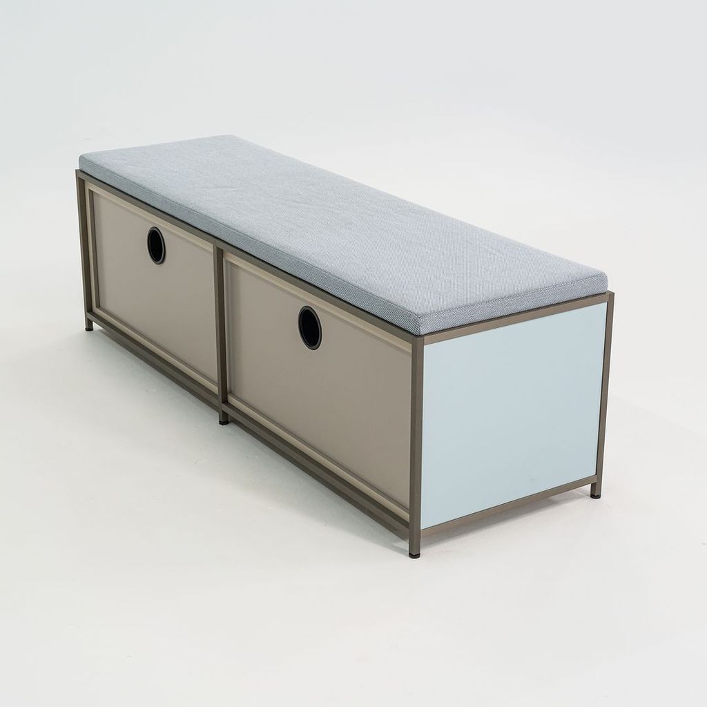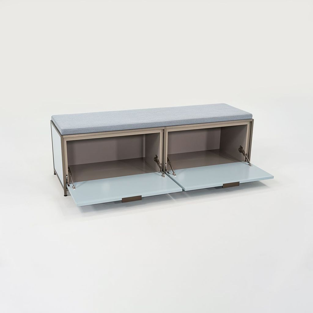Listed for sale is a Dita Bench Unit with two flap doors. The bench is made of light blue lacquered wood panels and an anodized aluminum frame with a blue grey wool fabric cushion. The bench was designed by Pagnon and Pelhaitre and produced by Ligne Roset in France. It was produced circa 2023 and is guaranteed as authentic. Condition is excellent. See photos. This came directly from Ligne Roset and was likely either used as a display model or was a showroom floor model.