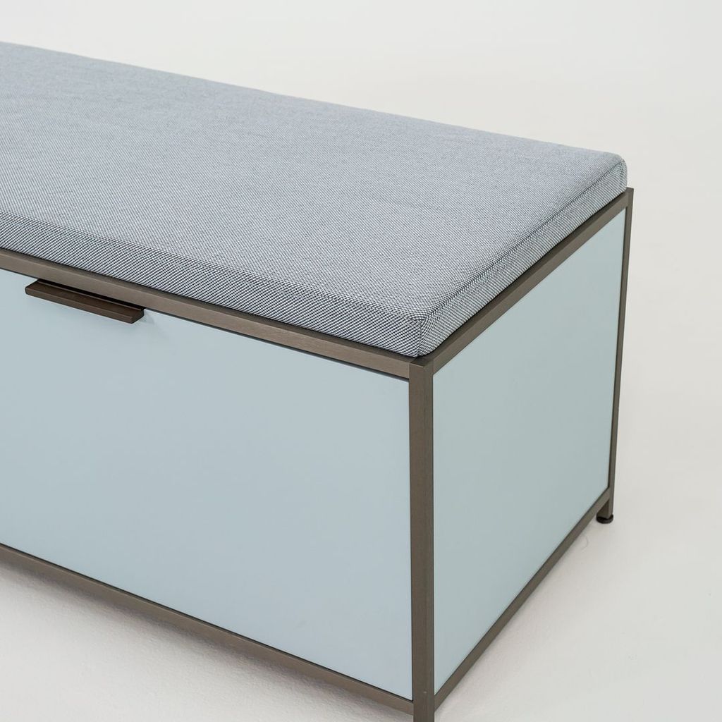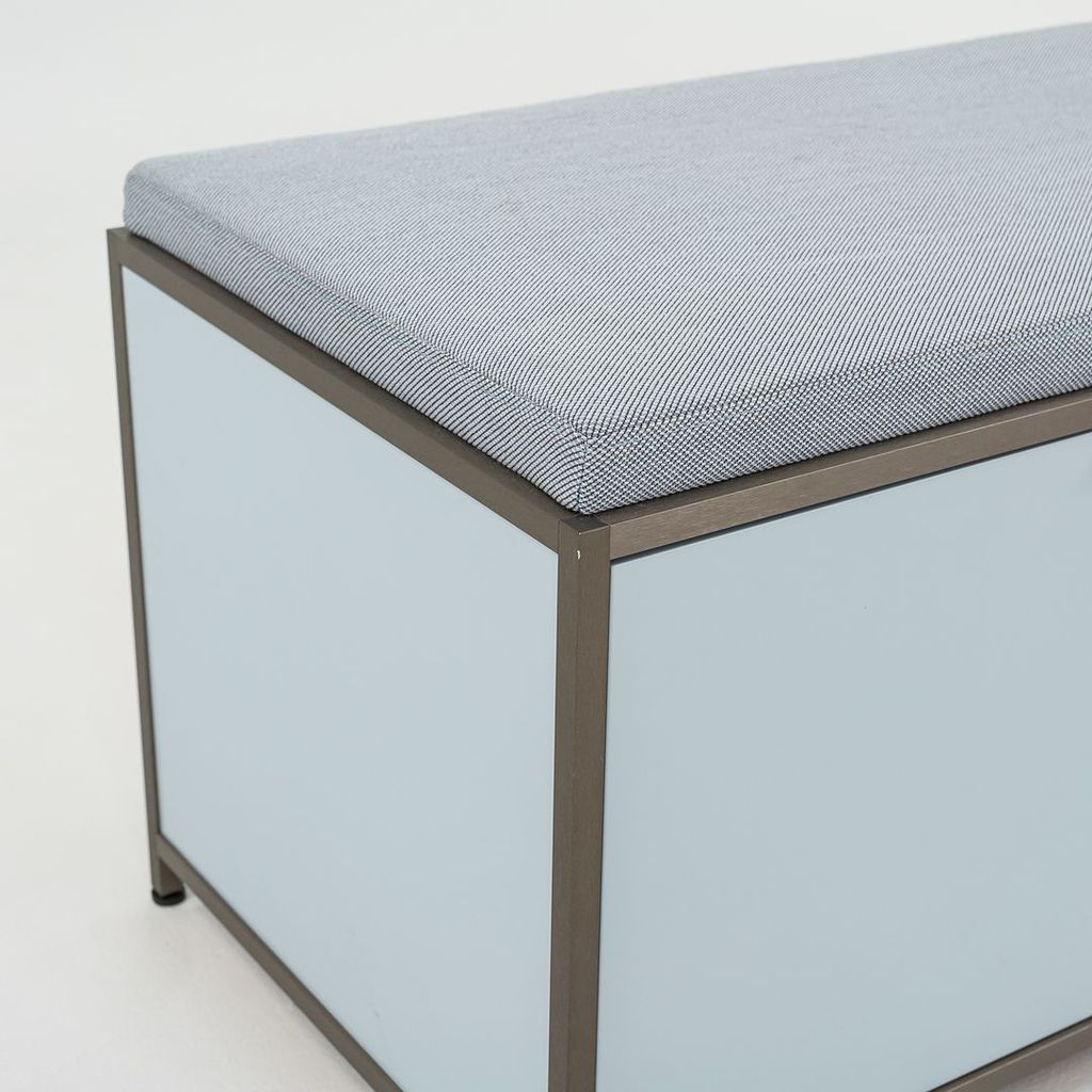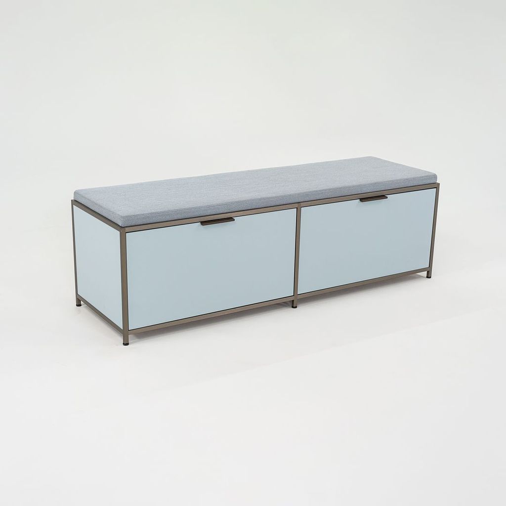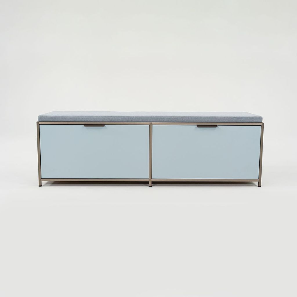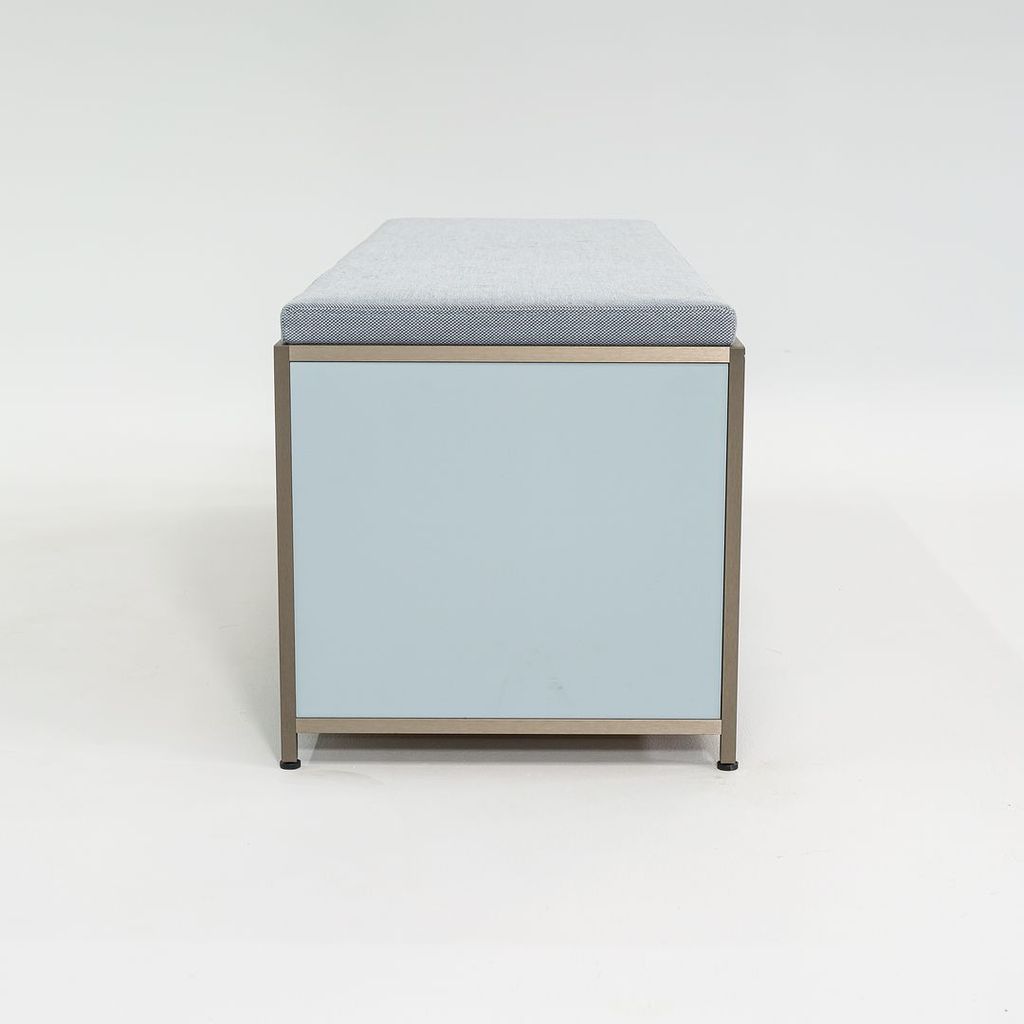 Listed for sale is a Dita Bench Unit with two flap doors. The bench is made of light blue lacquered wood panels and an anodized aluminum frame with a blue grey wool fabric cushion. The bench was designed by Pagnon and Pelhaitre and produced by Ligne Roset in France. It was produced circa 2023 and is guaranteed as authentic. Condition is excellent. See photos. This came directly from Ligne Roset and was likely either used as a display model or was a showroom floor model.