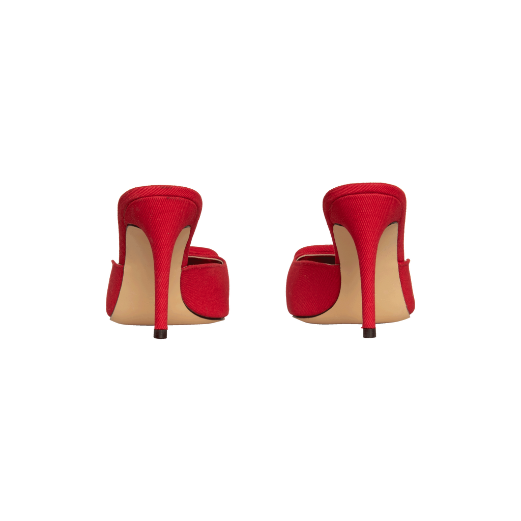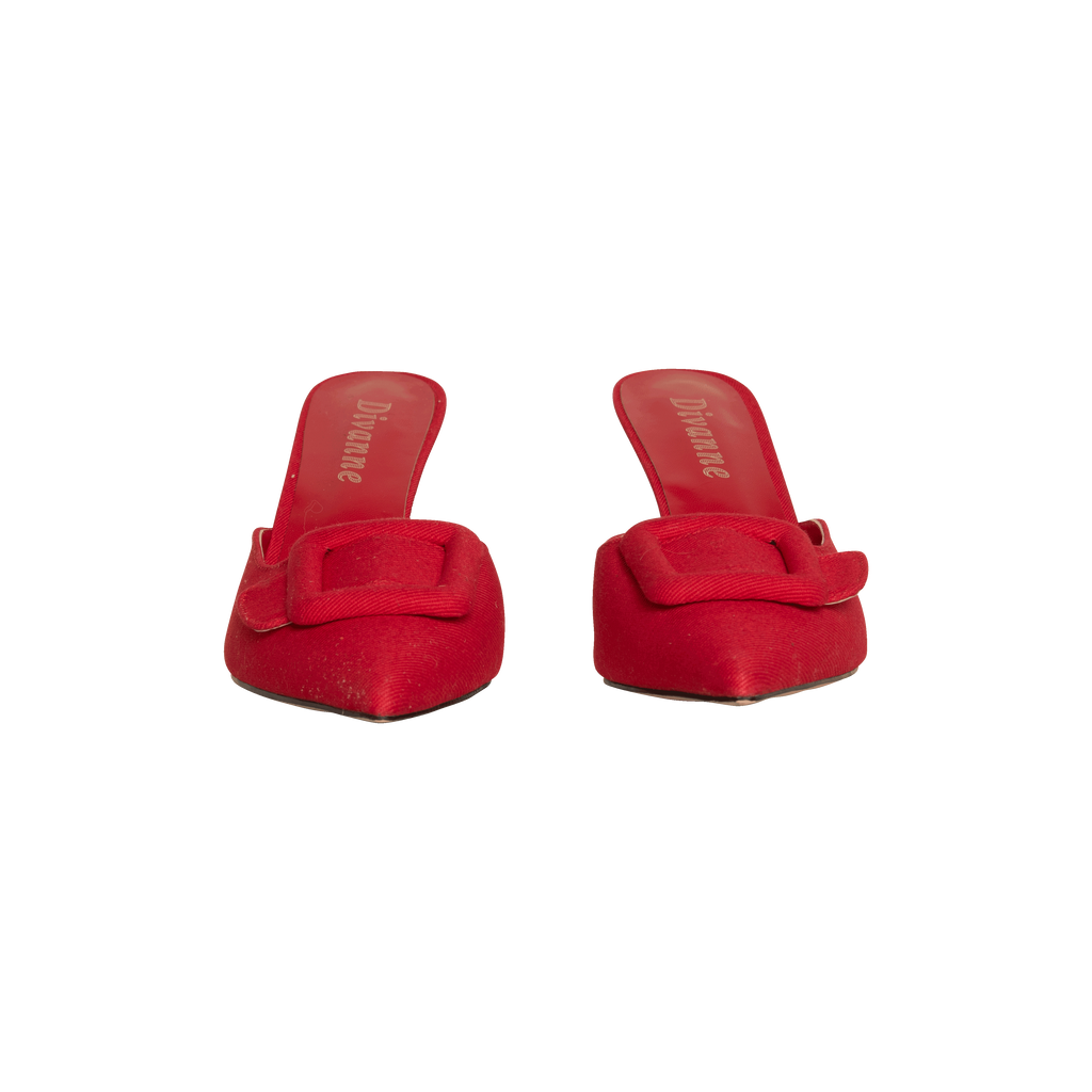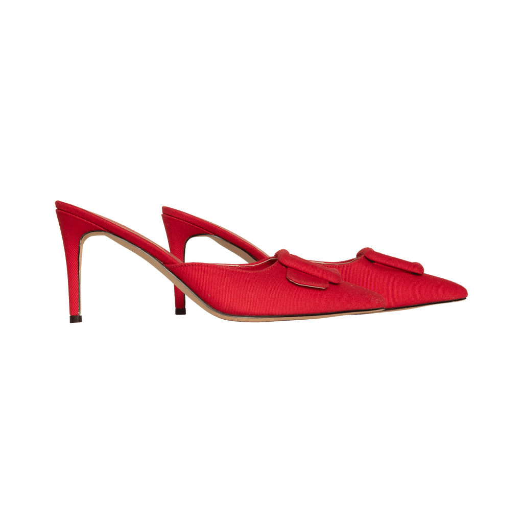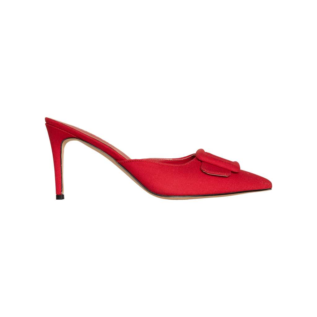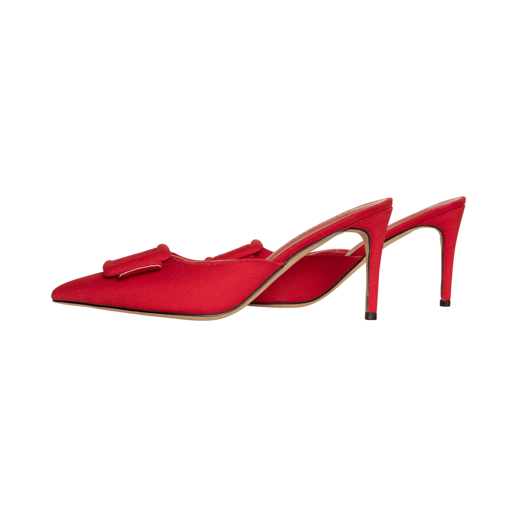 Divanne Red Denim Heels features buckle detail and pointed toe.