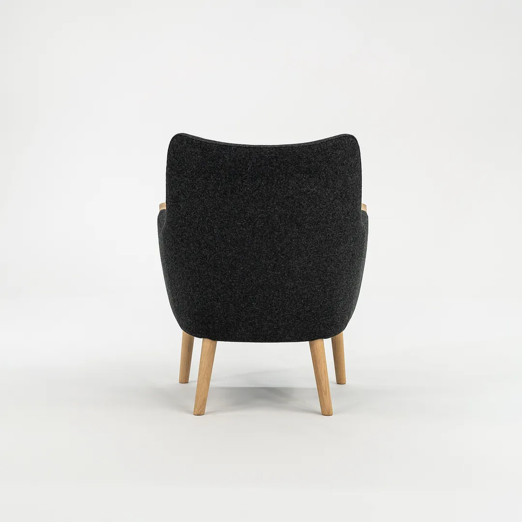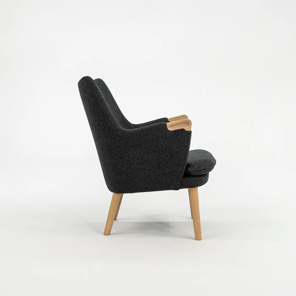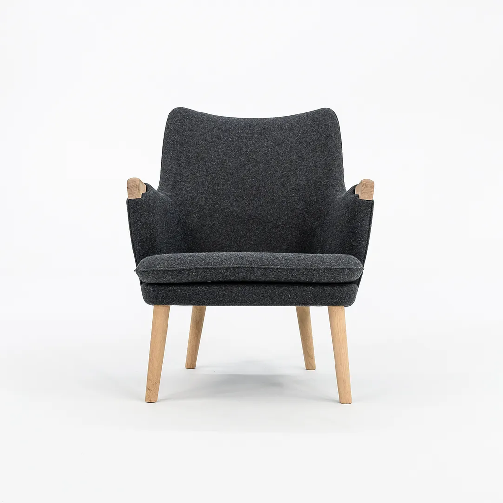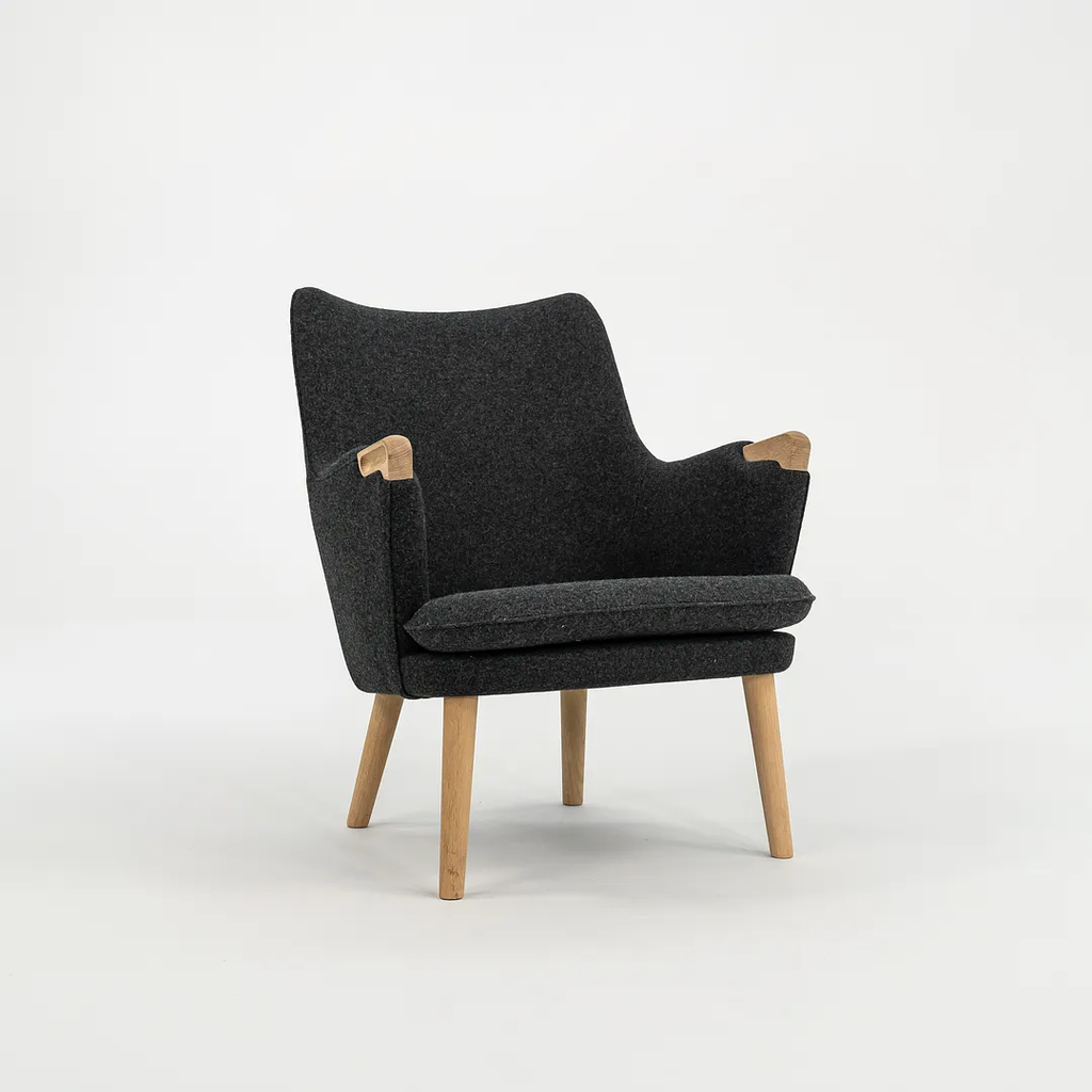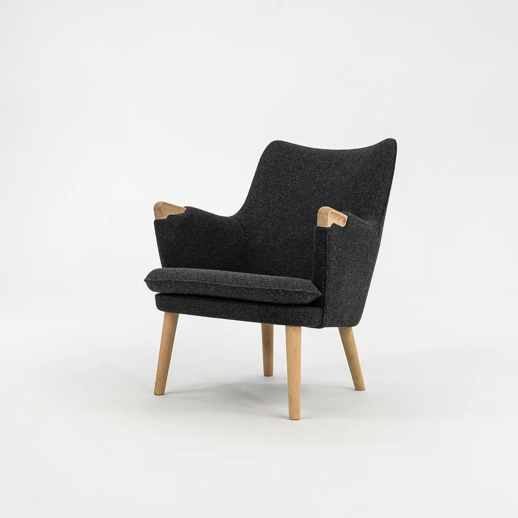 This CH71 Lounge Chair is made with a solid oak frame with grey felted wool fabric. The chair was designed by Hans Wegner and produced by Carl Hansen & Son in Denmark. It dates circa 2021 and guaranteed as authentic. Its in terrific condition and was used only briefly as a display model in a showroom. It comes in its original crate and came directly from Carl Hansen. It may show minimal light wear, but appears to be in superb shape. There is some light wear to the legs, which should clean up nicely too. See photos. The fabric is Divina Melange by Kvadrat in dark grey.