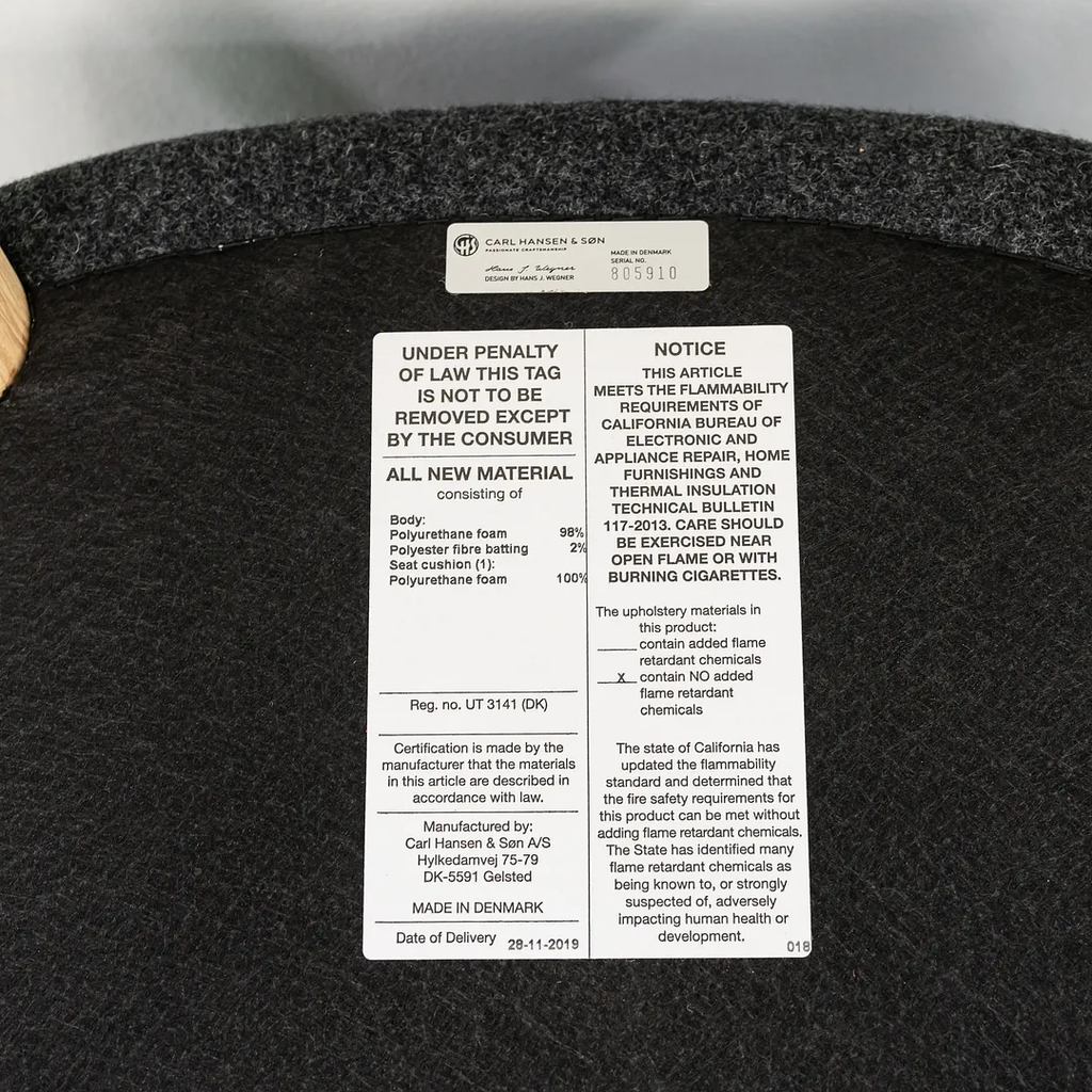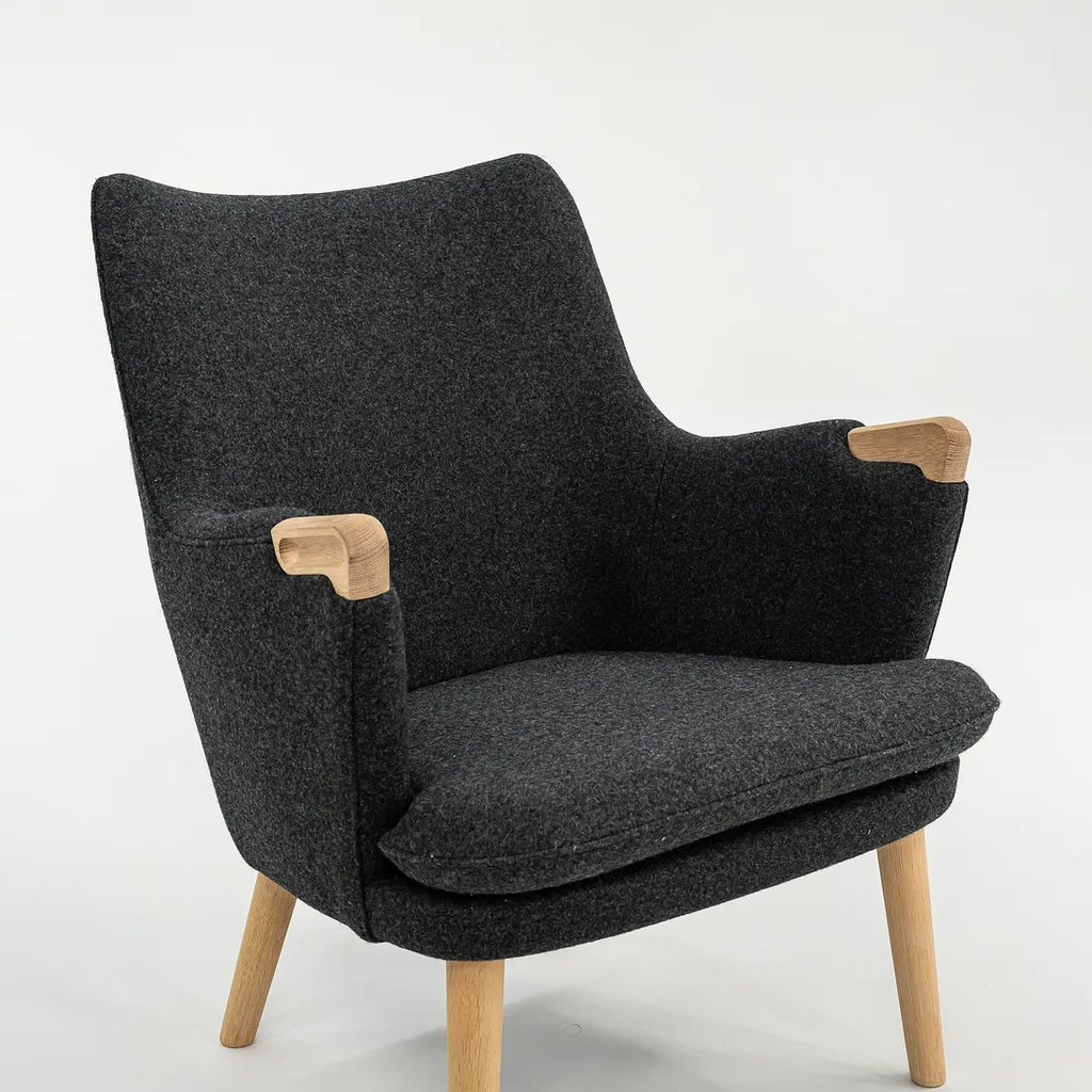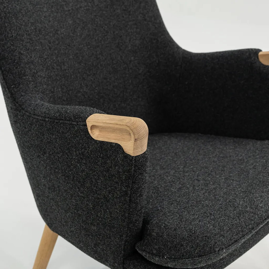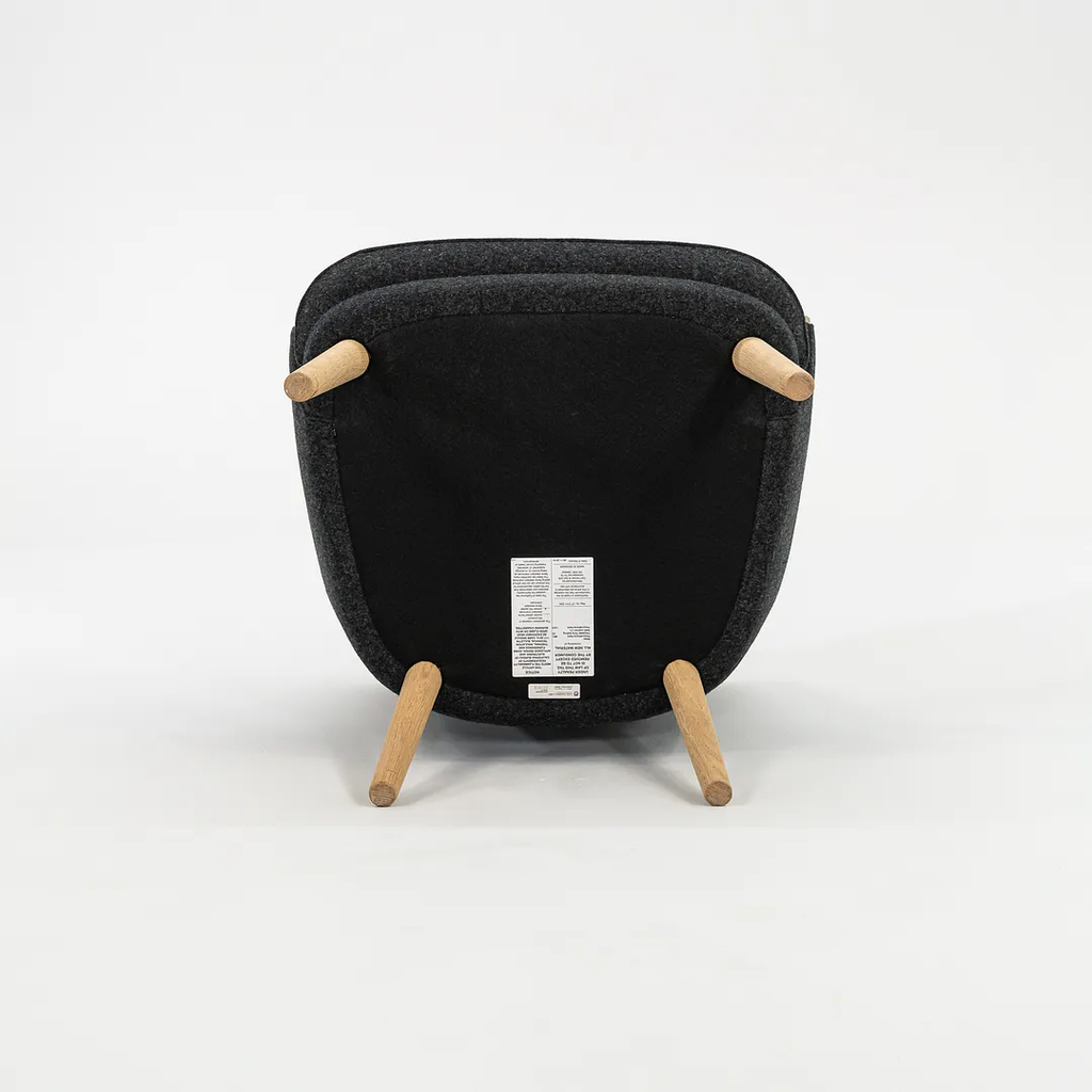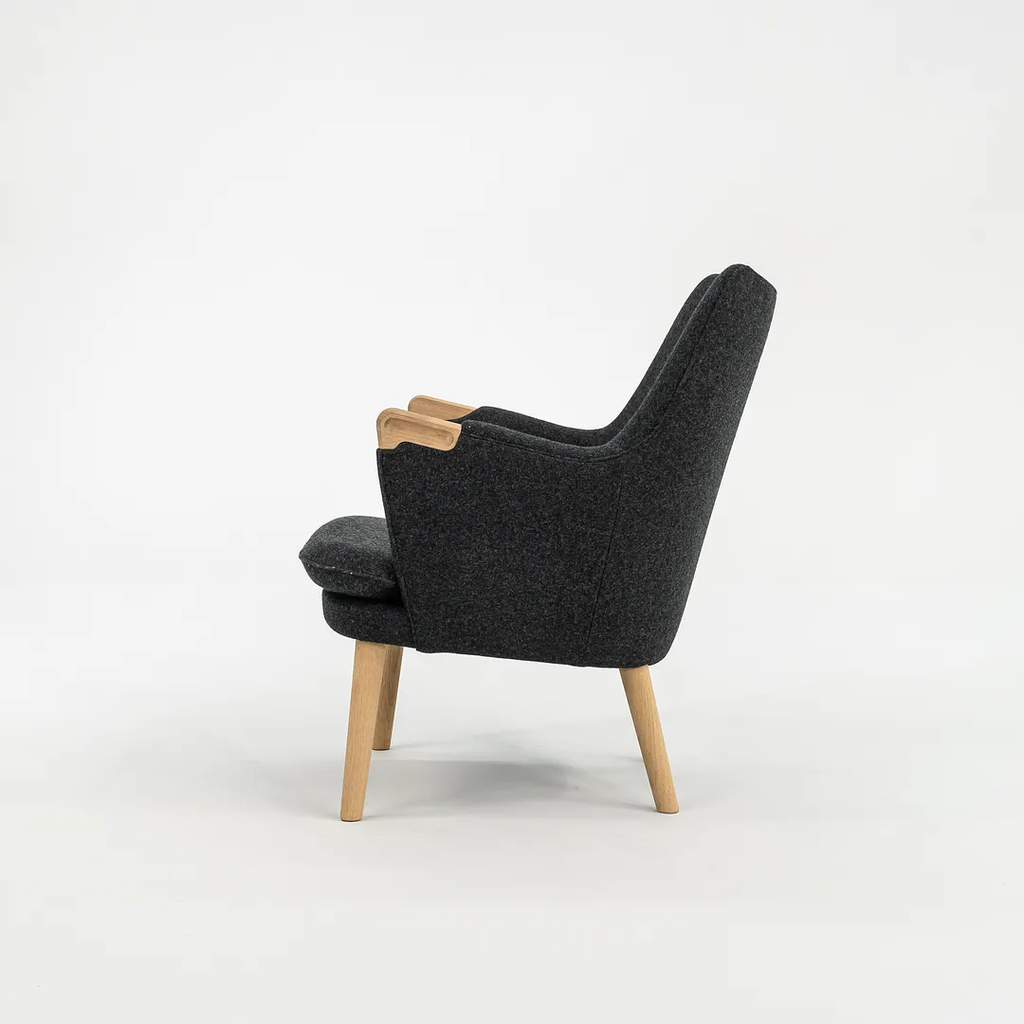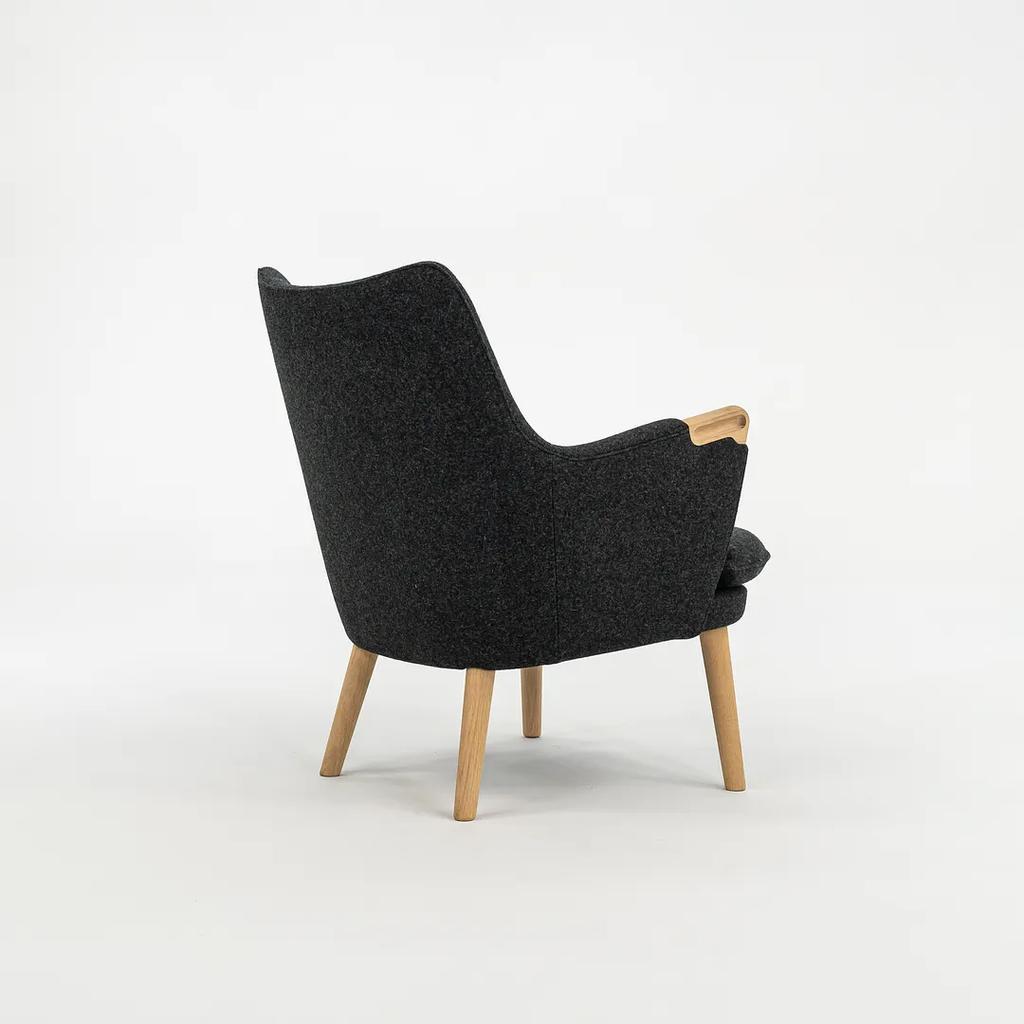 This CH71 Lounge Chair is made with a solid oak frame with grey felted wool fabric. The chair was designed by Hans Wegner and produced by Carl Hansen & Son in Denmark. It dates circa 2021 and guaranteed as authentic. Its in terrific condition and was used only briefly as a display model in a showroom. It comes in its original crate and came directly from Carl Hansen. It may show minimal light wear, but appears to be in superb shape. There is some light wear to the legs, which should clean up nicely too. See photos. The fabric is Divina Melange by Kvadrat in dark grey.