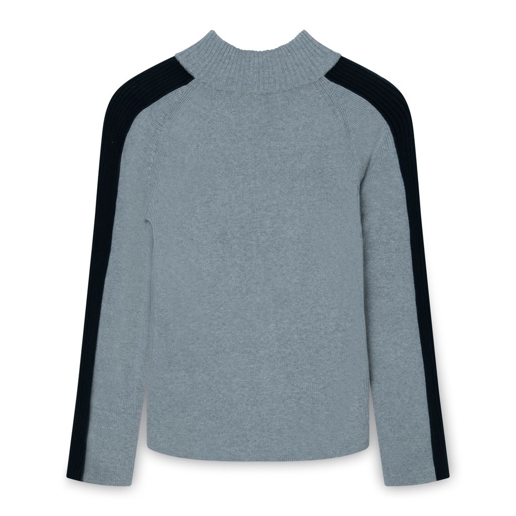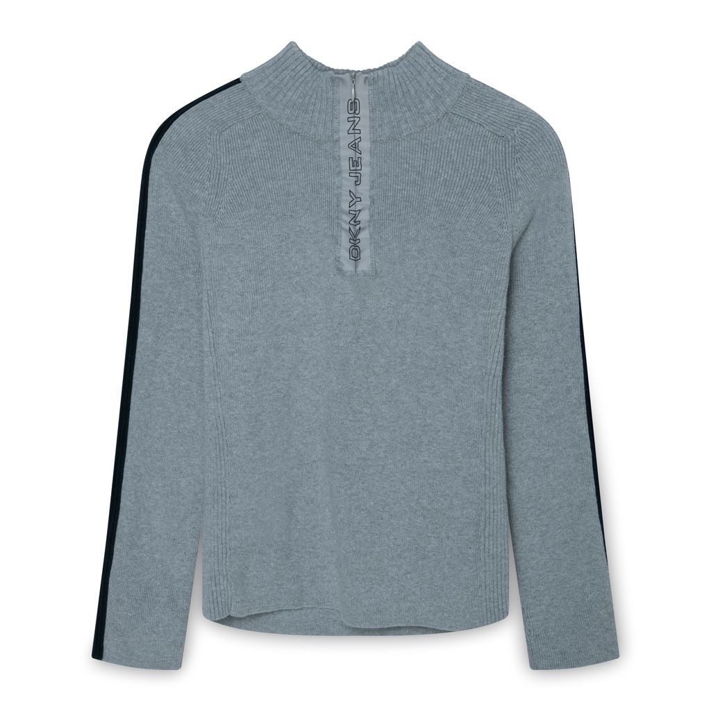 DKNY Grey Quarter Zip features logo on zipper, black stripe down arms, and slight turtleneck.