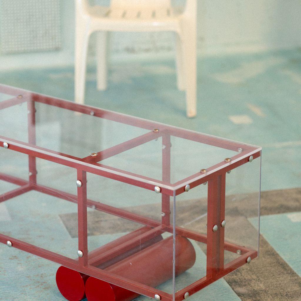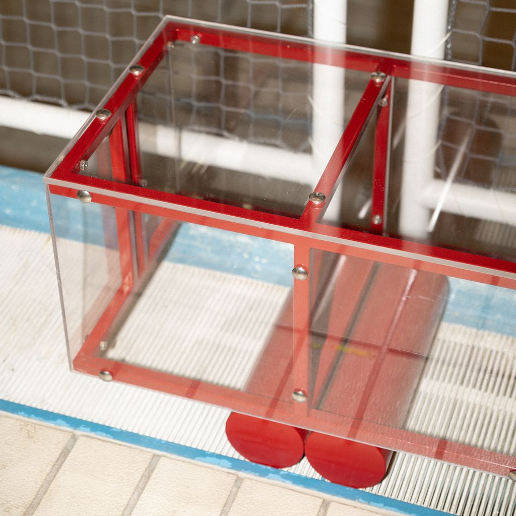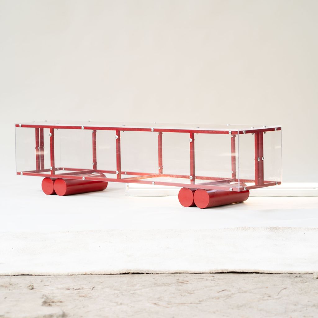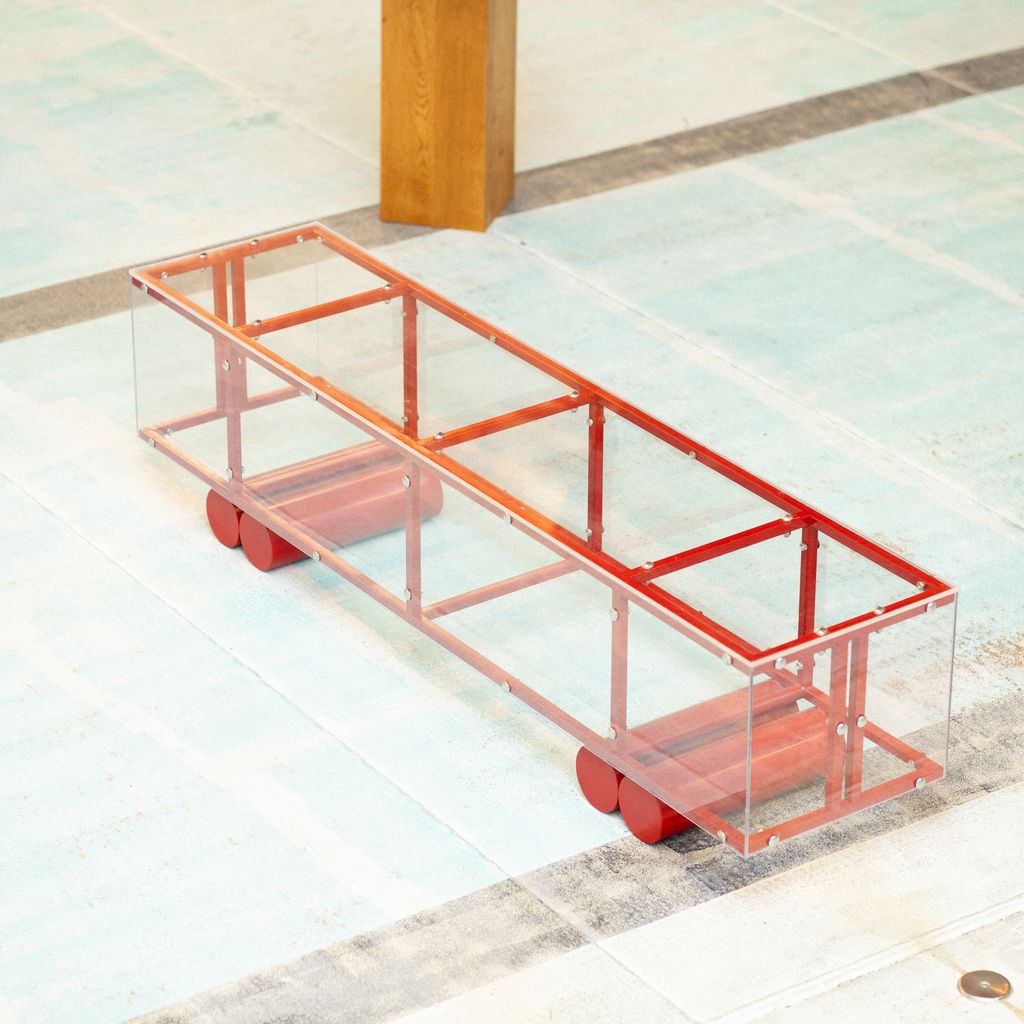 The bench from the S23 series is made of acrylic glass with a lacquered stell structure underneath.