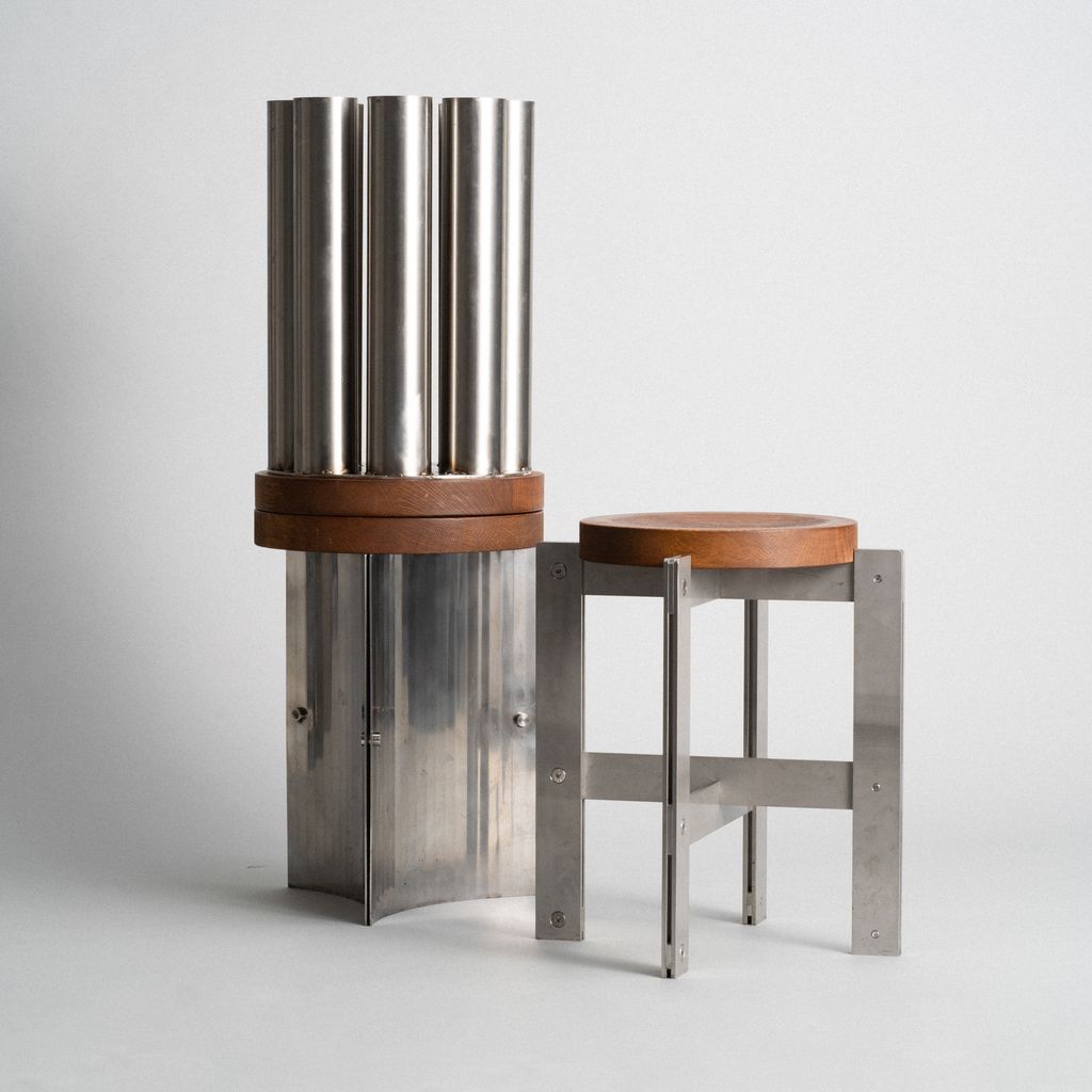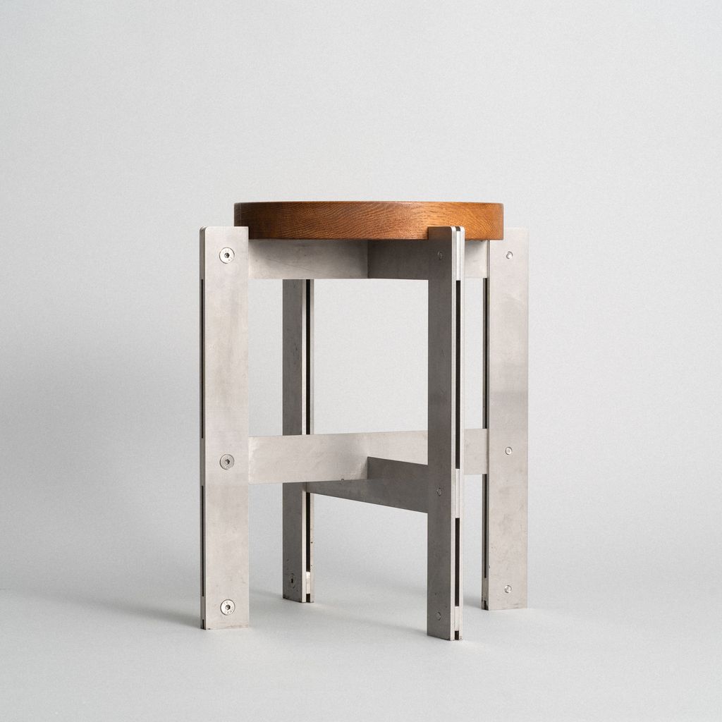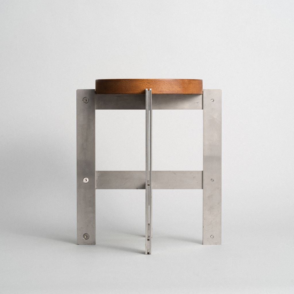 This stool from the S24 series is made of laser-cut stainless steel with stained and oiled oak wood.
